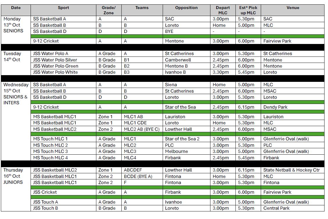 Monday & Wednesday - Seniors; Basketball and Cricket. Note SS has a condensed season and is all completed by Oct29th.