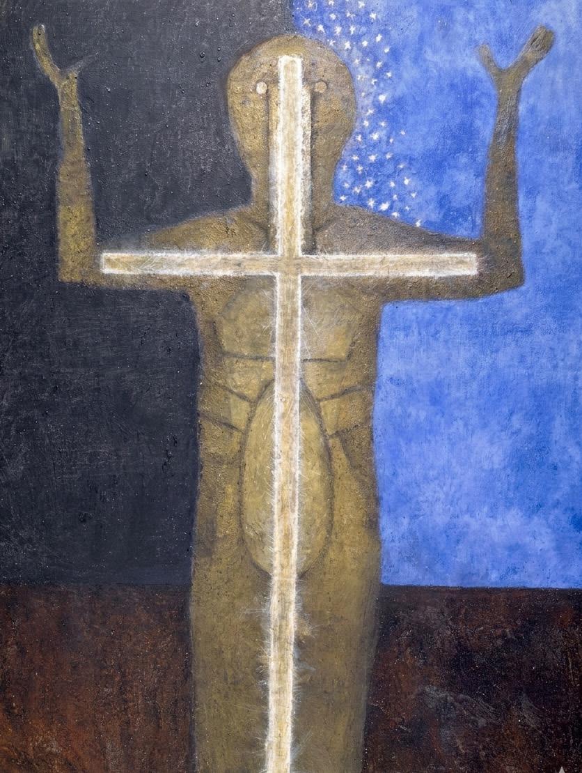 El oaxaqueño representa la figura abstracta de un hombre, parado con los brazos abiertos, sobre un fondo negro y azul, que se fusiona con la cruz. En la obra, el artista busca hacer reflexio- nar a la humanidad sobre la sociedad y la fuerza interior, con trazos que no buscaron seguir el estilo de muralismo político que usaban sus contemporáneos y desarrolló su propio estilo de lenguaje personal influenciado por el expresio- nismo y la herencia prehispánica, estableciendo un vínculo entre la tradición precolombina y la imagen cristiana de la cruz. Invita a las per- sonas a reflexionar sobre lo humano, la espiritualidad y la conexión con el cosmo.