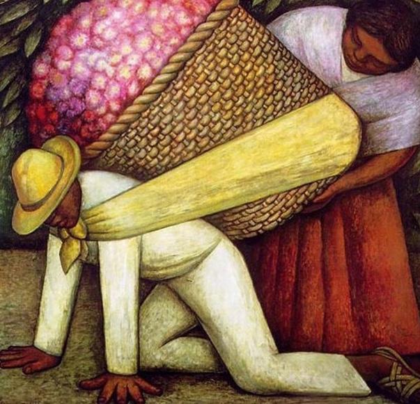 La obra representa a un campesino con una canasta de flores en la espalda, mientras una mujer lo ayuda a levantarse, y en ella el artista buscaba recalcar la dignidad del trabajo manual, la opresión y la desigualdad. Es una de las pocas obras de caballete que mantiene elementos muralistas que consagraron a Rivera a nivel mundial, gra- cias a los colores vivos que inspiran y representan a México.