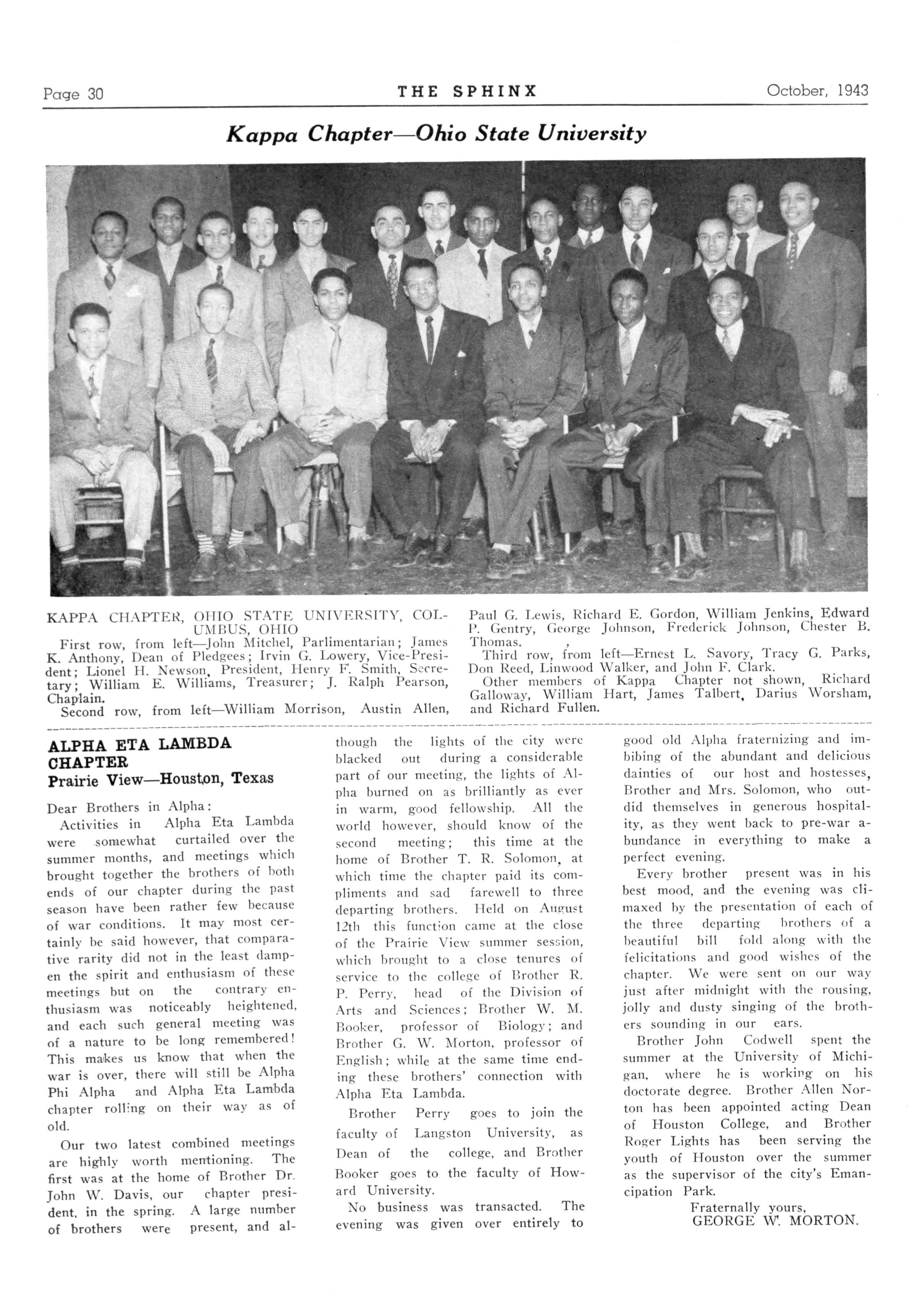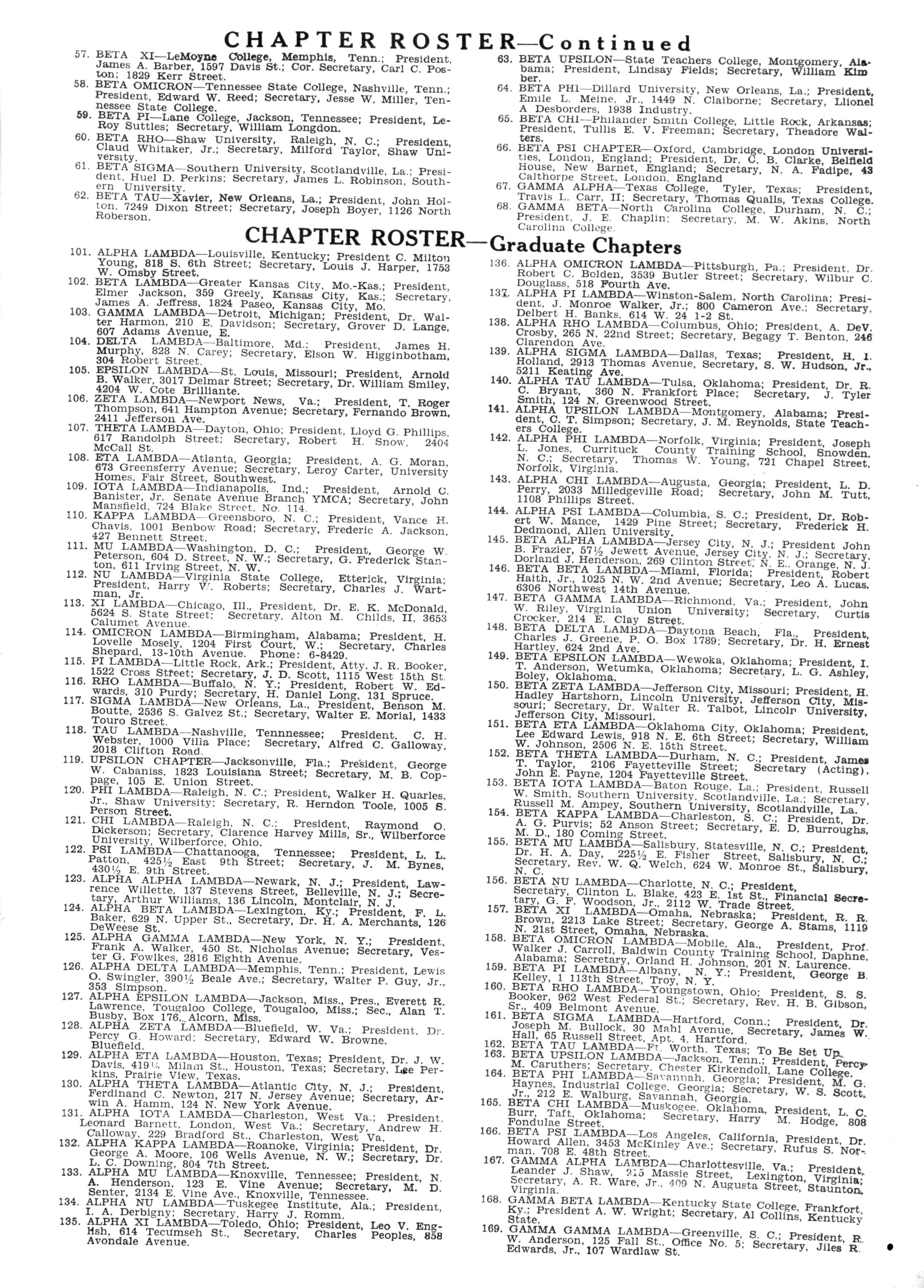 109 IOTA LAMBDA—Indianapolis, Ind.; President, Arnold C Banister Jr Senate Avenue Branch YMCA; Secretary John Mansfield 724 Blake Street No 114
