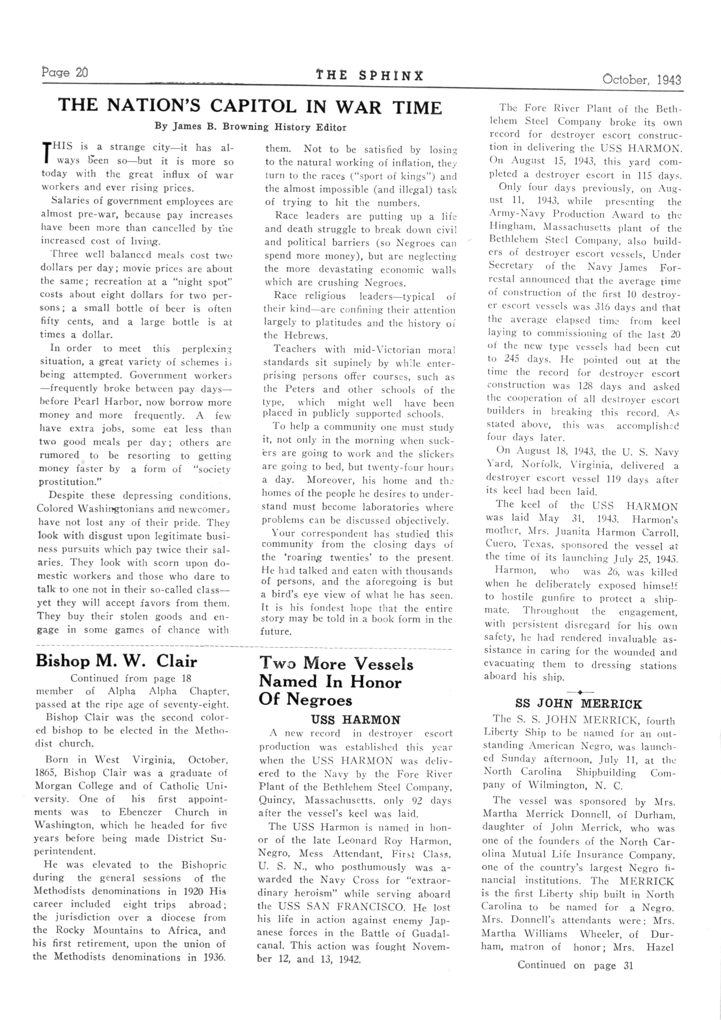 meeting at the Central Baptist church devoted to discussions of national defense and post-war security Both the Governor and Dr Spaulding spoke at the church meeting, along with Mayor B. B. Cameron of Wilmington. At this meeting, Dr Spaulding pleaded for racial harmony and urged Negroes to invest in war bonds