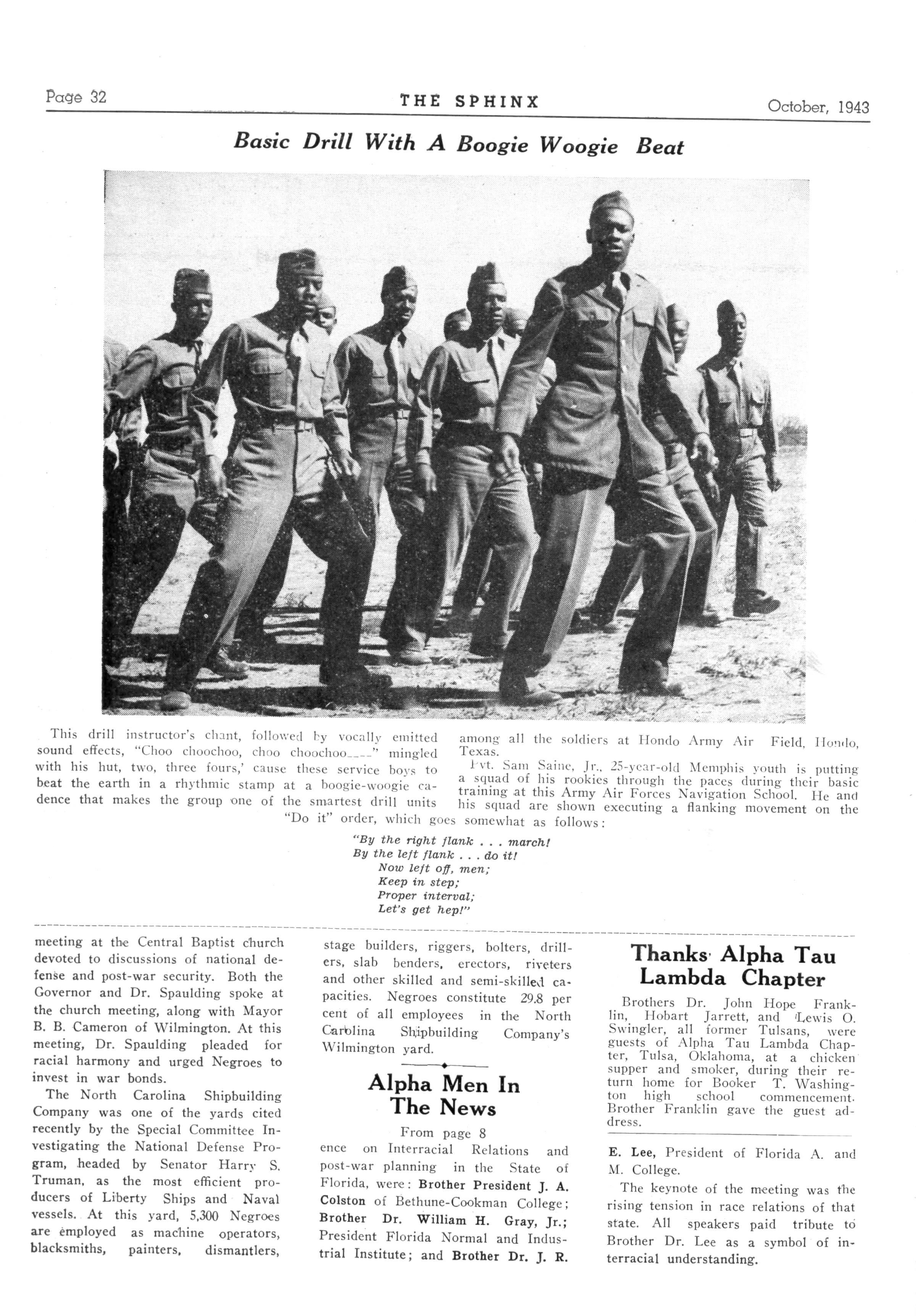 1vt Sam Saine, Jr. 25-year-old Memphis youth is putting a squad of his rookies through the paces during their basic training at this Army Air Forces Navigation School He and his squad are shown executing a flanking movement on the