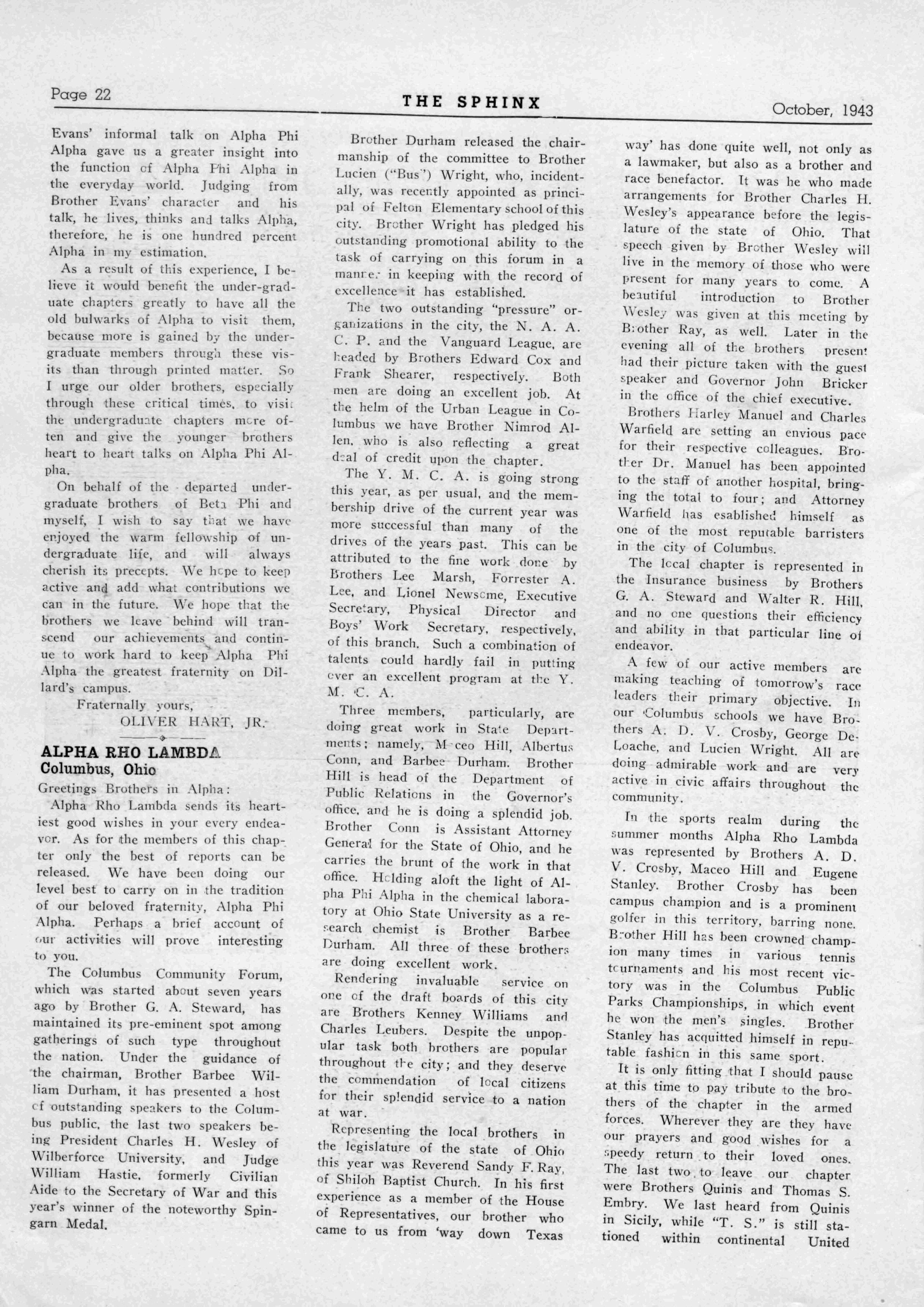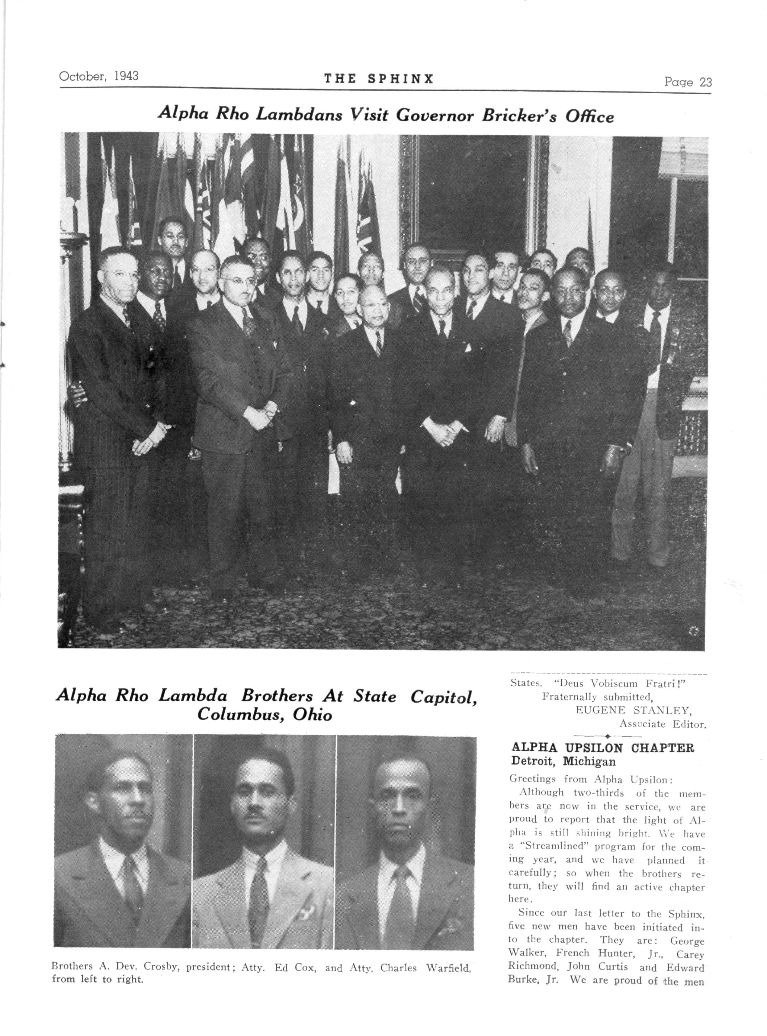138 ALPHA RHO LAMBDA—Columbus, Ohio; President A DeV Crosby 265N 22nd Street; Secretary, Begagy T Benton 248 oiarenaon Ave