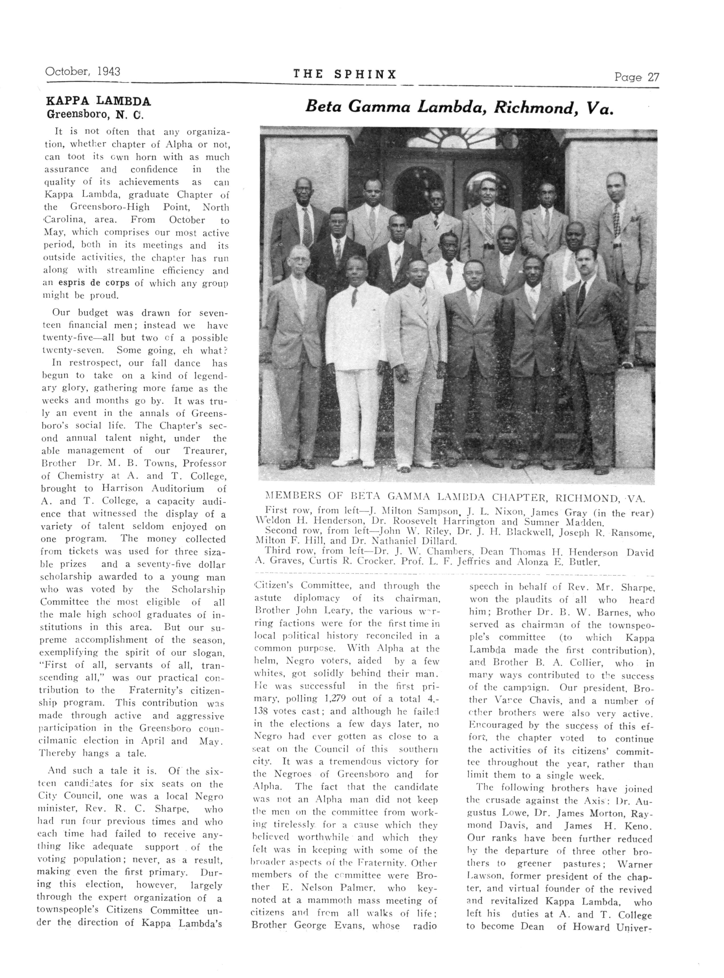 110 KAPPA LAMBDA—Greensboro, N C; President, Vance H Chavis 1001 Benbow Road; Secretary, Frederic A Jackson 427 Bennett Street