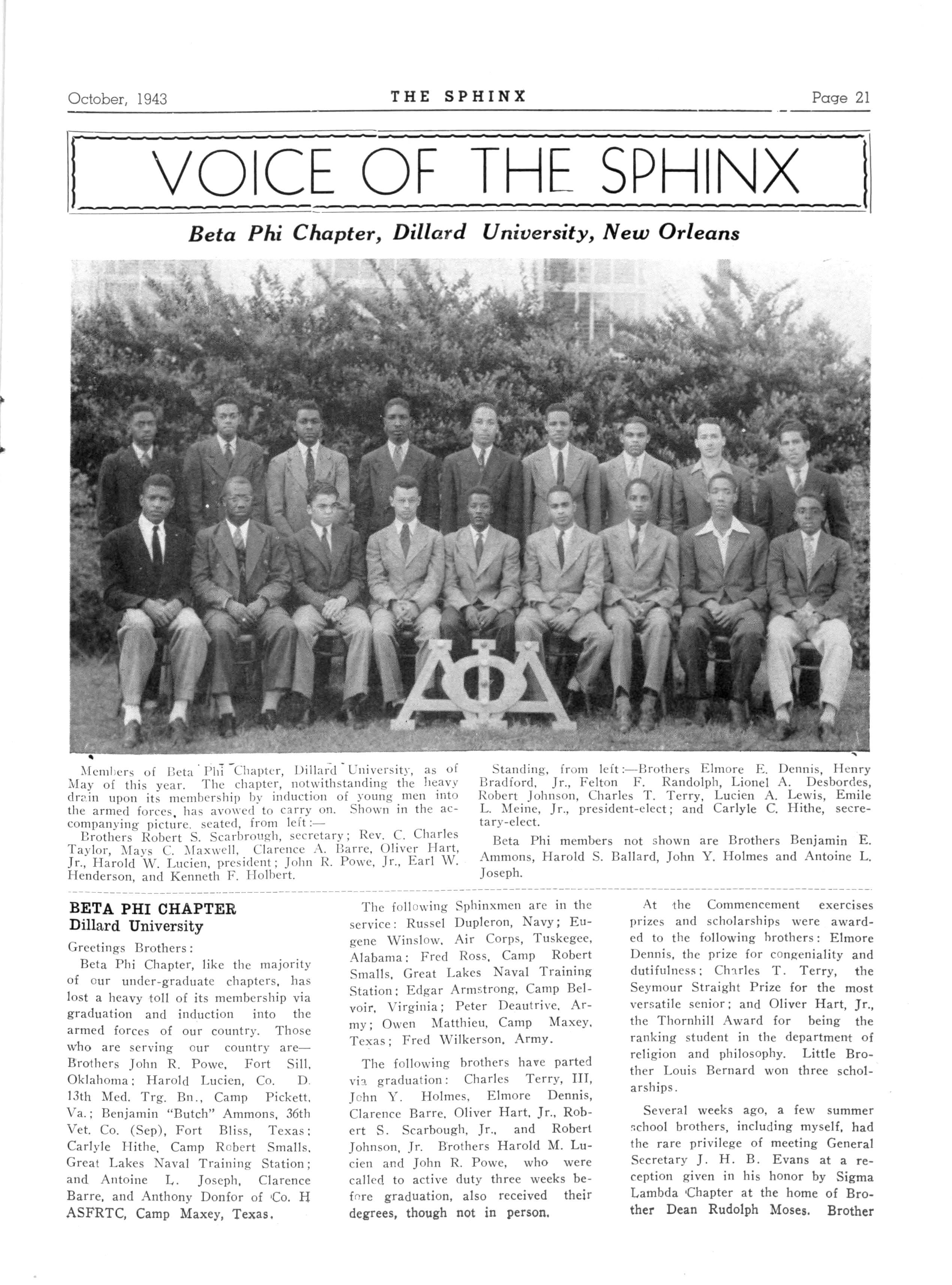 64 BETA PHI—Dillard University, New Orleans, La.; President Emile L Meine Jr., 1449 N Claiborne; Secretary, Llionel A Desborders, 1938 Industry