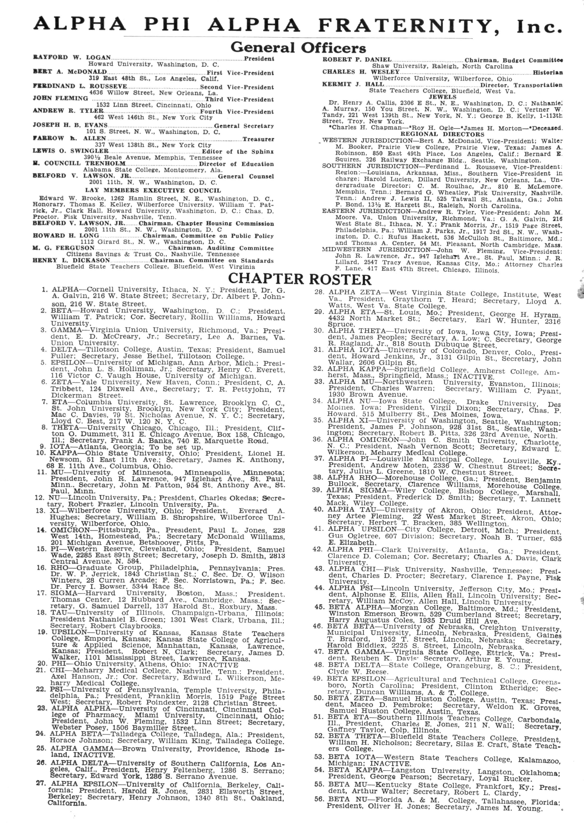 ALPHA CHI—Fisk University, Nashville, Tennessee- President, Charles D Procter; Secretary, Clarence I Pavne Fisk University