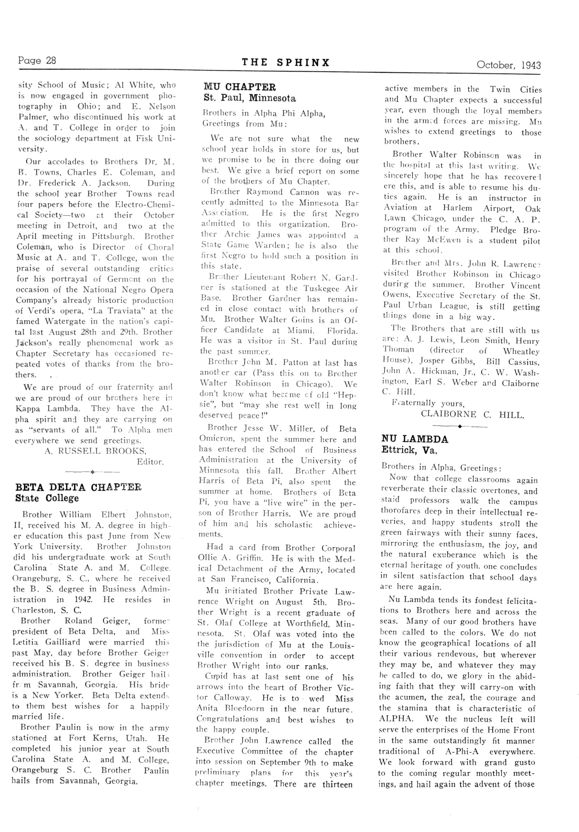 112 NU LAMBDA—Virginia State College, Etterlck, Virginia- President, Harry V. Roberts; Secretary, Charles J Wart in tin, jr