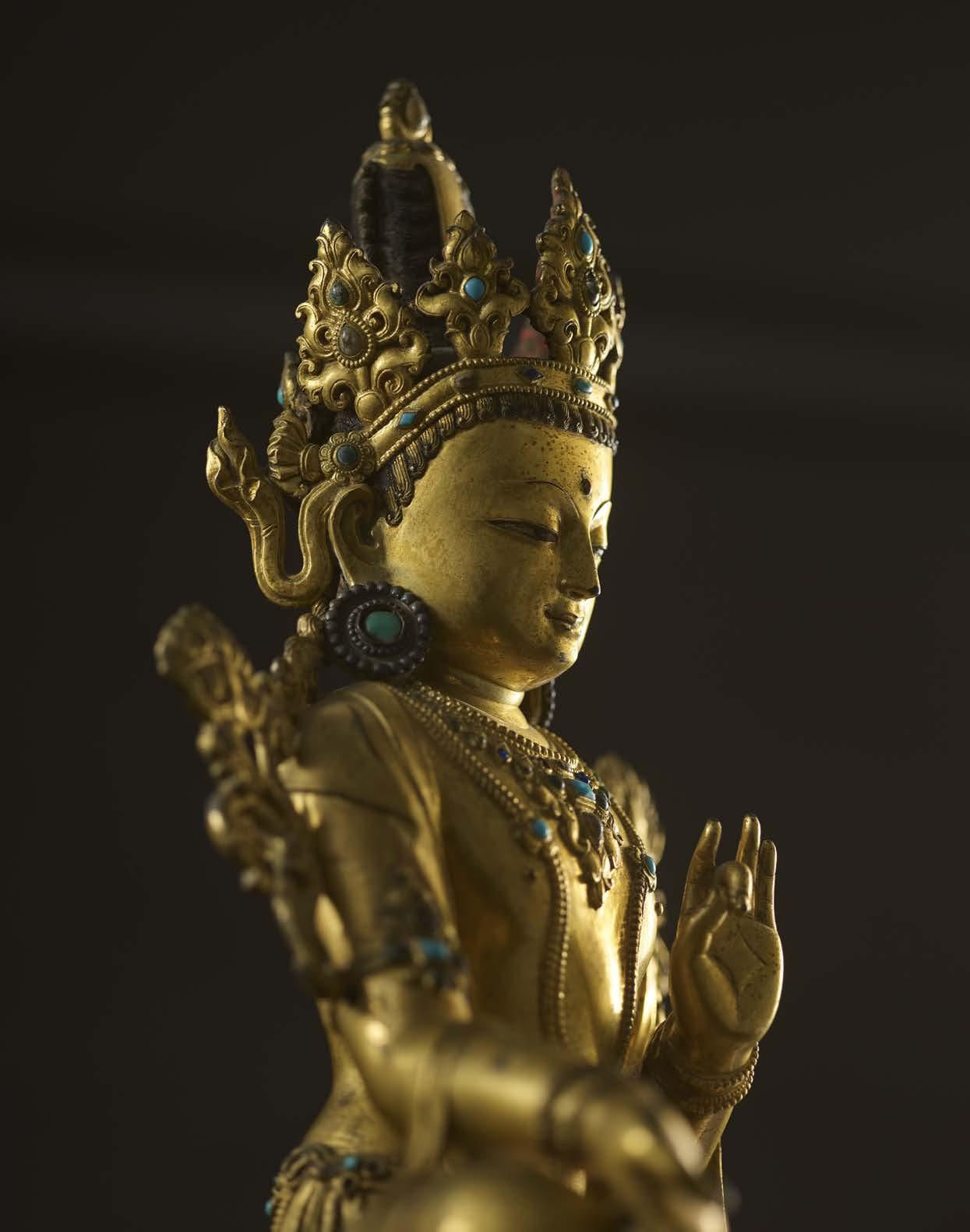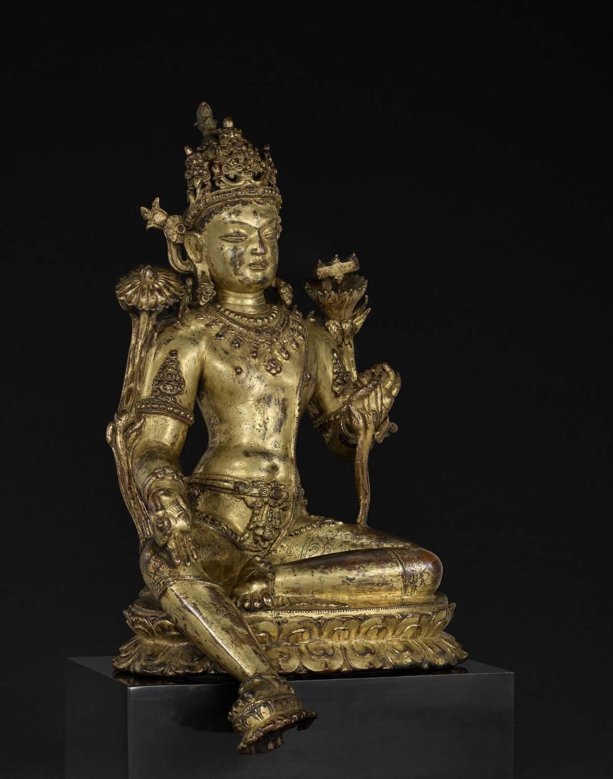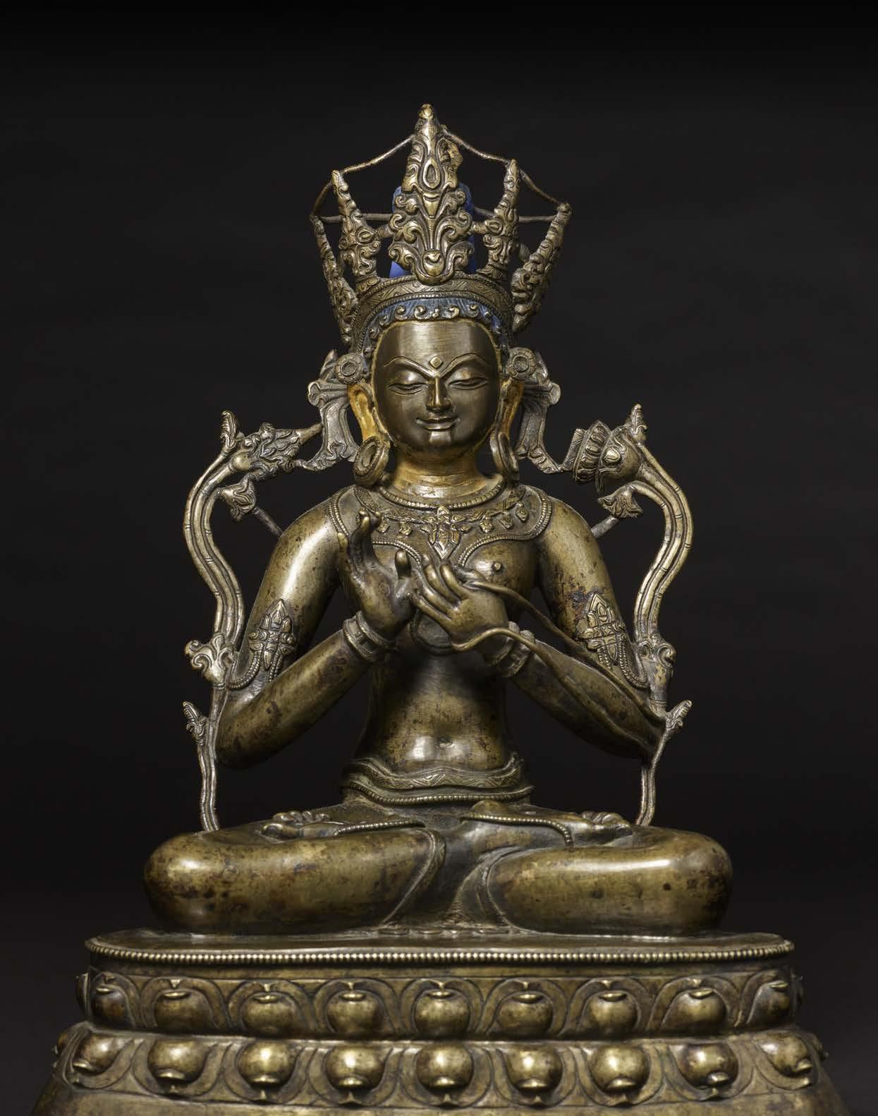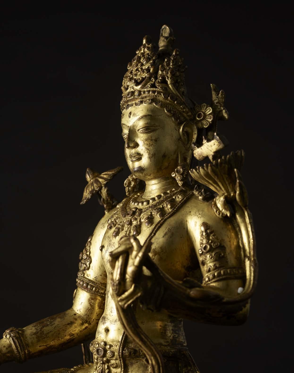 A close parallel can be found in a bronze Avalokiteshvara preserved in the Tsuglakhang Temple, Lhasa (von Schroeder, Buddhist Sculpture in Tibet, Vol. I, Hong Kong, 2022, p. 168, no. 48A). That figure, of comparable scale, shares a distinctive base of split lotus petals, a looped halo, and the same robust treatment of scarves and jewellery, suggesting both were produced in the same atelier, possibly even by the same hand. Furthermore, the unique triangular crown motif is repeated in other contemporaneous bronzes, including a six-armed deity and another figure of Manjushri (ibid., pp. 170 and 173, nos. 49A and 50D).
