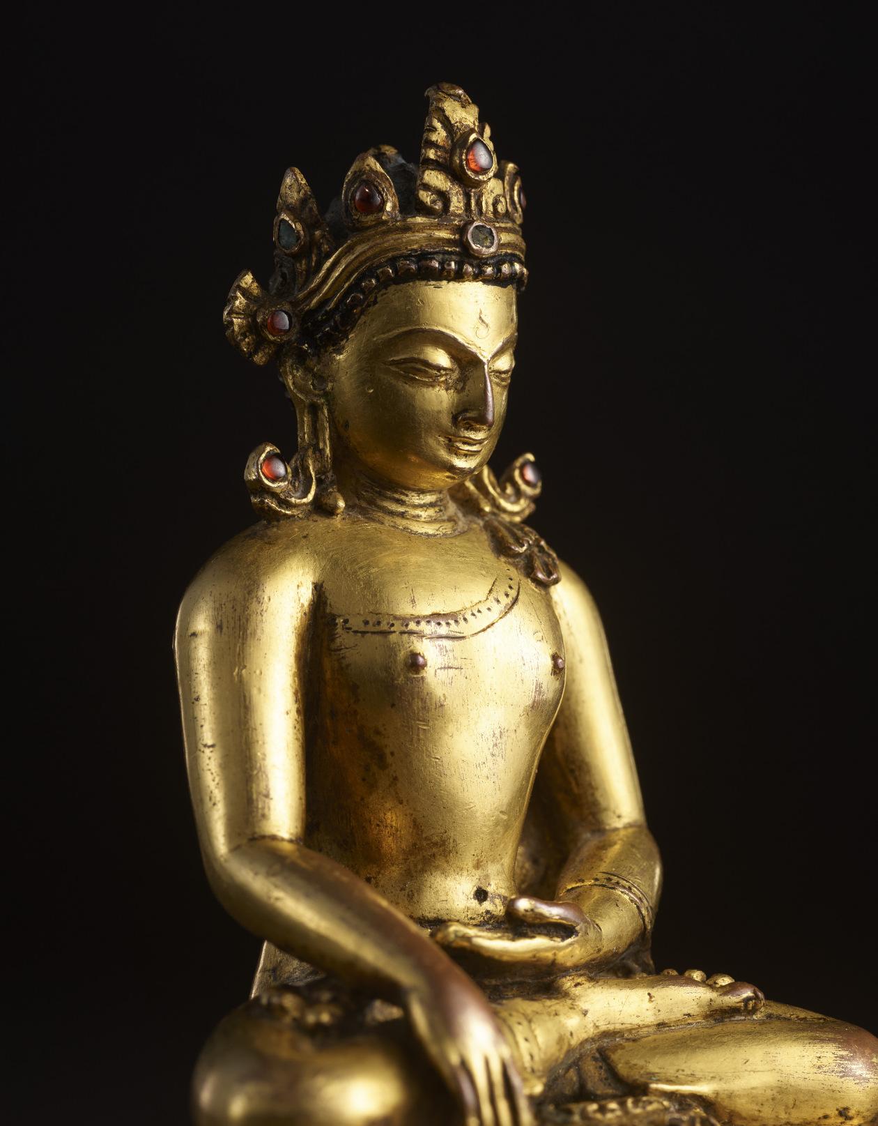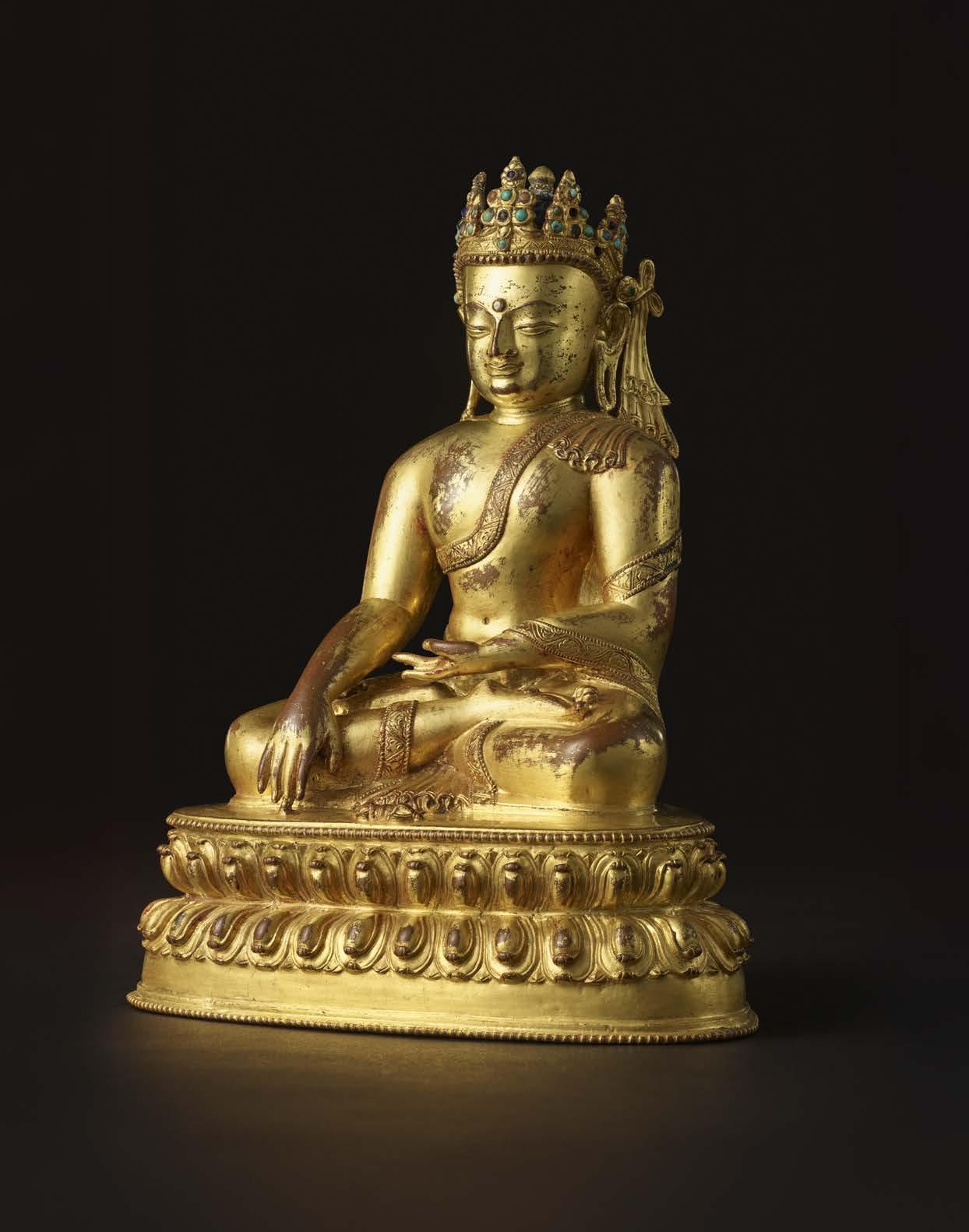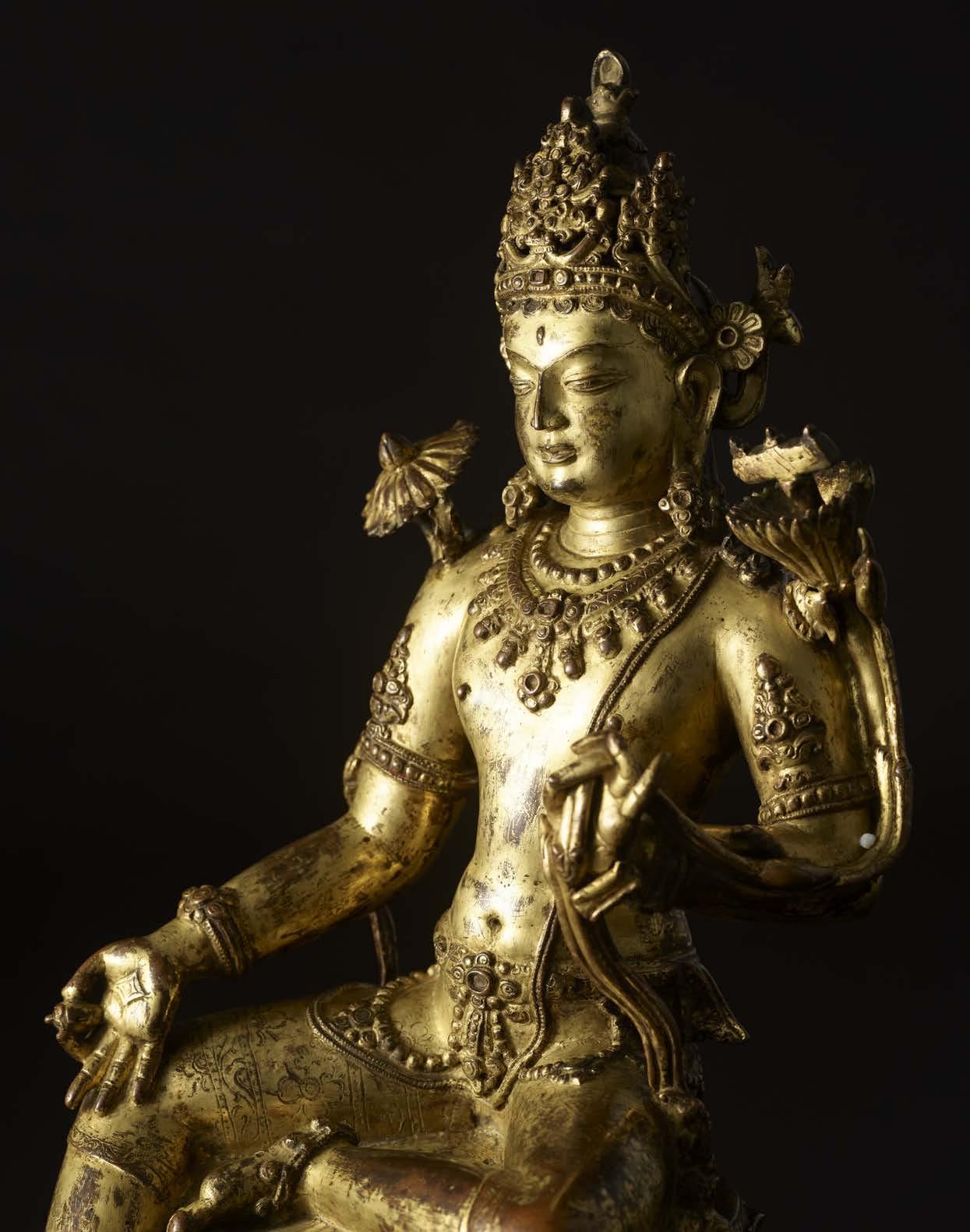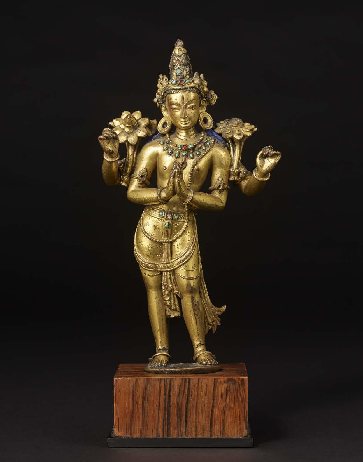 A close parallel can be found in a bronze Avalokiteshvara preserved in the Tsuglakhang Temple, Lhasa (von Schroeder, Buddhist Sculpture in Tibet, Vol. I, Hong Kong, 2022, p. 168, no. 48A). That figure, of comparable scale, shares a distinctive base of split lotus petals, a looped halo, and the same robust treatment of scarves and jewellery, suggesting both were produced in the same atelier, possibly even by the same hand. Furthermore, the unique triangular crown motif is repeated in other contemporaneous bronzes, including a six-armed deity and another figure of Manjushri (ibid., pp. 170 and 173, nos. 49A and 50D).