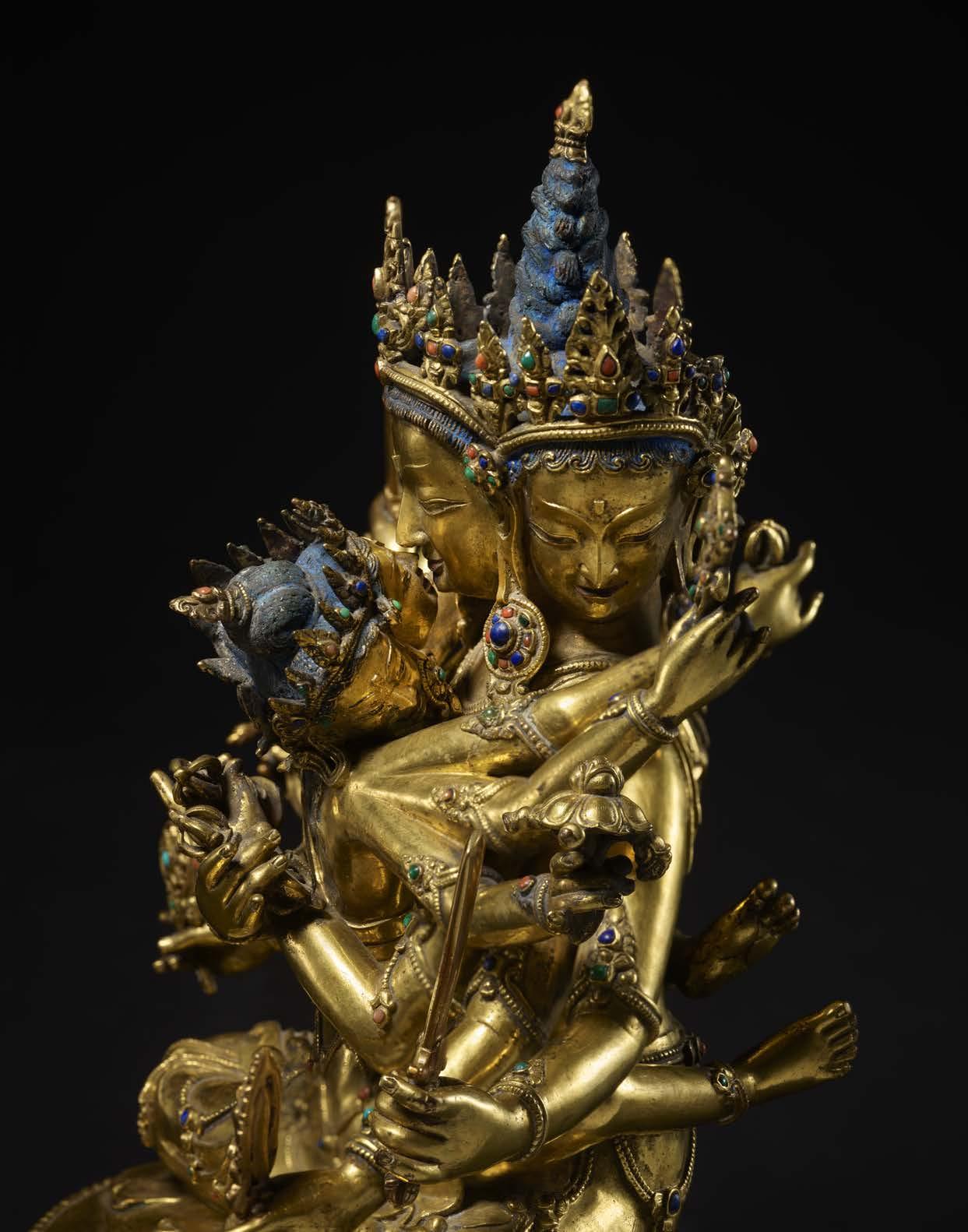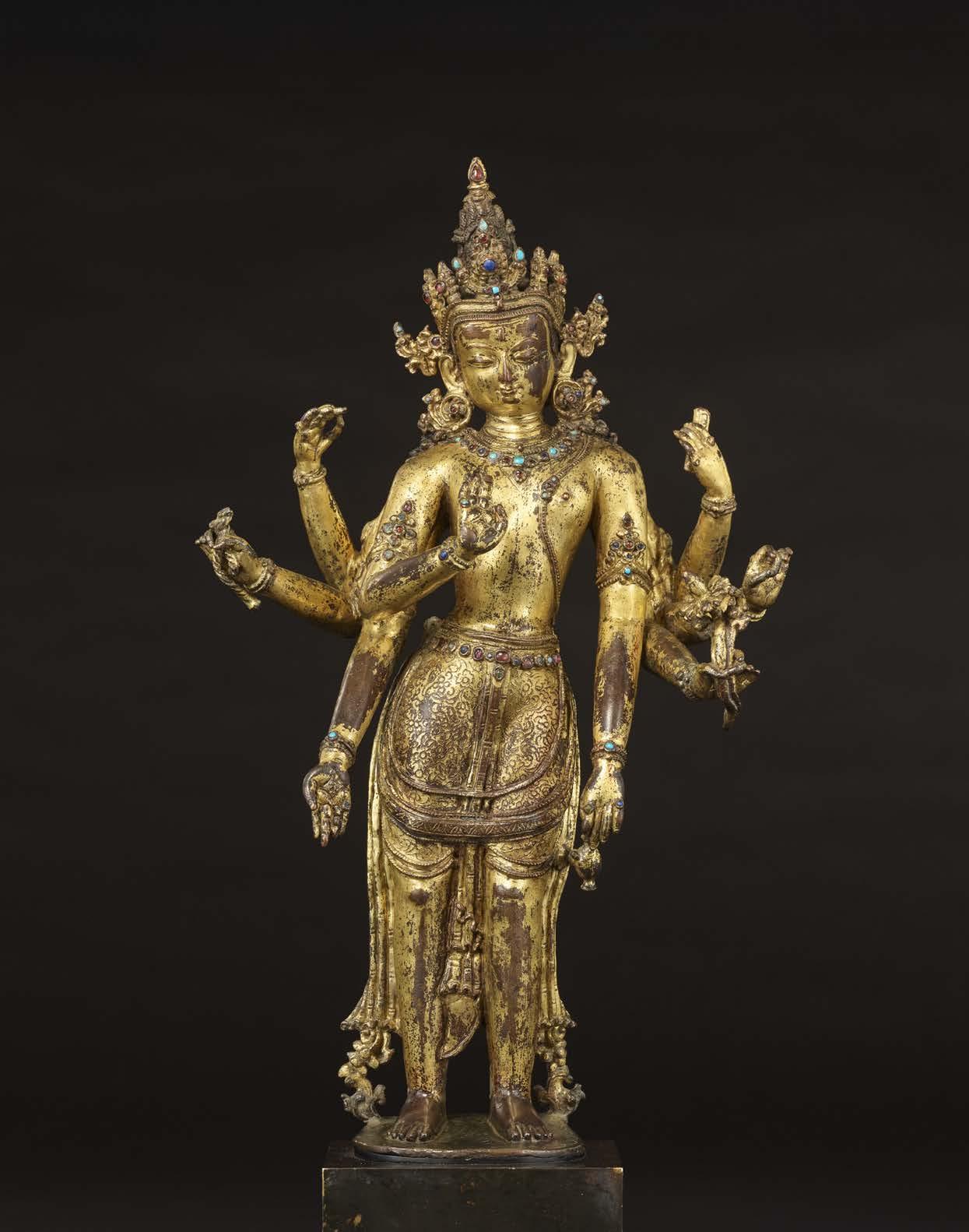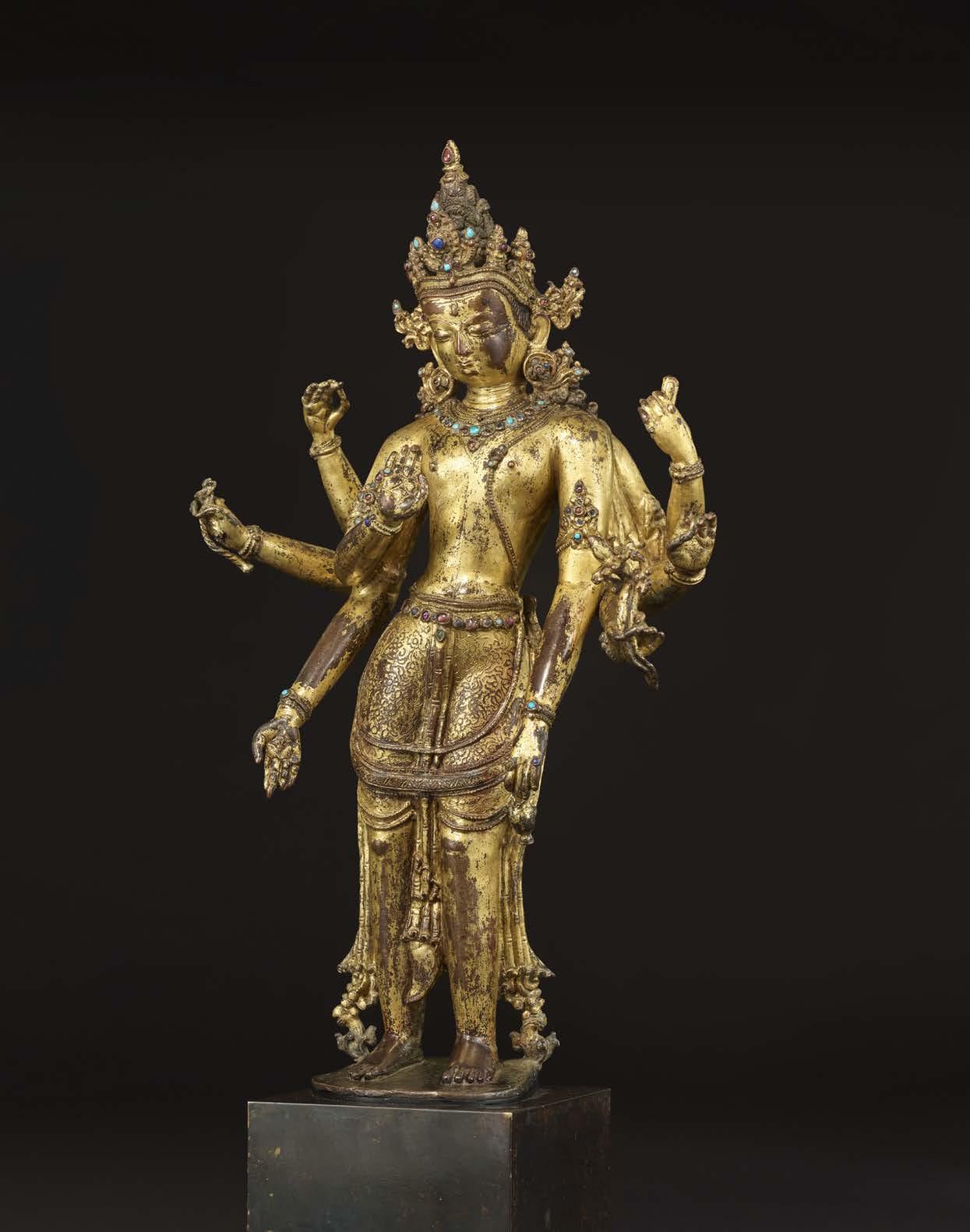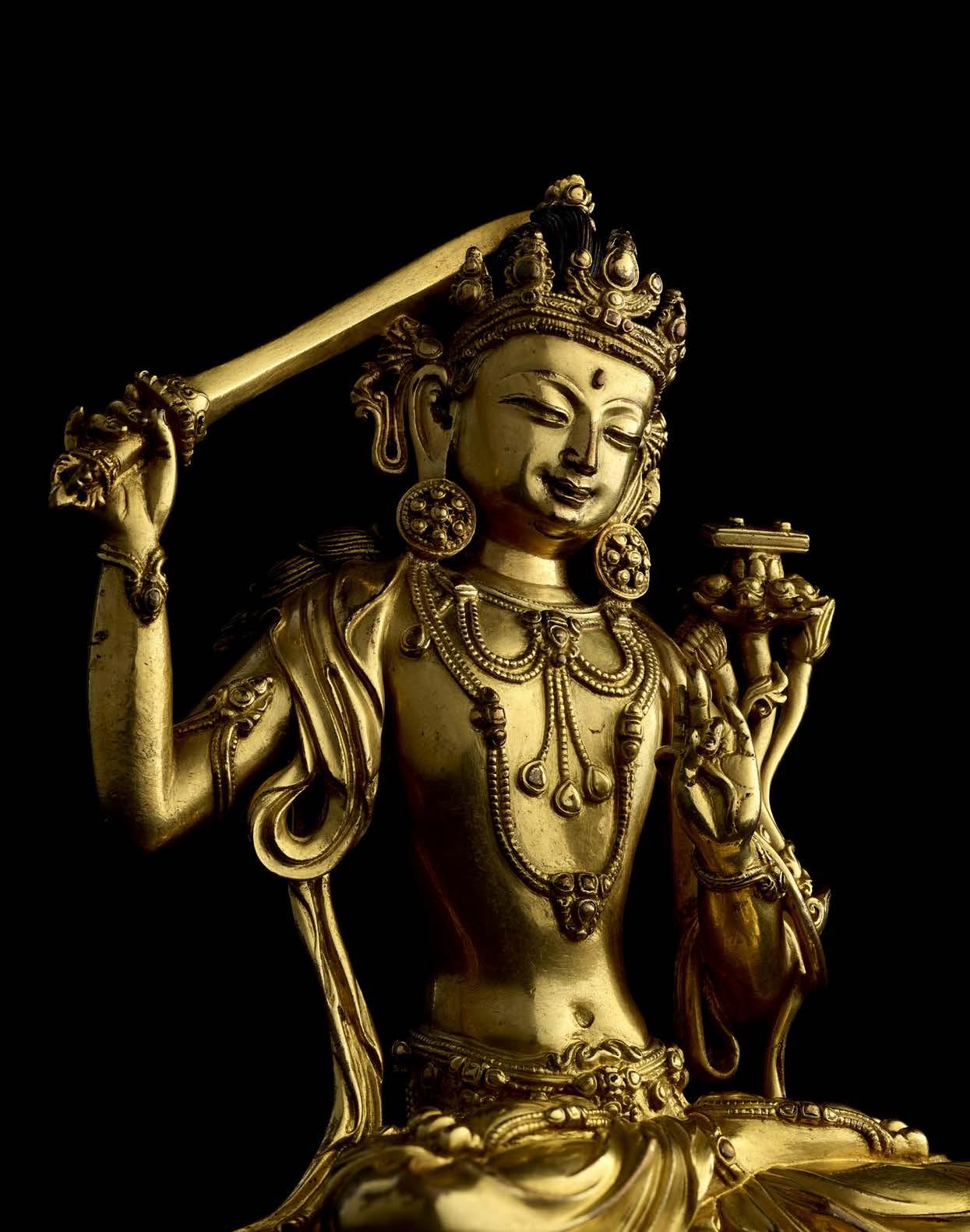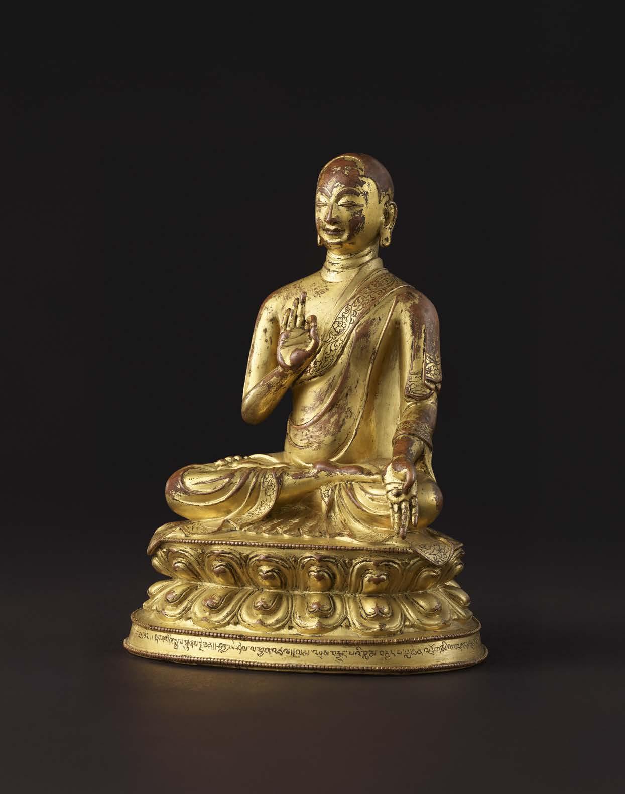A close parallel can be found in a bronze Avalokiteshvara preserved in the Tsuglakhang Temple, Lhasa (von Schroeder, Buddhist Sculpture in Tibet, Vol. I, Hong Kong, 2022, p. 168, no. 48A). That figure, of comparable scale, shares a distinctive base of split lotus petals, a looped halo, and the same robust treatment of scarves and jewellery, suggesting both were produced in the same atelier, possibly even by the same hand. Furthermore, the unique triangular crown motif is repeated in other contemporaneous bronzes, including a six-armed deity and another figure of Manjushri (ibid., pp. 170 and 173, nos. 49A and 50D).