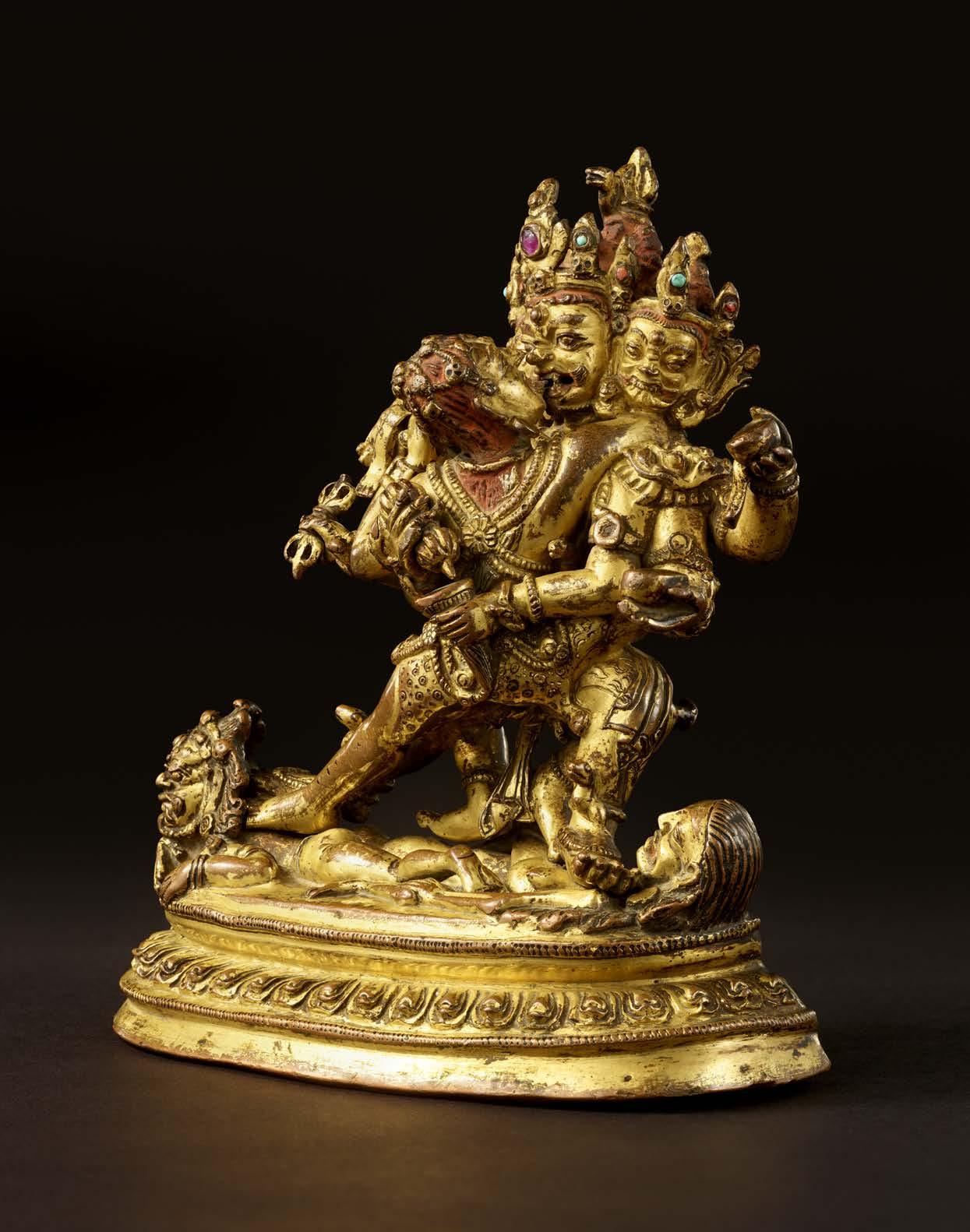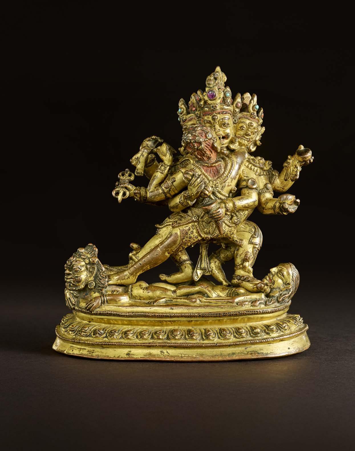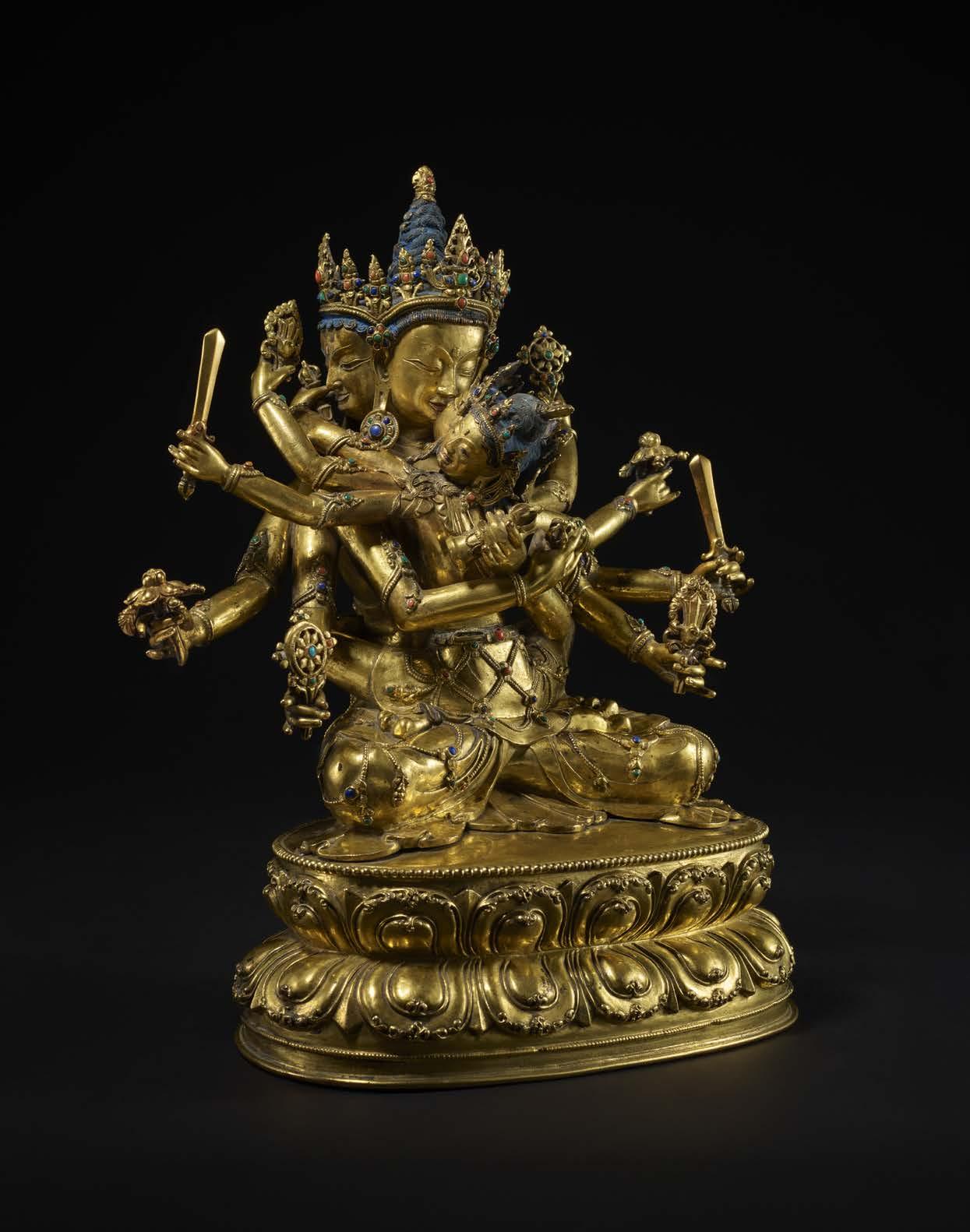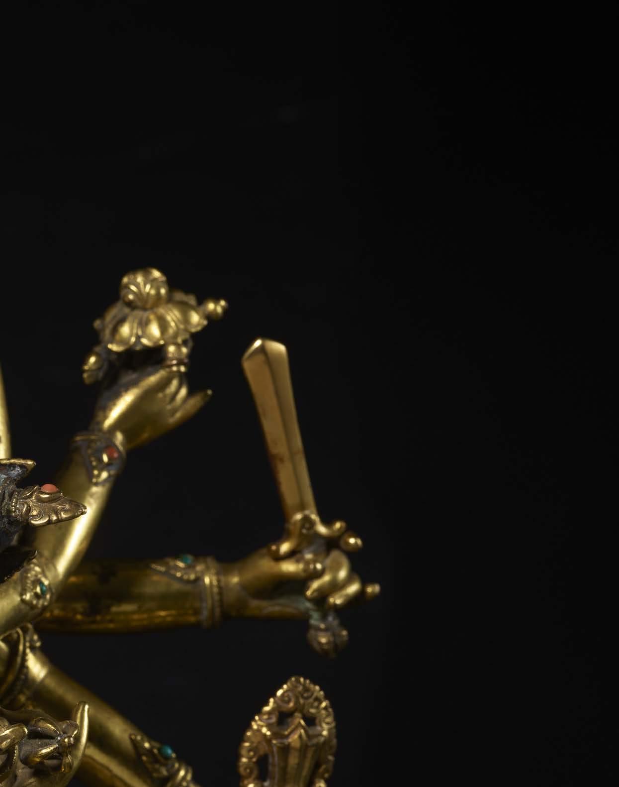 A close parallel can be found in a bronze Avalokiteshvara preserved in the Tsuglakhang Temple, Lhasa (von Schroeder, Buddhist Sculpture in Tibet, Vol. I, Hong Kong, 2022, p. 168, no. 48A). That figure, of comparable scale, shares a distinctive base of split lotus petals, a looped halo, and the same robust treatment of scarves and jewellery, suggesting both were produced in the same atelier, possibly even by the same hand. Furthermore, the unique triangular crown motif is repeated in other contemporaneous bronzes, including a six-armed deity and another figure of Manjushri (ibid., pp. 170 and 173, nos. 49A and 50D).