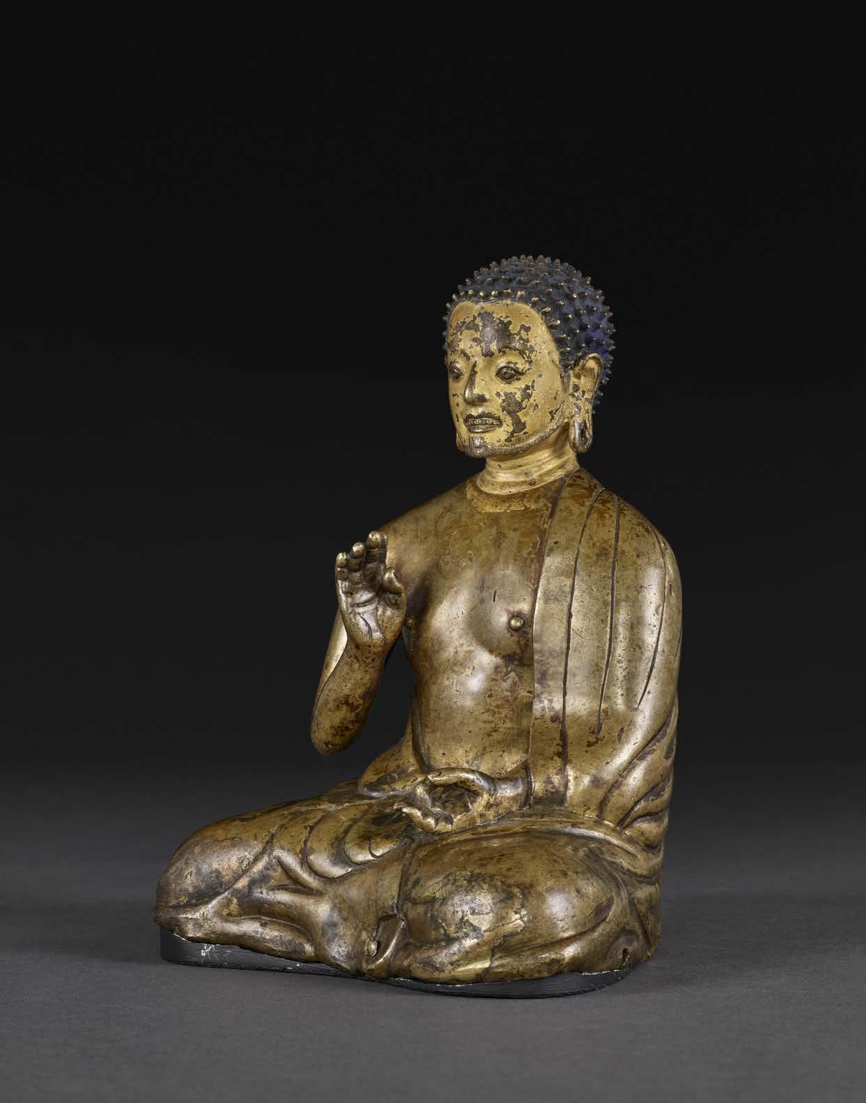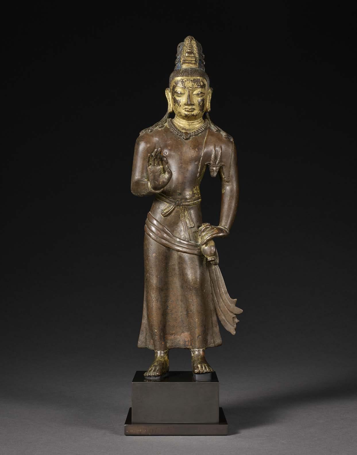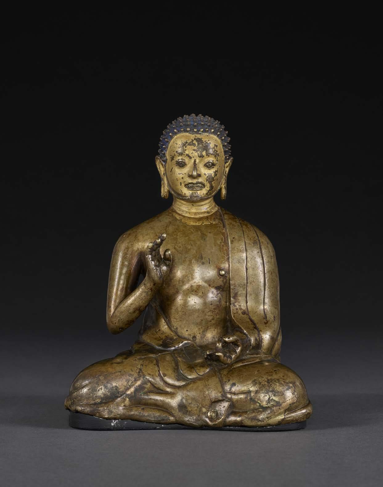 Further examples of Kashmiri Buddha with smooth robes and silverinlaid features dated to the 8th-century can be found in Los Angeles County Museum of Art (acc. no. M.72.2.1), see Pal, Indian Sculpture, Vol. 1, 1986, p. 226, no. 100 and another with similar facial modeling and the distinctive ‘W’ form lips in Cleveland Museum of Art (acc. no. 1981.10), see Pal, The Arts of Kashmir, New York, 2008, fig. 25 is also dated circa 8th century. Also compare a Buddha in The British Museum with similar treatment of the robe and ushnisha (inv. 1905,0612.5), see Zwalf, Buddhism: Art and Faith, London, 1985, no. 146. Also, compare with the three other closely related examples in von Schroeder, IndoTibetan Bronzes, 1981, no. 14A, C, and D.