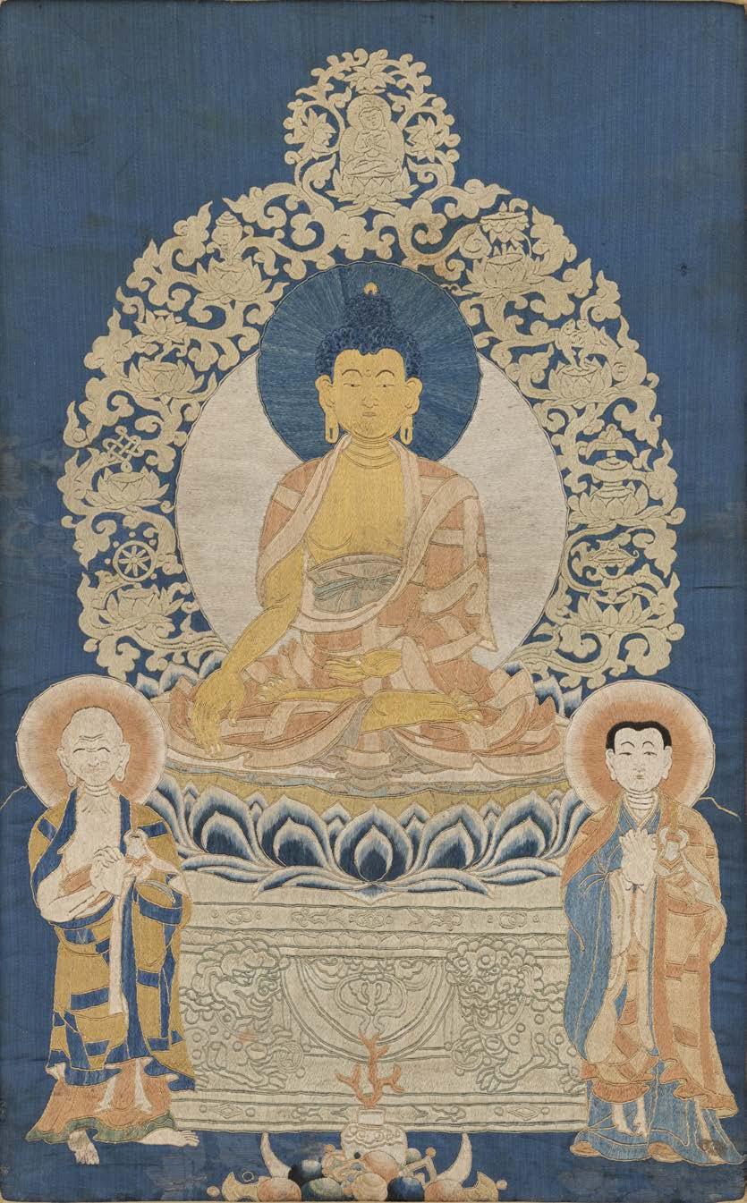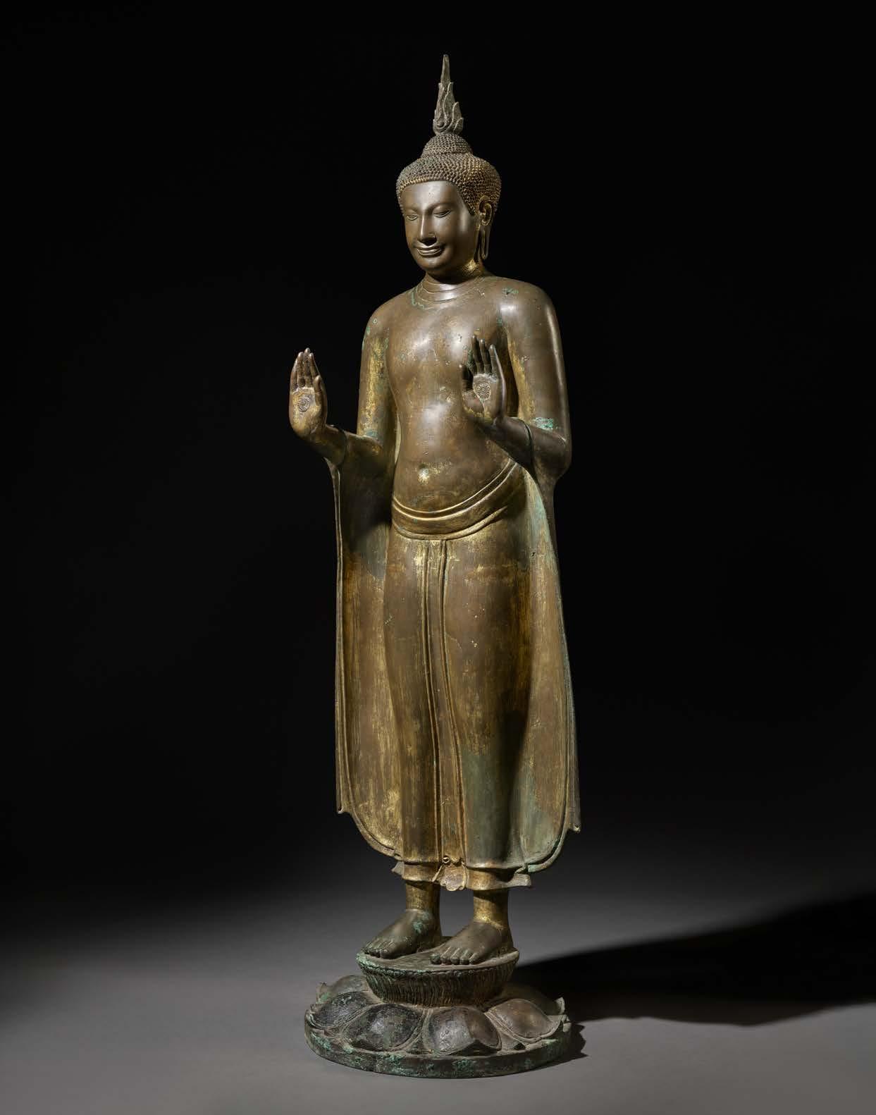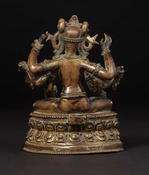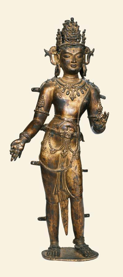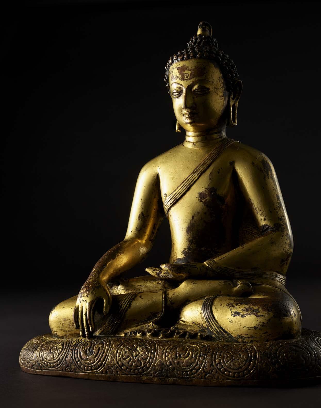 Further examples of Kashmiri Buddha with smooth robes and silverinlaid features dated to the 8th-century can be found in Los Angeles County Museum of Art (acc. no. M.72.2.1), see Pal, Indian Sculpture, Vol. 1, 1986, p. 226, no. 100 and another with similar facial modeling and the distinctive ‘W’ form lips in Cleveland Museum of Art (acc. no. 1981.10), see Pal, The Arts of Kashmir, New York, 2008, fig. 25 is also dated circa 8th century. Also compare a Buddha in The British Museum with similar treatment of the robe and ushnisha (inv. 1905,0612.5), see Zwalf, Buddhism: Art and Faith, London, 1985, no. 146. Also, compare with the three other closely related examples in von Schroeder, IndoTibetan Bronzes, 1981, no. 14A, C, and D.