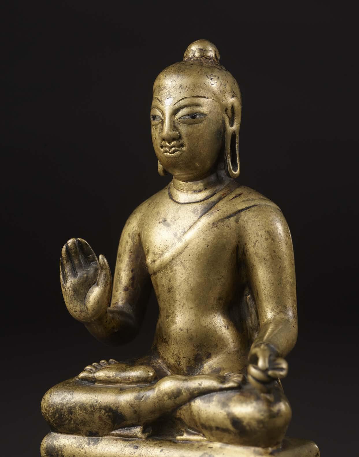 This finely cast Buddha, inlaid with silver at the eyes and urna, exemplifies the sophisticated elegance of early Kashmiri metal sculpture during the 7th and 8th century.