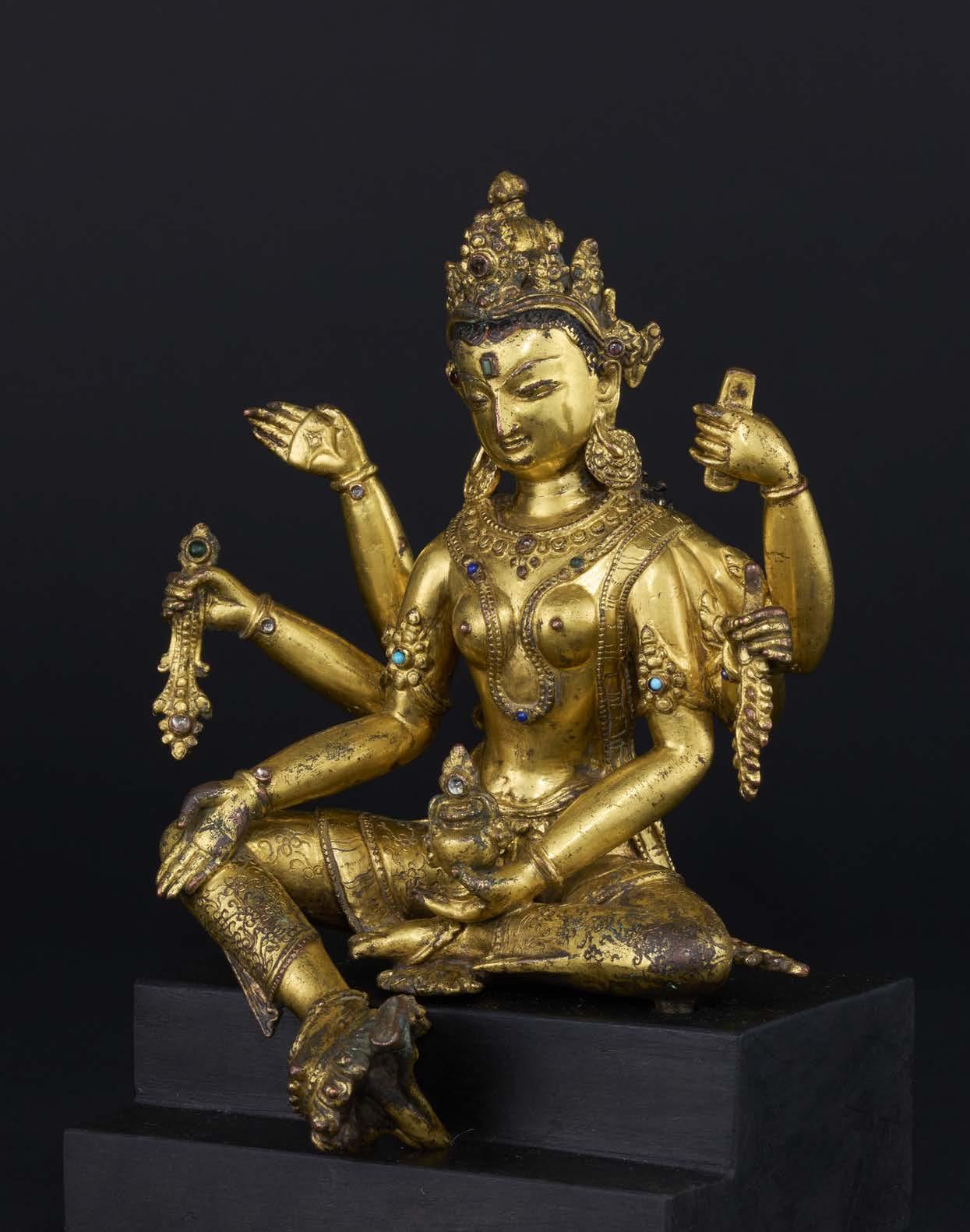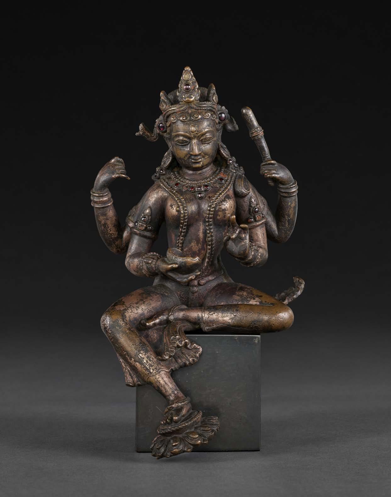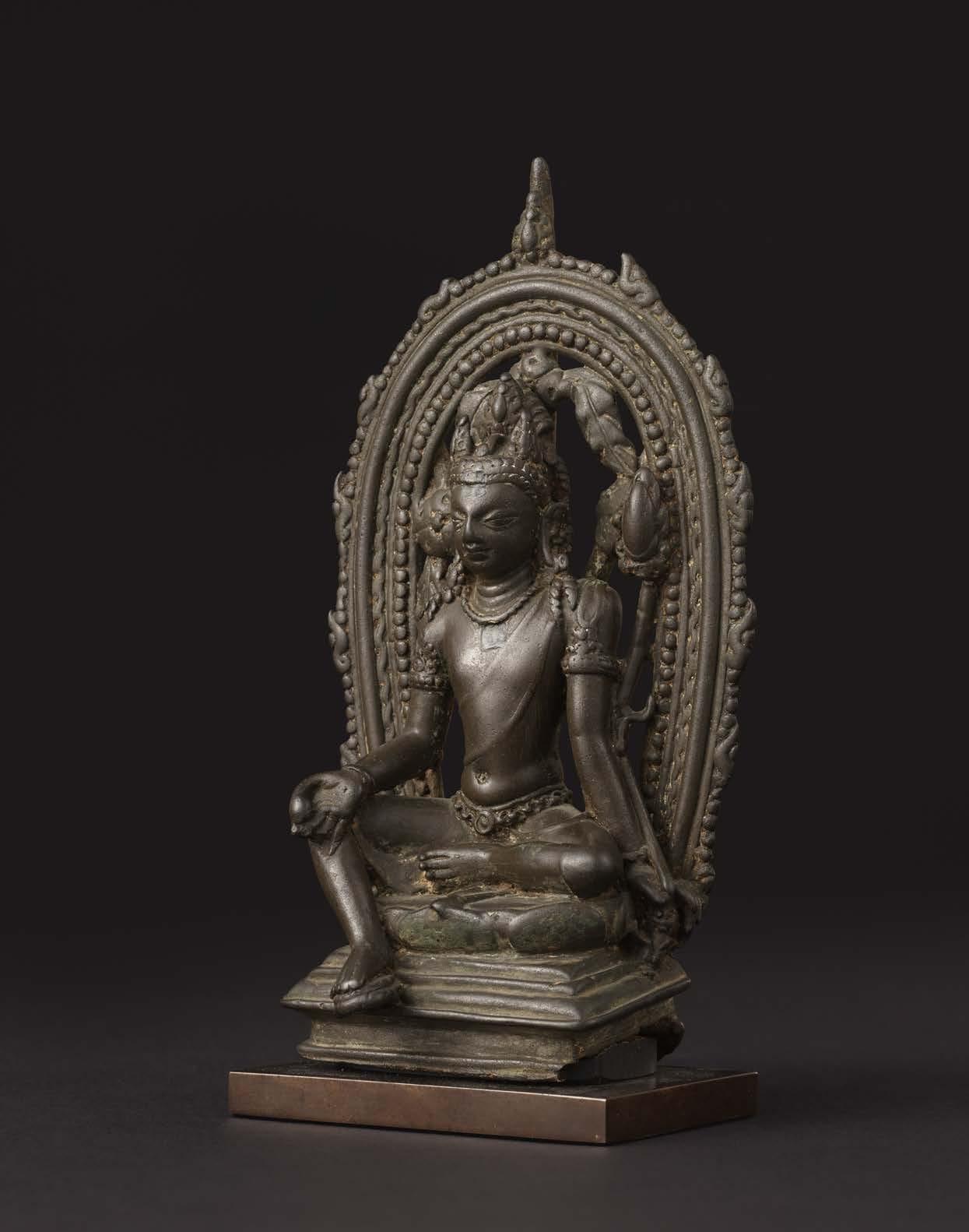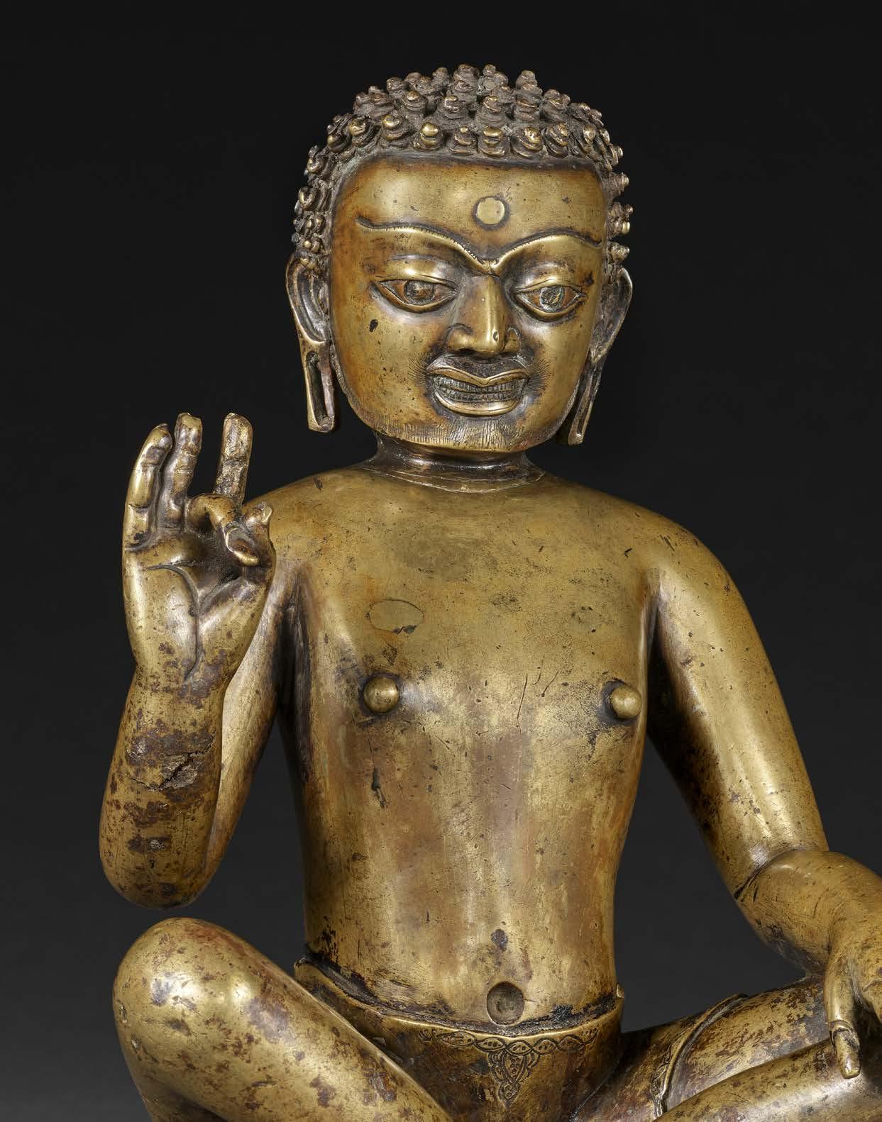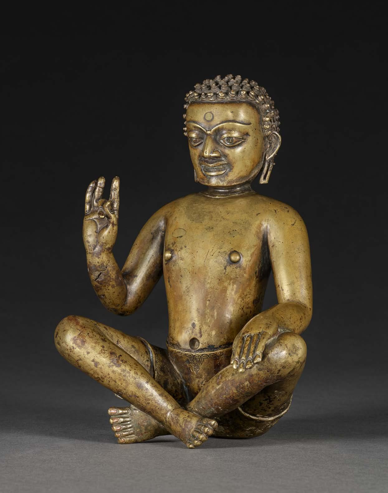 Closely related examples also seated in rajalilasana, with supporting weight on the left arm, broad shoulders, narrow waist, and plump torsos include two Manjushris, one in the Museum de Kulturen, Basel (HAR 3314716) and the other in the Los Angeles County Museum (M.75.4.9), both attributed to Bihar. The broad face with planar features, heavy lidded eyes in each of these examples, are emblematic to both this later Pala period as well as to styles often linked to the region of Bihar. Also compare with a Tara seated on a double lotus but of the same scale in the Varendra Research Museum, Rajshahi. Museum (#113), see Huntington, The Pala Sena Schools of Sculpture, Leiden, 1984, no. 271. Also compare patina and scale of a Manjushri sold Bonhams Hong Kong, 1 December 2023, lot 1853.