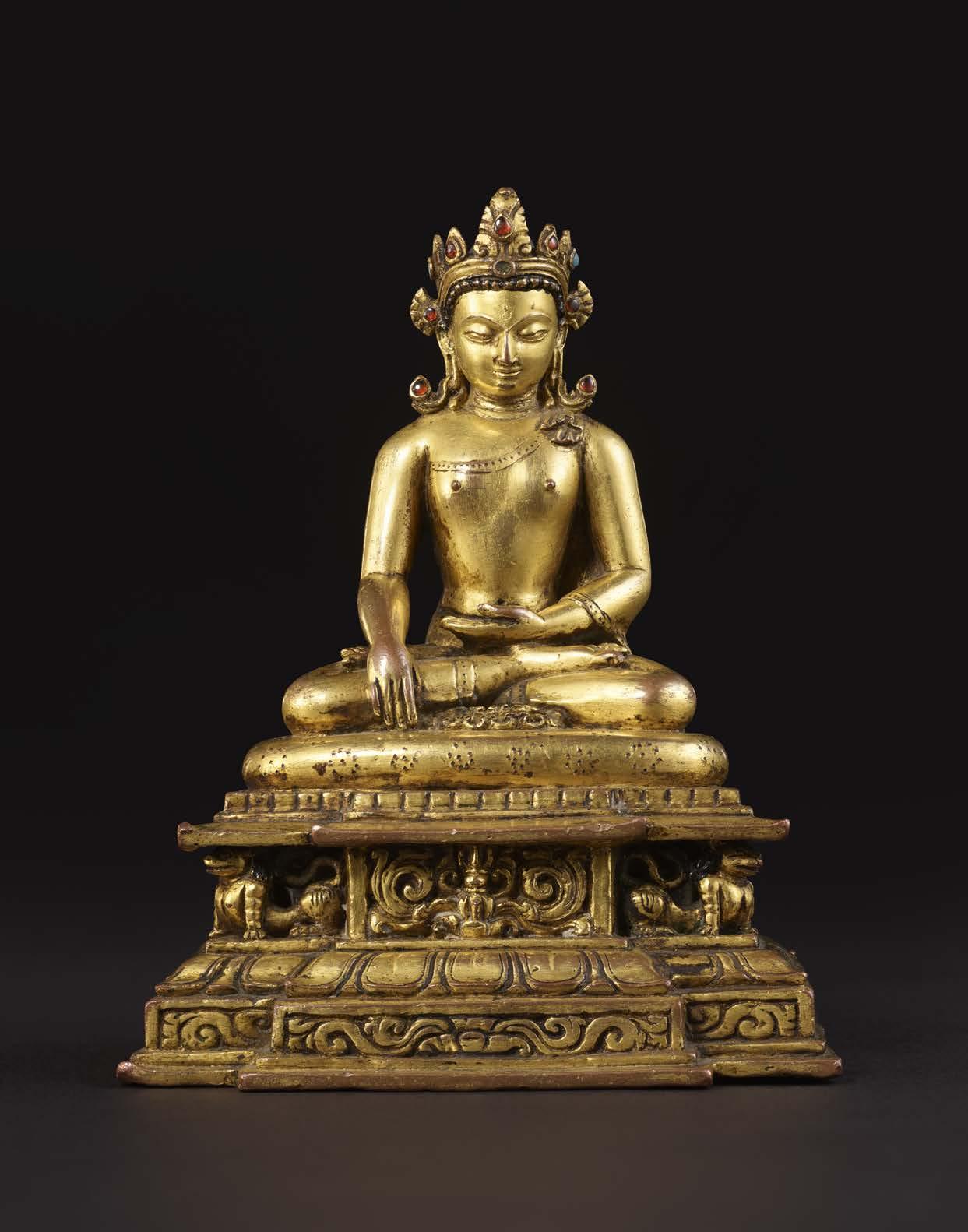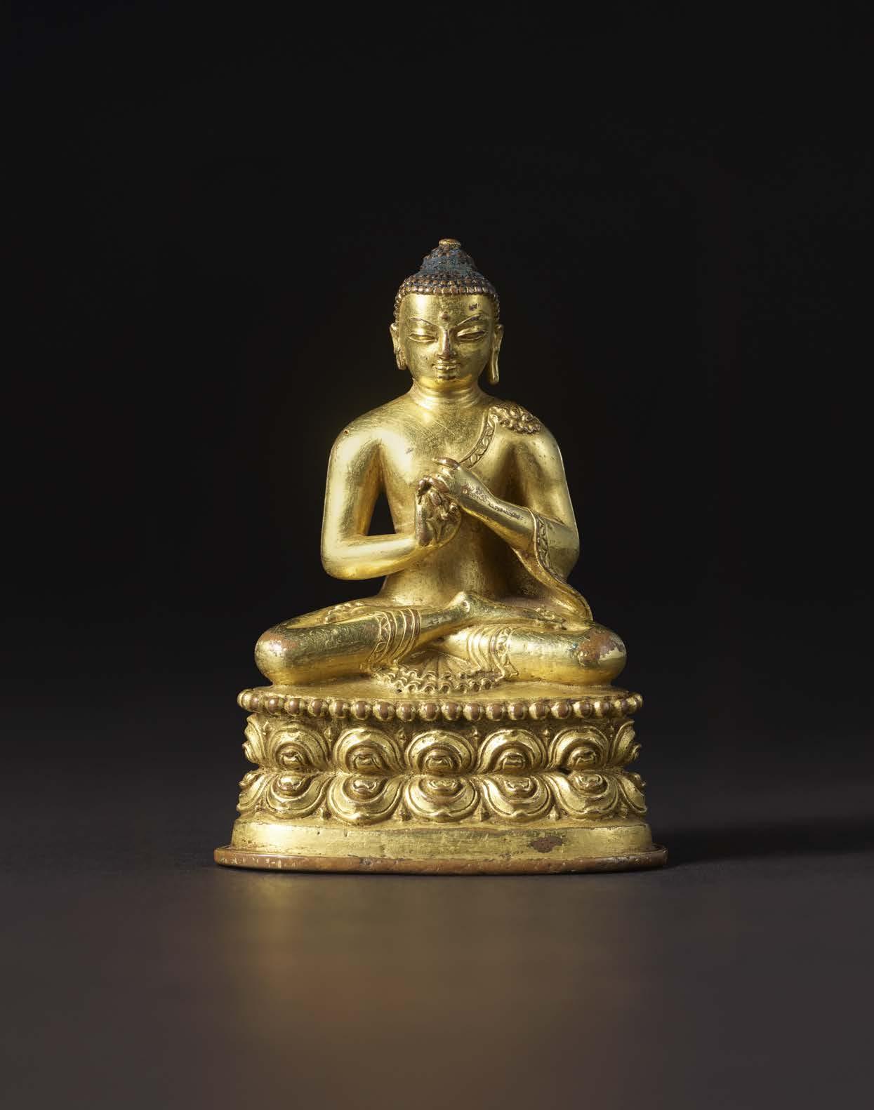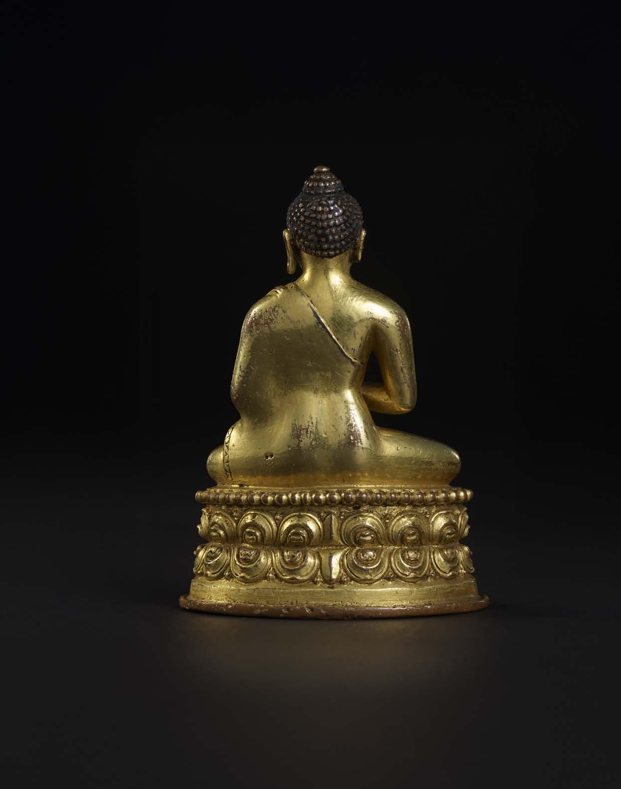 The figure is seated in vajrasana with plump feet, atop rounded shallow cushion on an open pedestal supported by forward-facing lions, a motif associated with royal and spiritual authority in early Himalayan art. Additionally, the throne is centred by a dwarf yaksha figure seated cross-leg with hands raised to support the weight. Of particular note is the throne edges, supported by unusually thin columnar struts, which compare closely to an 8th-century bronze Buddha preserved in Phiyang Monastery in Ladakh (see von Schroeder, Indo-Tibetan Bronzes, 1981, p. 114, no. 14B). These architectural elements are notable for their slender proportions and structural delicacy, providing both vertical balance and visual lightness to the composition.