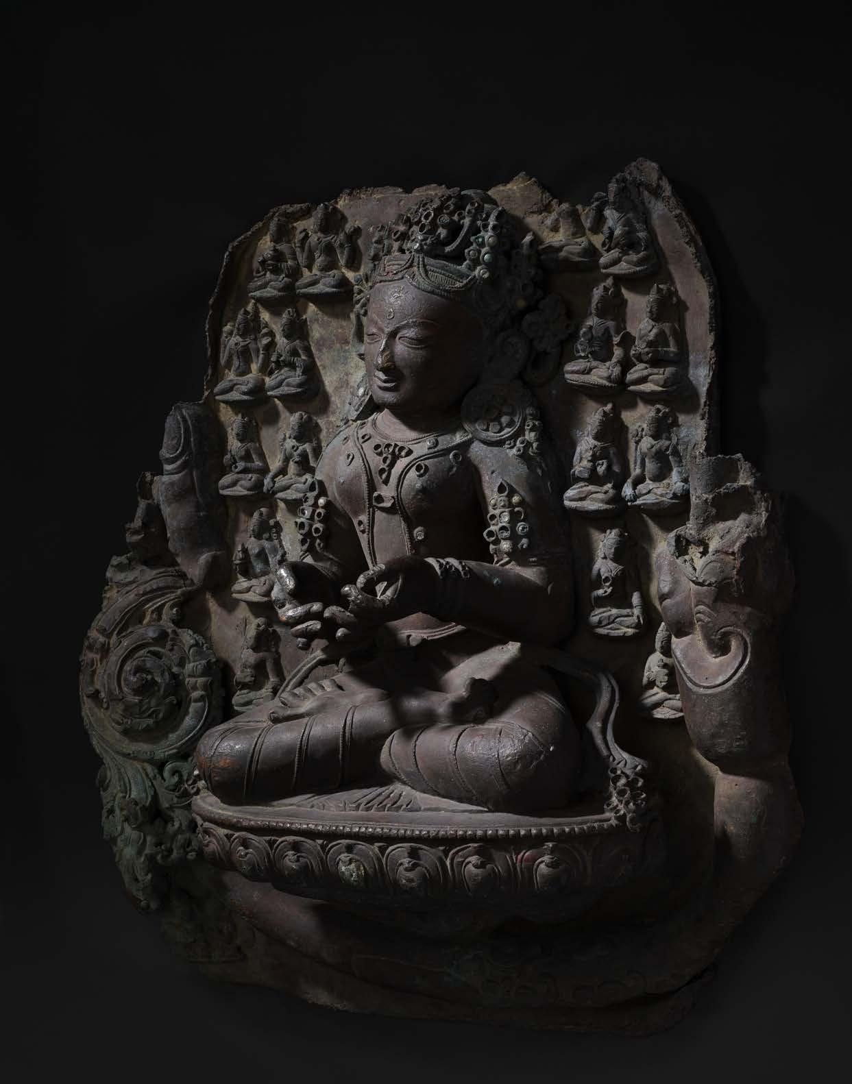 The sculpture’s refined proportions, gentle modelling, and lyrical ornamentation reflect the enduring legacy of Gupta classicism. This lineage is especially visible in the rounded visage, gently parted lips, flowing curls, and asymmetrical earrings that hang suspended from elongated earlobes. These features demonstrate the classical idiom reinterpreted and spiritually elevated by Pala sculptors in their service to Mahayana and Vajrayana iconography.