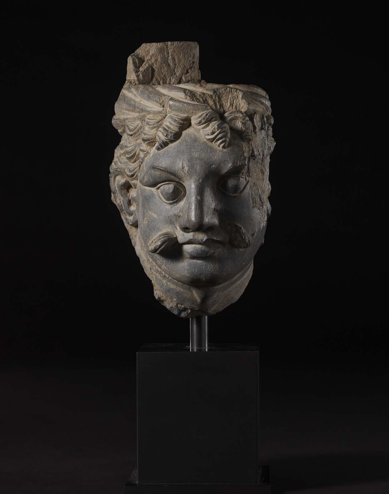This finely carved dark grey schist head depicts a male figure with a serene yet intense expression, exemplifying the stylistic synthesis of classical and South Asian traditions in Gandharan art. His large, wideset eyes, carefully incised with pupils, convey a trance-like gaze that draws the viewer in, while heavy, lidded brows, a bow-shaped upper lip, and a strong, rounded jaw give the face a calm but alert presence. A neatly groomed moustache, curled whiskers, and voluminous hair arranged in large curls frame the face, with the remnants of a turban still visible above the forehead, its individual twisting bands finely detailed.