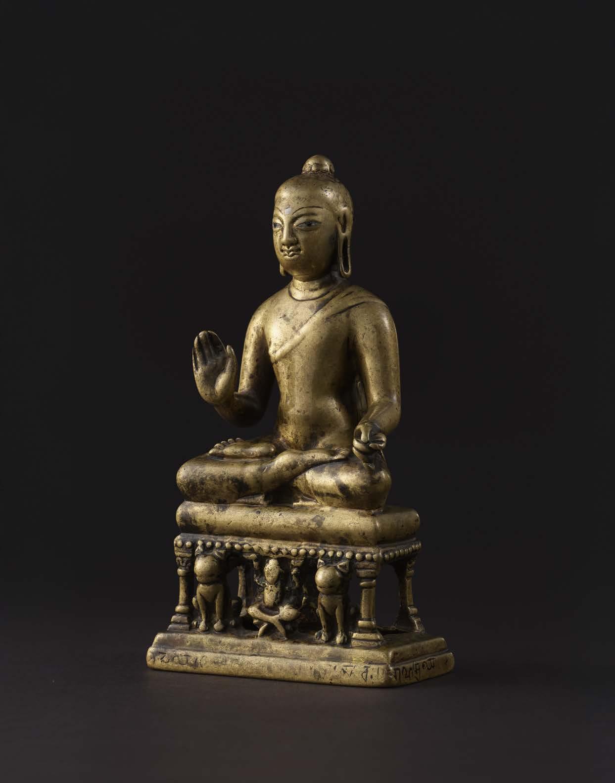 The Buddha raises his right hand in abhaya mudra, a gesture of reassurance, while the left hand rests upon the thigh, delicately grasping the end of his robe. The monastic robe, rendered with refined simple lines, flows smoothly across the body without any evidence of the garment’s natural folds, however, long vertical pleats behind the left arm fall to neat terminus at the hip. This stylistic restraint is consistent with early Kashmiri bronzes, where volume and surface are favored over ornate patterning. The Buddha’s face is finely modeled with silver-inlaid eyes and urna, enhancing the contemplative gaze. His lips curve into a distinct ‘W’ shape, a stylistic hallmark echoed in related bronzes from the period. The ushnisha is shallow, with the hair worn in soft, smooth curls, features that further point to an early date within the Kashmiri sculptural tradition. Gouriswar Bhattacharya has read the barely legible left edge and right edge of throne base inscription and has suggested the translation “Meritorious Gift of Whab gri ”, which conforms to the practice of meritorious inscriptions common to Kashmiri sculpture from the period.