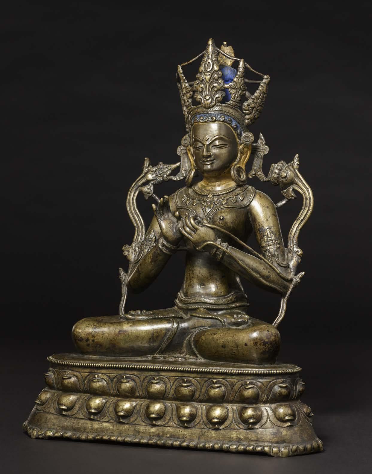 Finely cast and richly inlaid with silver and copper, this intimate yet powerful image of Manjushri, the Bodhisattva of Wisdom, exemplifies the high craftsmanship and devotional intensity of Himalayan metal sculpture in the 11th century. Small-scale works of this quality were treasured not only for their artistic refinement but also for their role in private devotion and tantric practice.