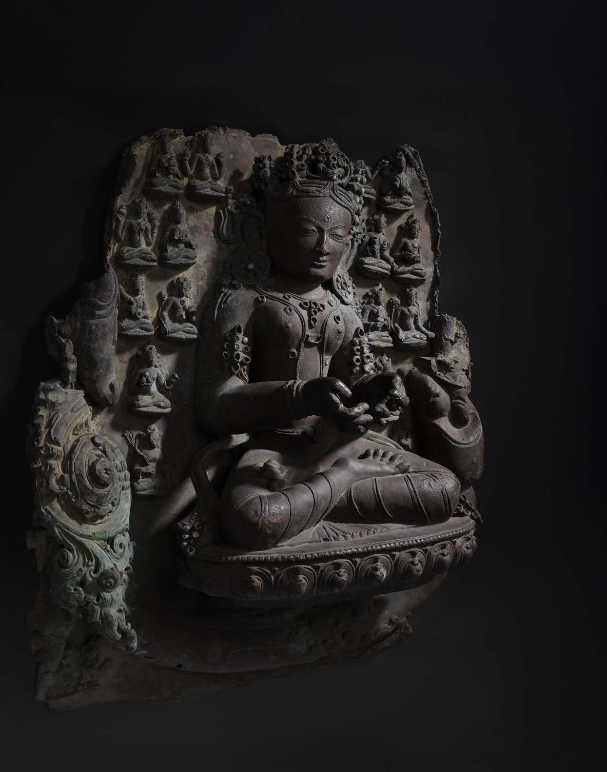This superb sculpture representation of the goddess Tara exemplifies the refined aesthetic and spiritual vision of Pala-period artists active in northeastern India between the 9th and 12th centuries. While her form is idealised, the sculpture captures the essence of feminine beauty with remarkable sensitivity. Her well-balanced proportions and full, sensuous body reflect both artistic mastery and devotional intent, hallmarks of the heralded sculptural tradition of the Pala ateliers.