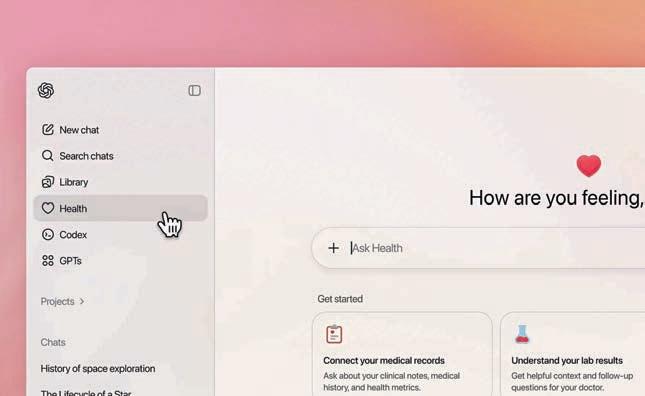 12| Im Januar 2026 präsentierte OpenAI mit „ChatGPT Health“ einen Dienst, der persönliche Gesundheitsdaten aus Smart-Devices oder Laborberichten analysiert, medizinische Trends erklärt und Arzttermine vorbereitet. Für den deutschen Markt wird der Start frühestens 2027 erwartet.