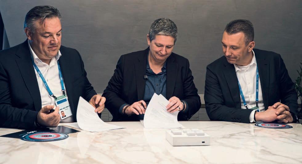 Rolf Schumann (Co-CEO Schwarz Digits), BSI-Präsidentin Claudia Plattner und Christian Müller (Co-CEO Schwarz Digits) vereinbaren im Rahmen der Münchner Sicherheitskonferenz eine strategische Partnerschaft zwischen BSI und Schwarz Digits. (v. l.)