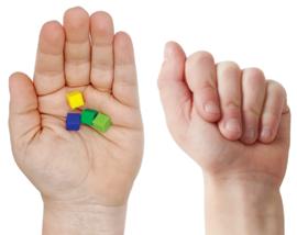 Students progress from finding totals by using the Level 1 strategy of counting all objects to using the Level 2 strategy of counting on from a known part. At first, objects are shown as two parts, such as the dots that appear on a pair of dice. Students choose a part they know, or can subitize, without counting one by one. They begin the count by naming the known part and then keep counting the objects in the second part to find the total: