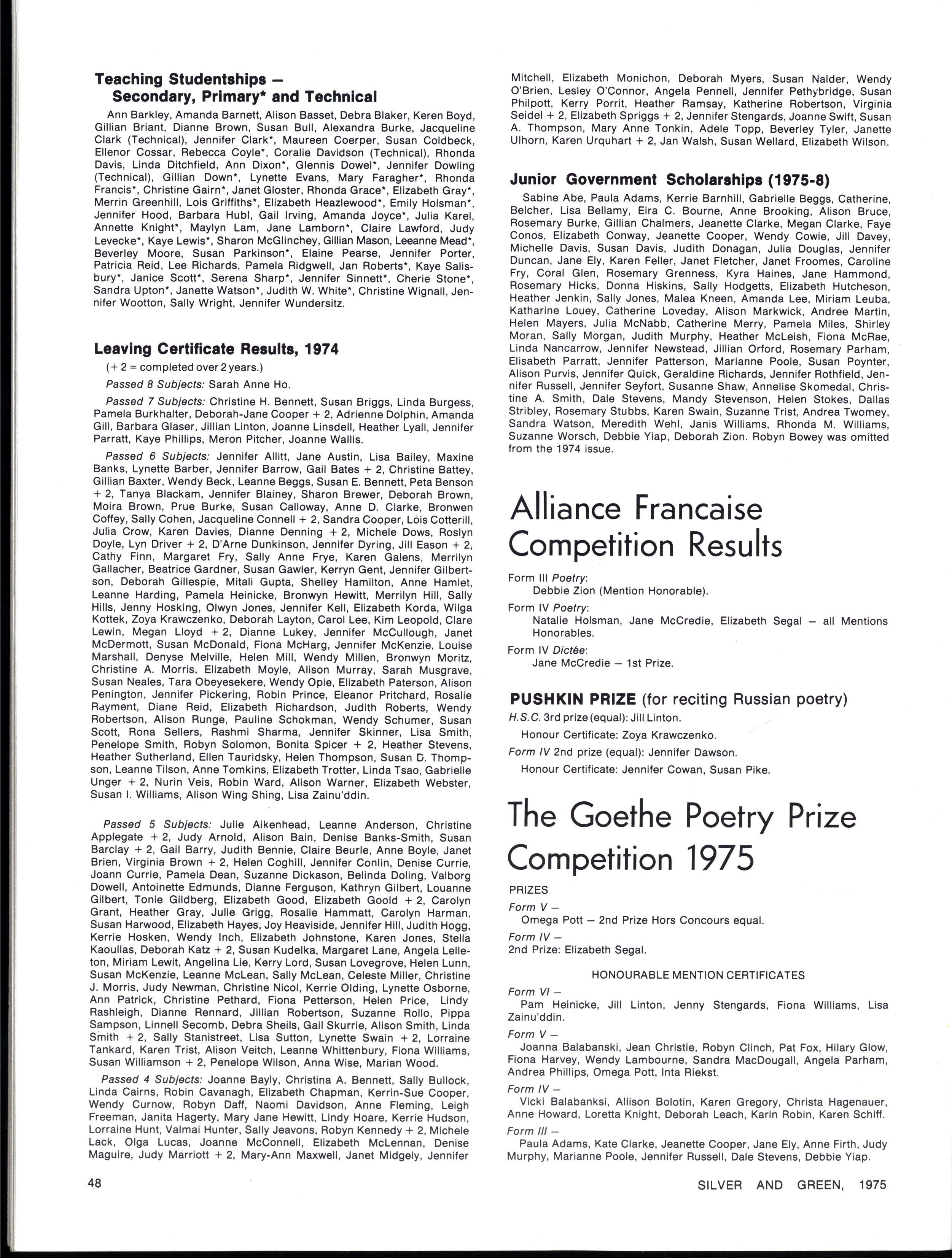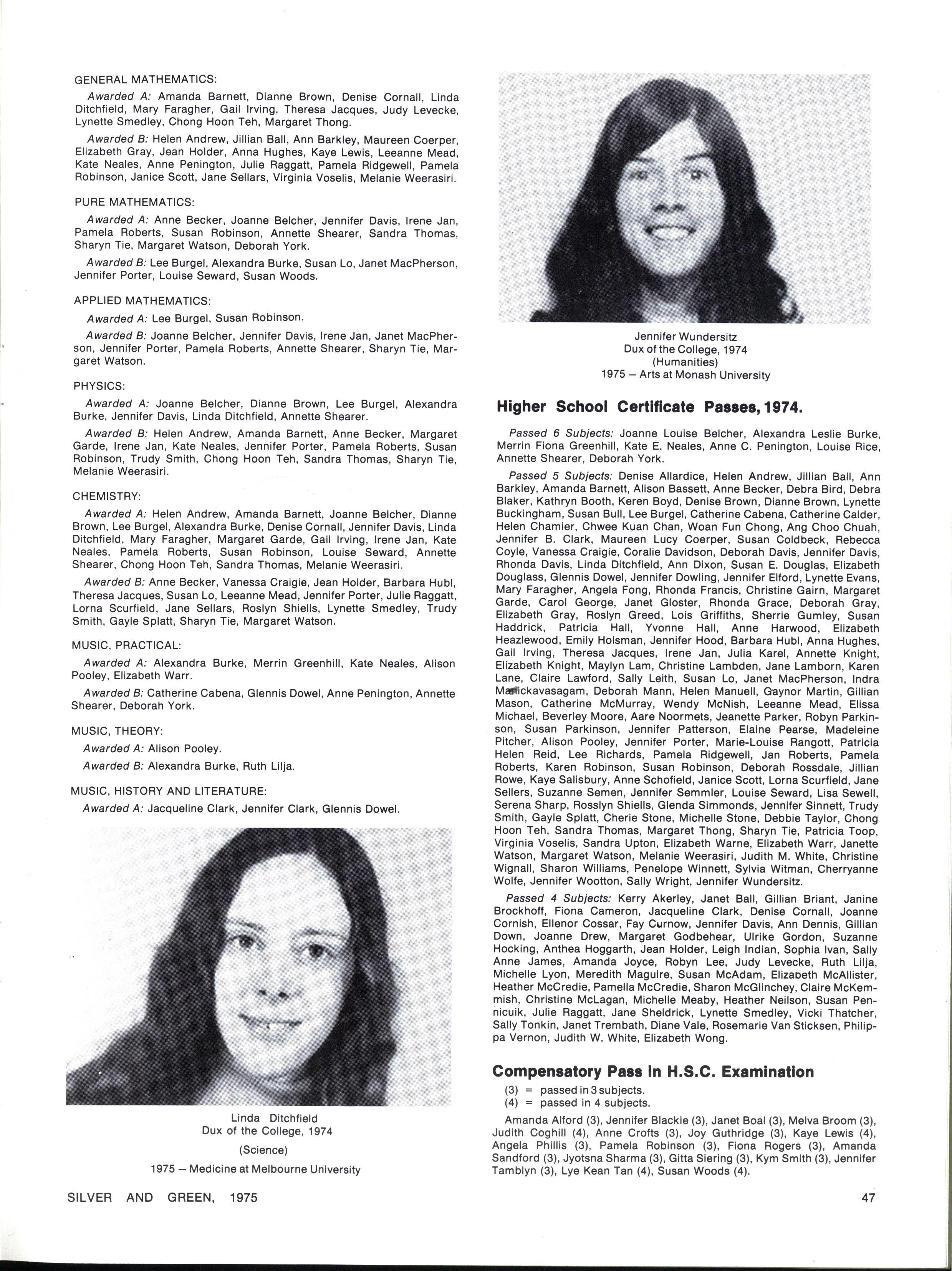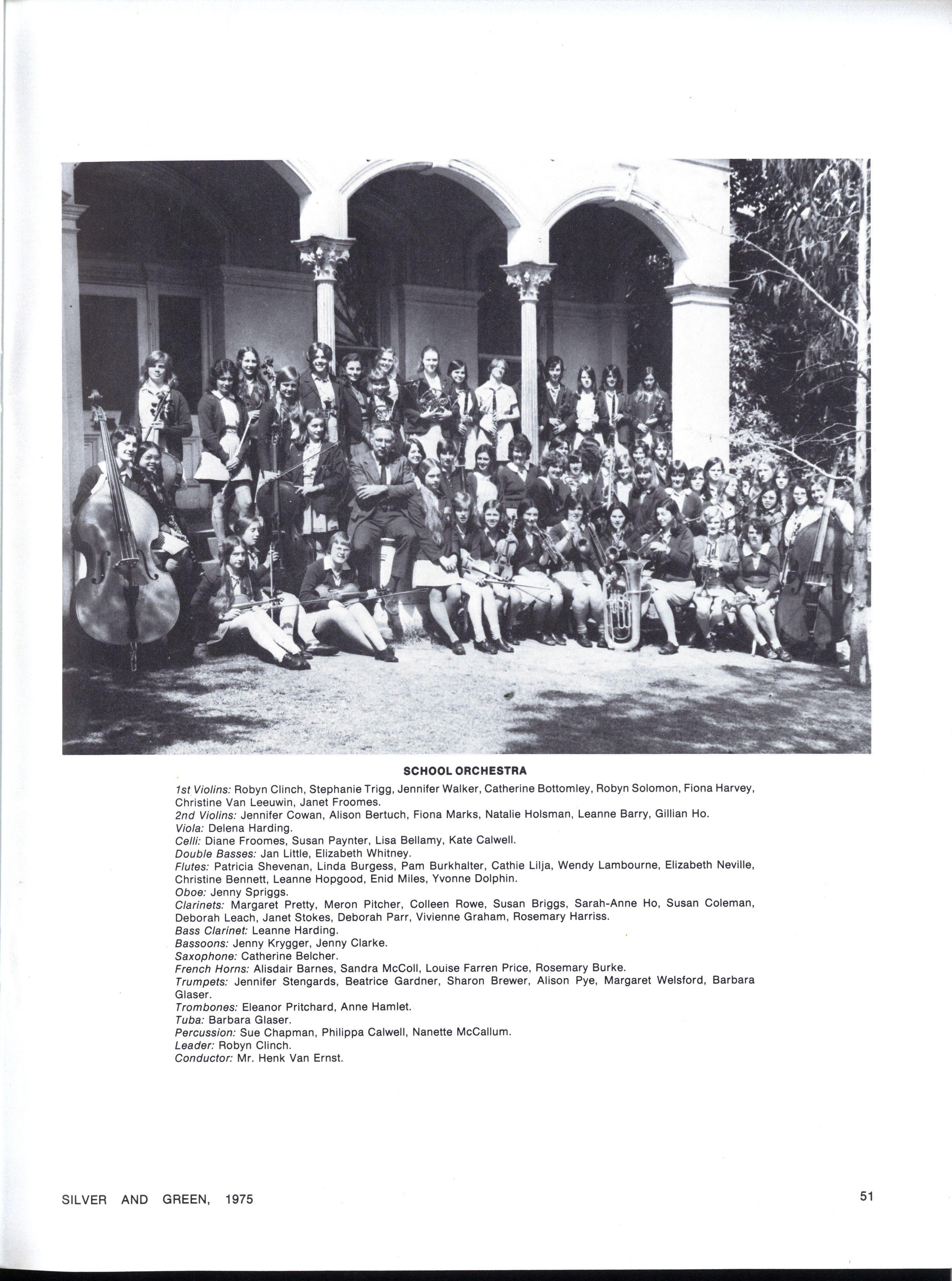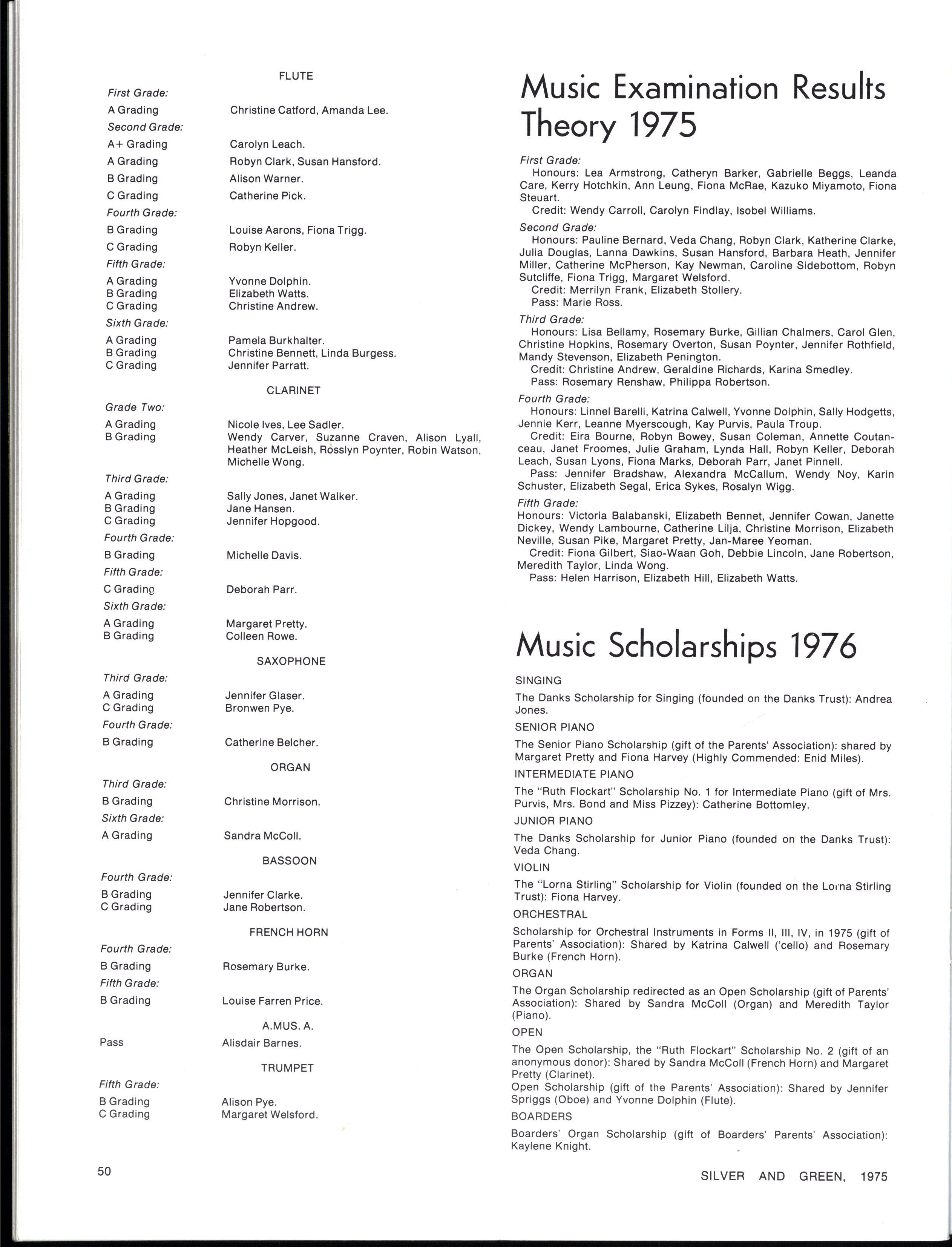 Scholarship for Orchestral Instruments in Forms II Ill, IV, in 1975 (gift of Parents Association): Shared by Katrina Calwell ('cello) and Rosemary Burke (French Horn)
