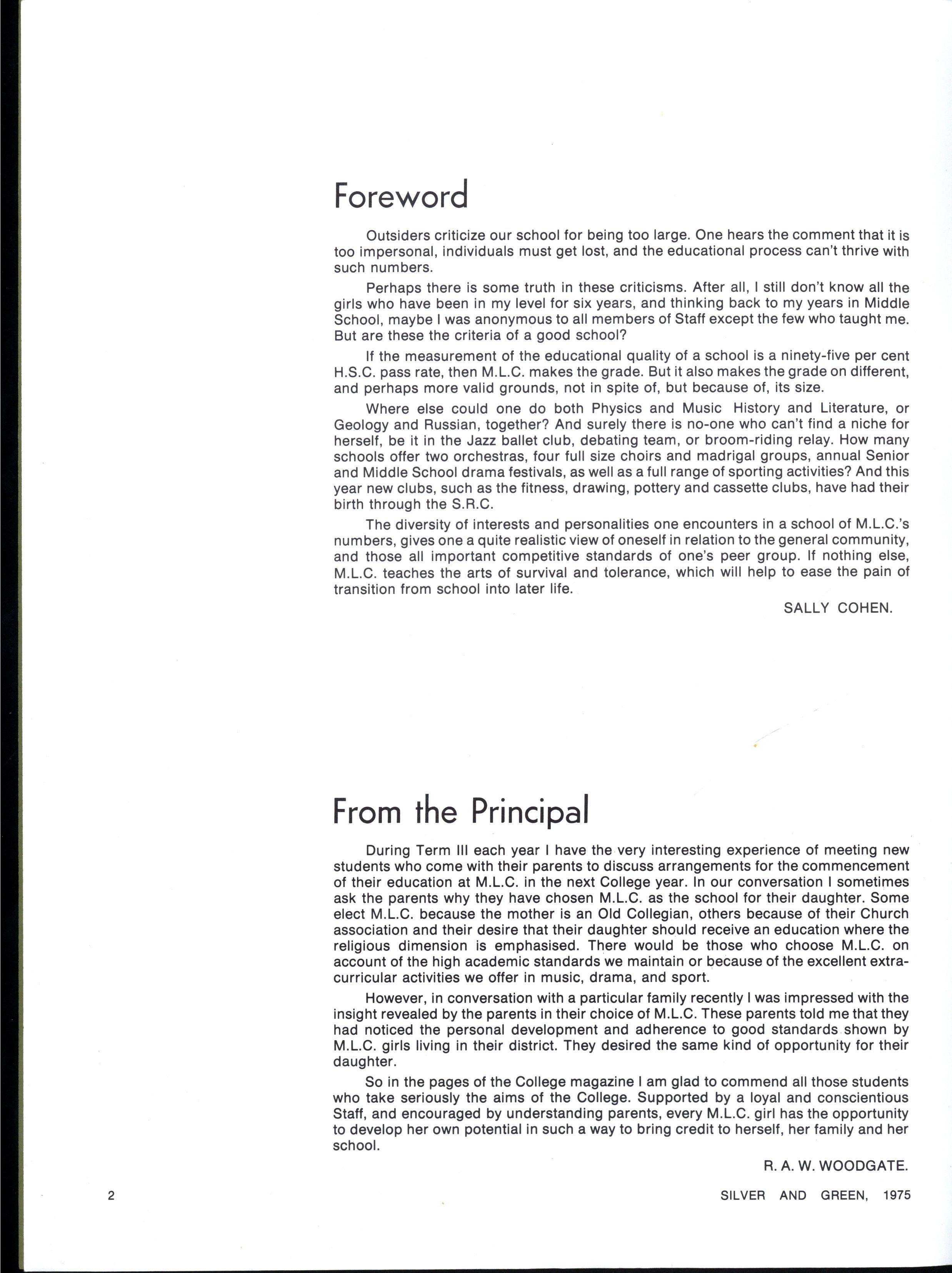During Term III each year I have the very interesting experience of meeting new students who come with their parents to discuss arrangements for the commencement of their education at M.L.C in the next College year In our conversation I sometimes ask the parents why they have chosen M.L.C as the school for their daughter Some elect M.L.C. because the mother is an Old Collegian, others because of their Church association and their desire that their daughter should receive an education where the religious dimension is emphasised There would be those who choose M.L.C on account of the high academic standards we maintain or because of the excellent extracurricular activities we offer in music, drama, and sport