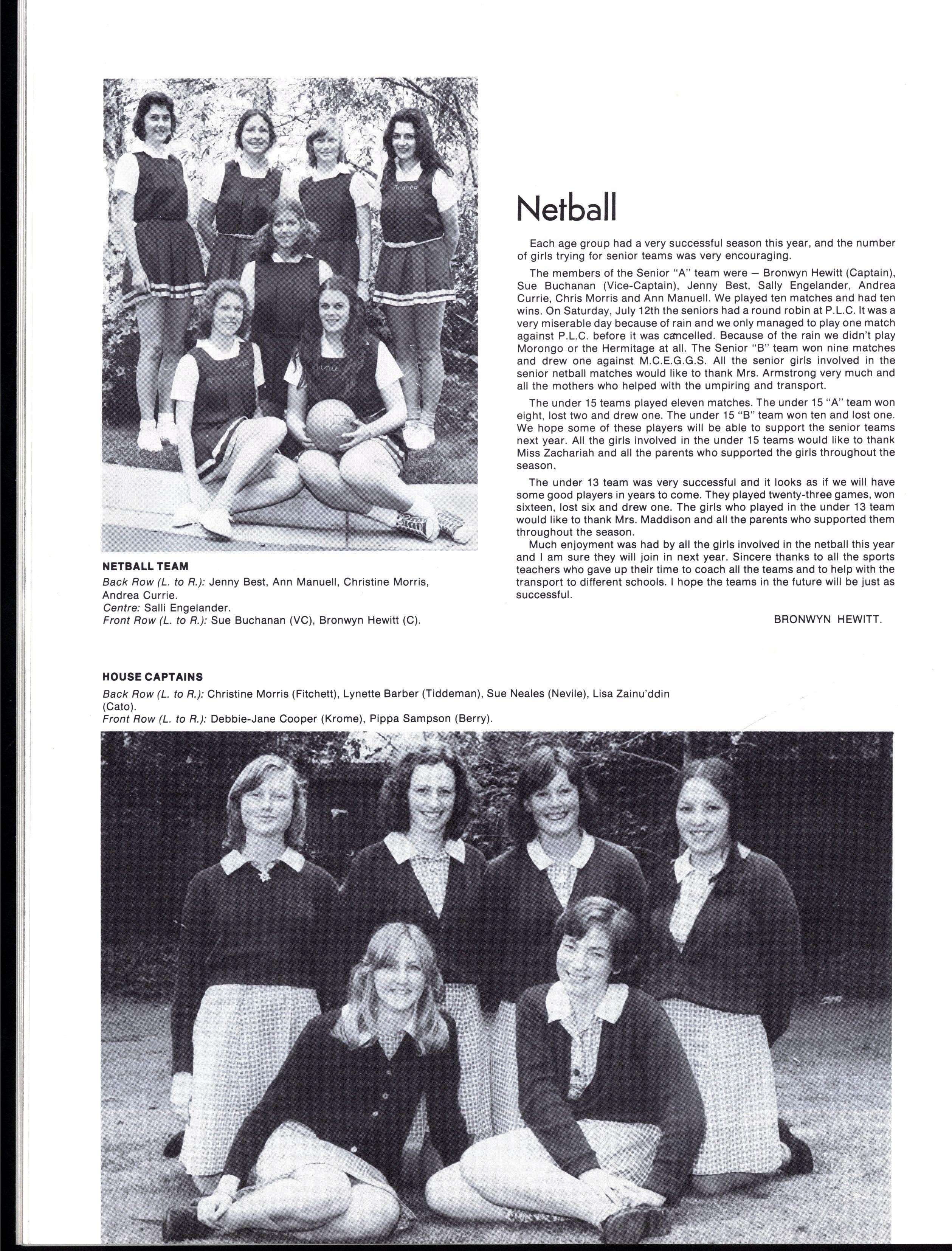 As representatives of the school we put in an appearance at various annual meetings (including the annual meeting of the Freedom From Hunger Campaign) and attended the Anzac Memorial Service at the Edith Cavell Shrine Our other more lighthearted activities have involved the arranging of blind dates for very successful dances at Wesley, Carey, St Kevins and Yarra Valley, as well as a netball match (?!) against the Wesley Prefects, the results of which will be left to your imagination