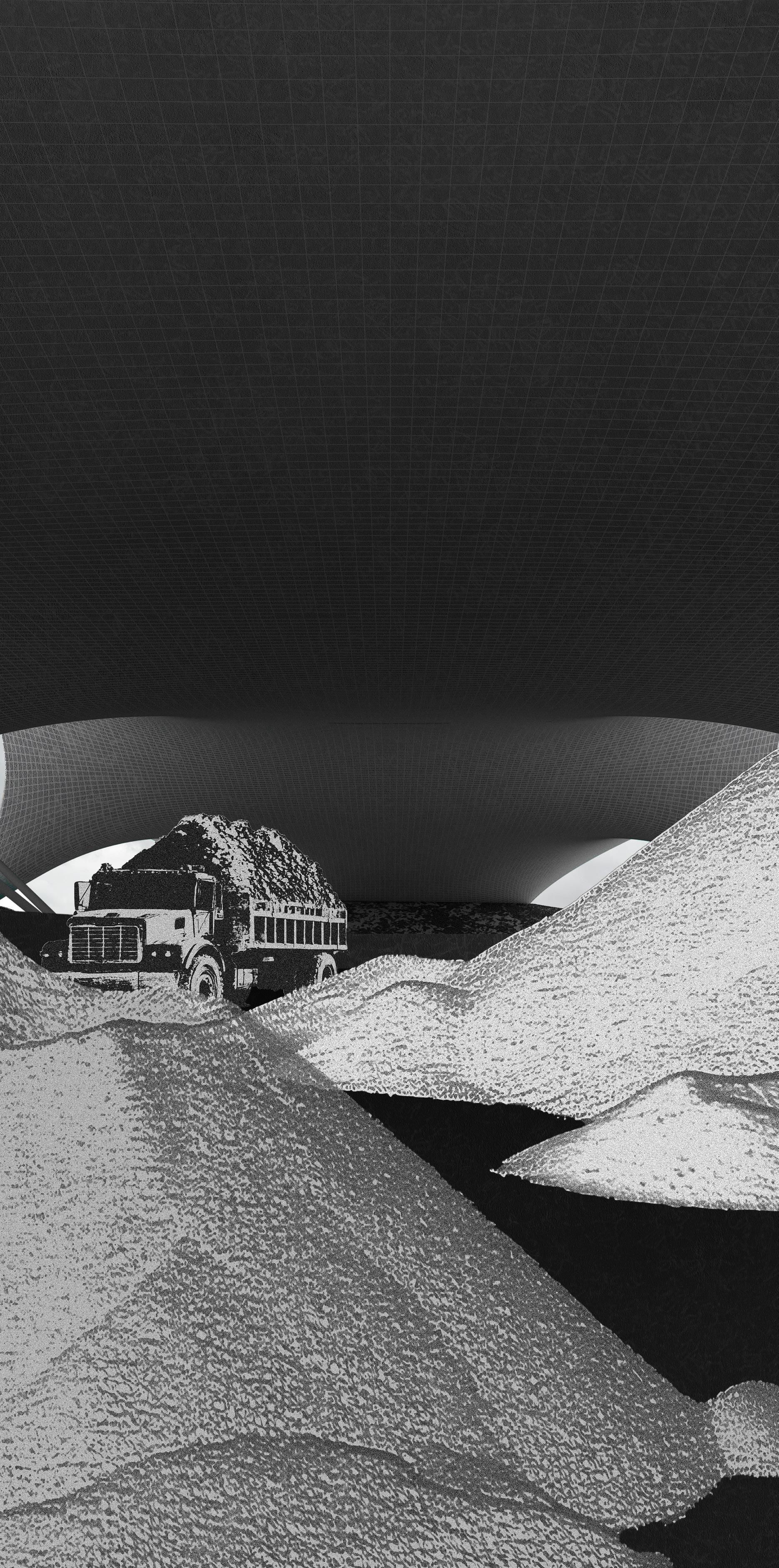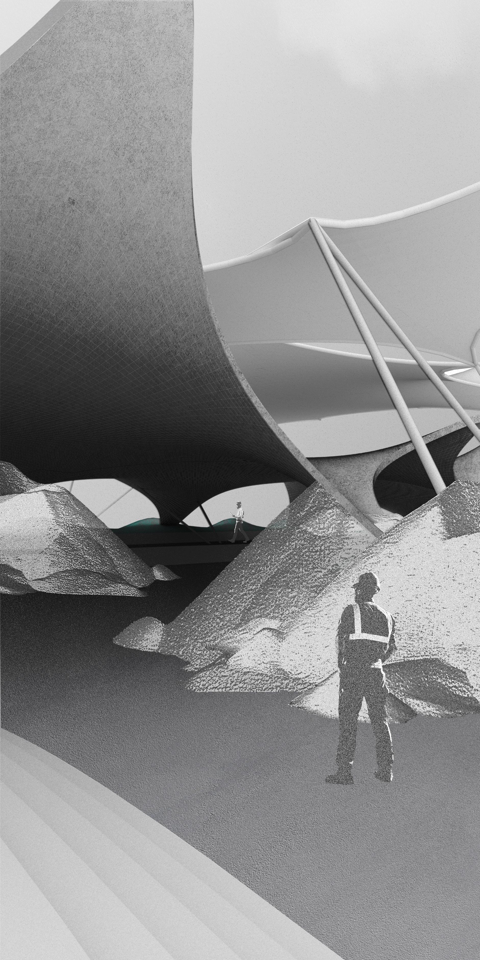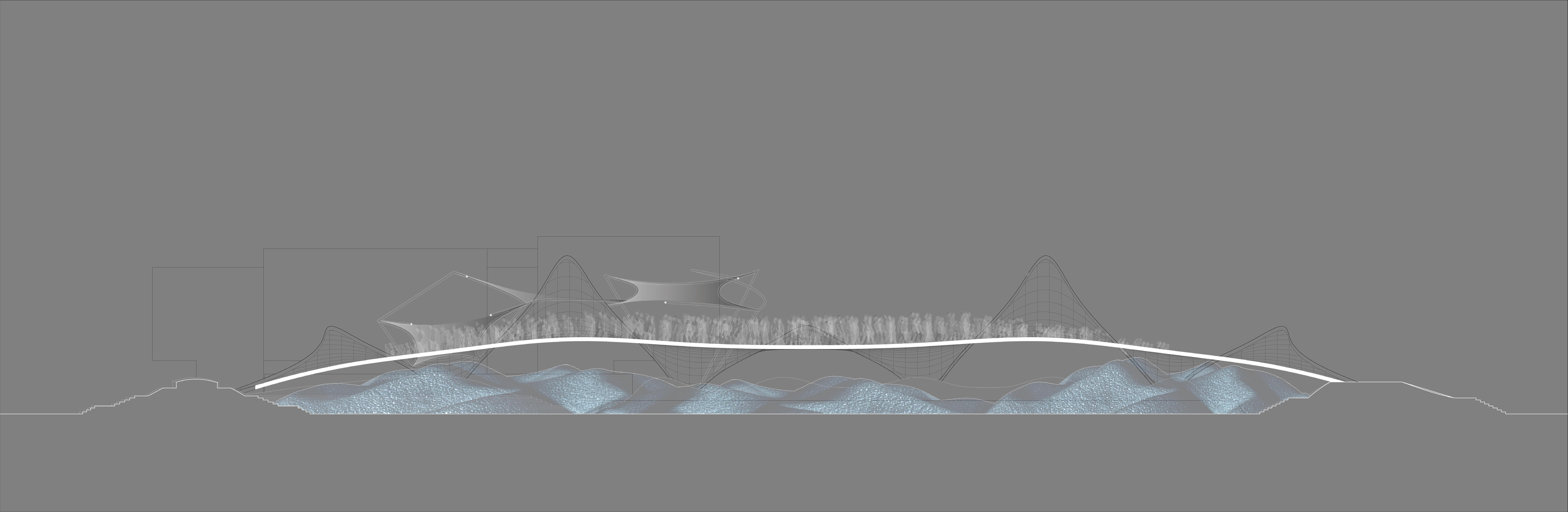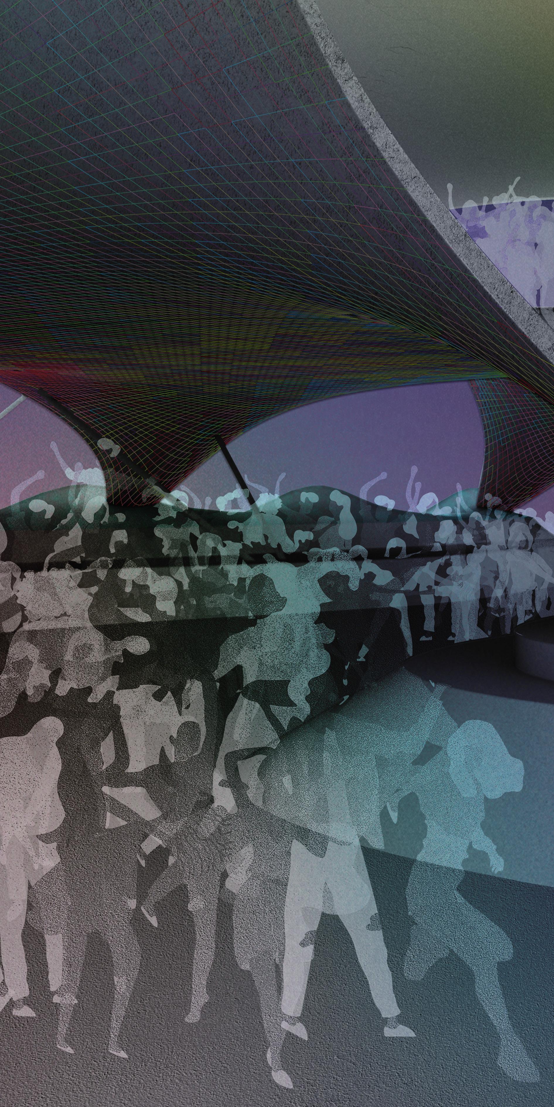 The project explores how architectural form can shape and intensify human behavior. Its geometry is inspired by Musmeci’s bridge in Potenza, Italy, and by the tensile structures of Frei Otto. In winter, the concrete structure shelters road salt in Syracuse while functioning as a bridge. In summer, the same space transforms into an outdoor music and gathering venue.