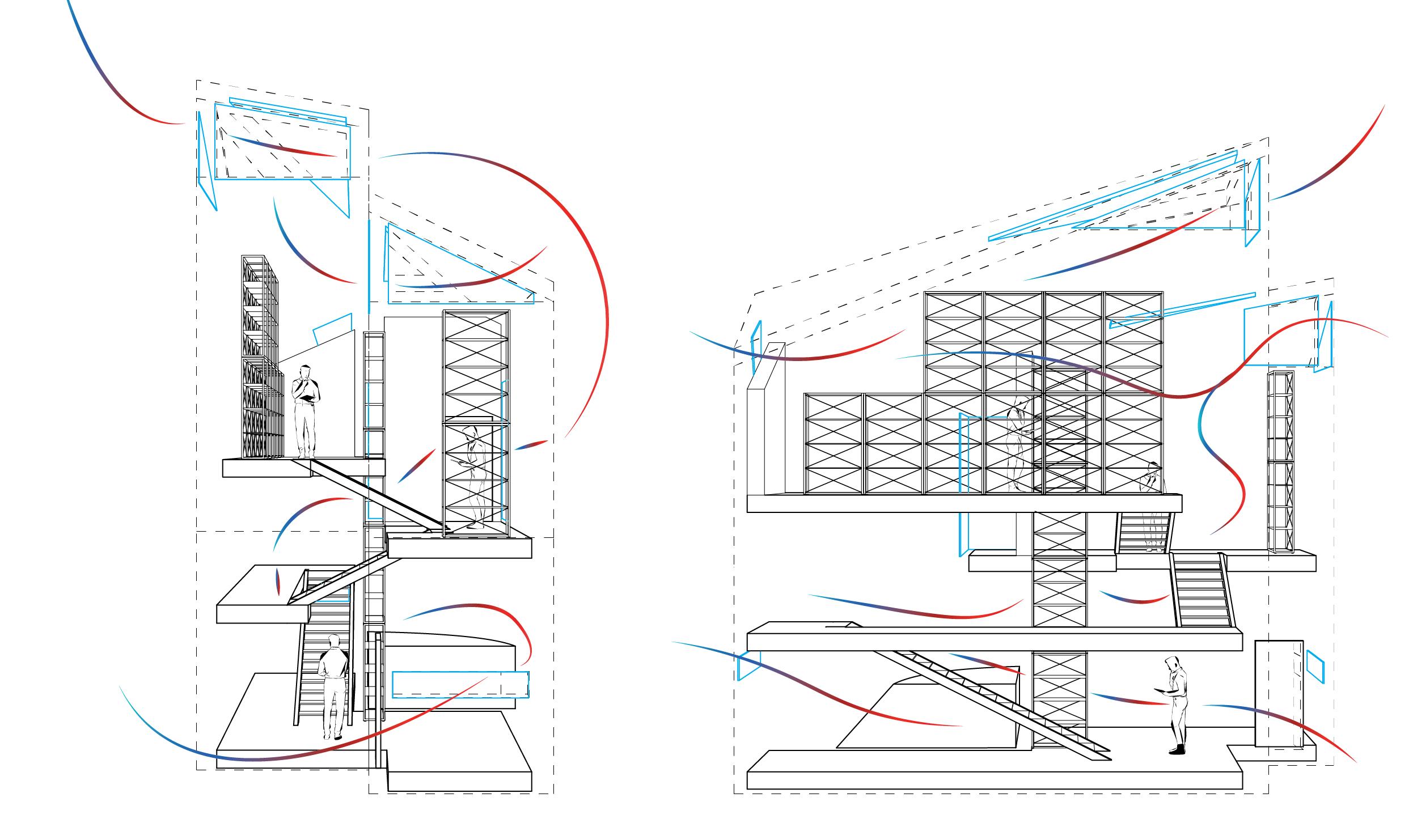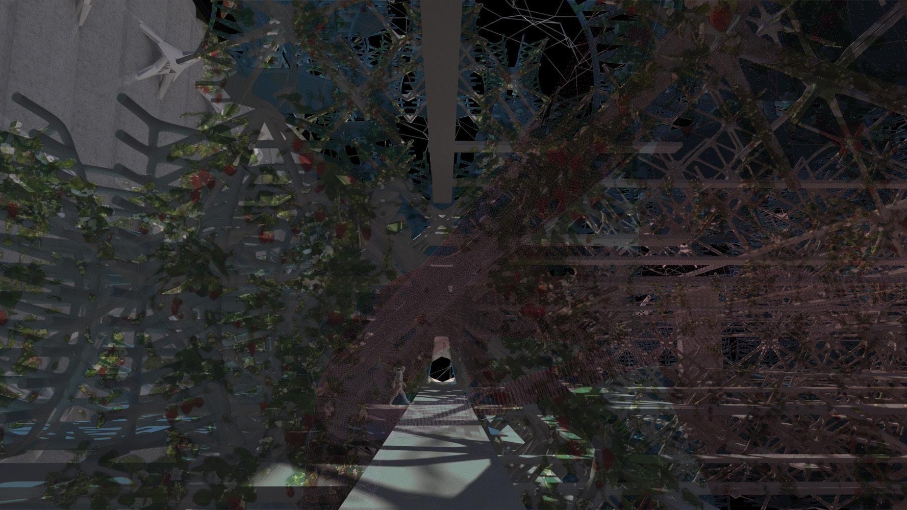 Pink slabs are for horizontal circulation through each vertical farming module, while puple extrusions are fire stair cases for vertical farming. Jesus’s design is for where conveyor belt and other spaces.