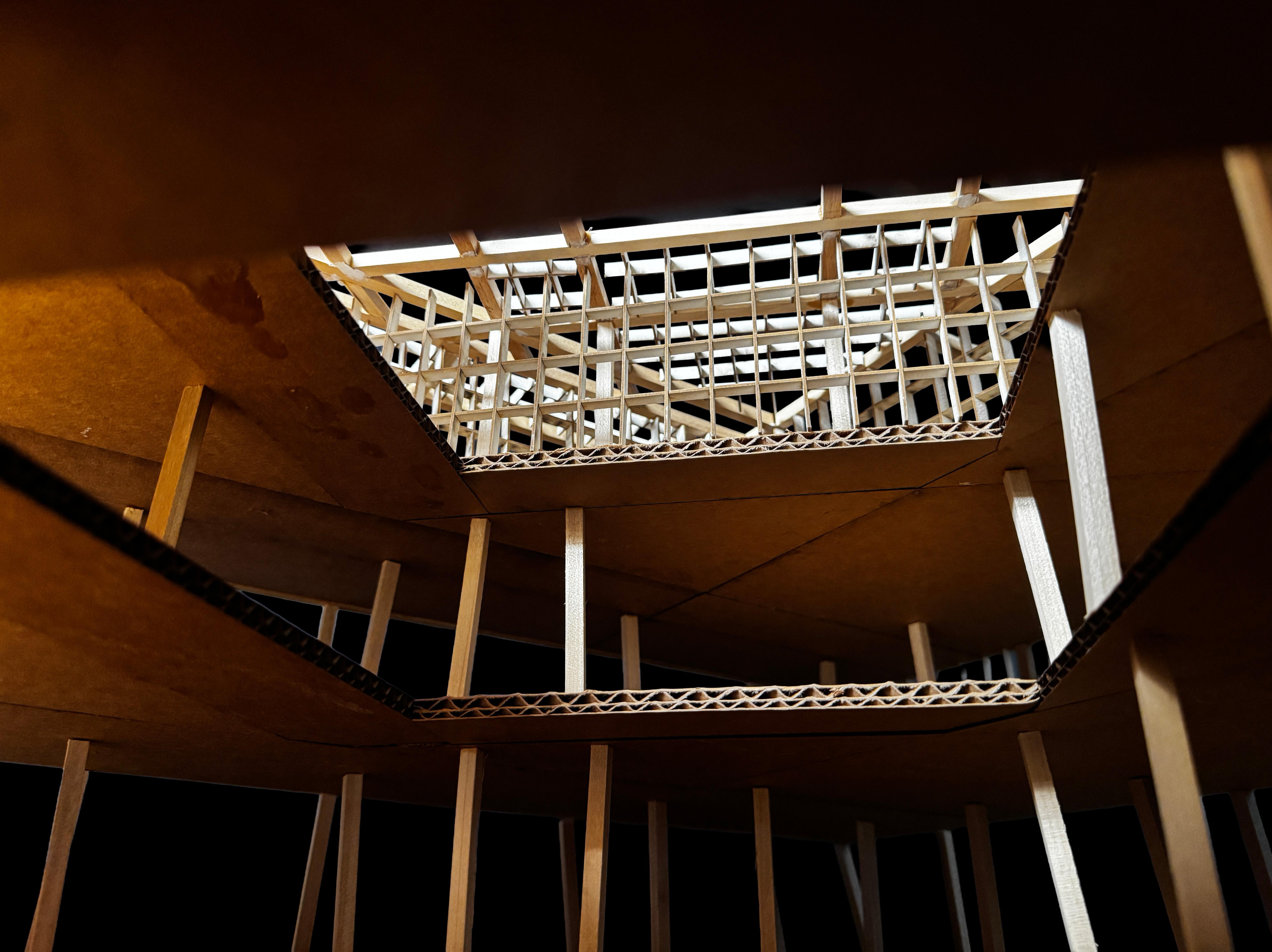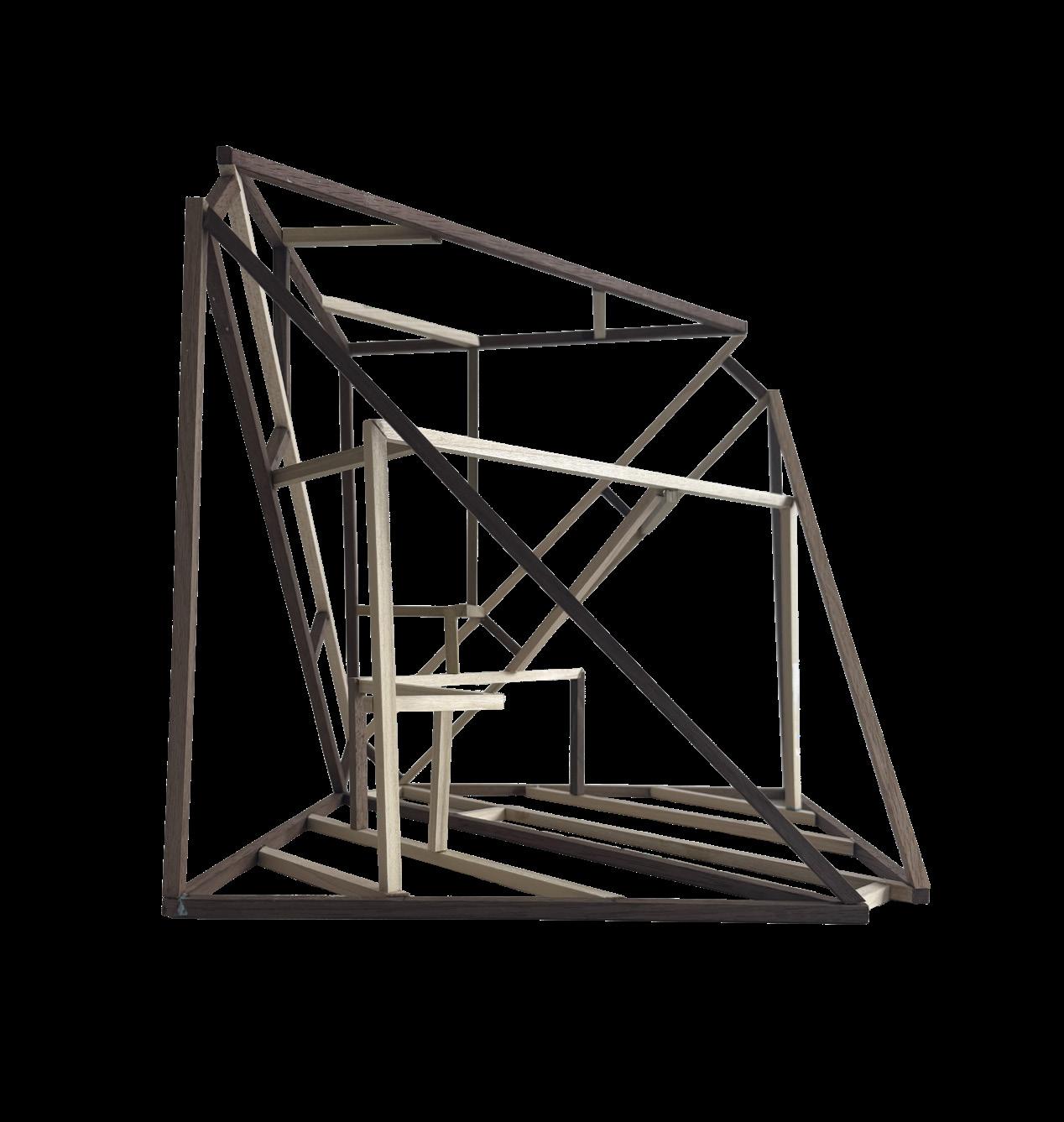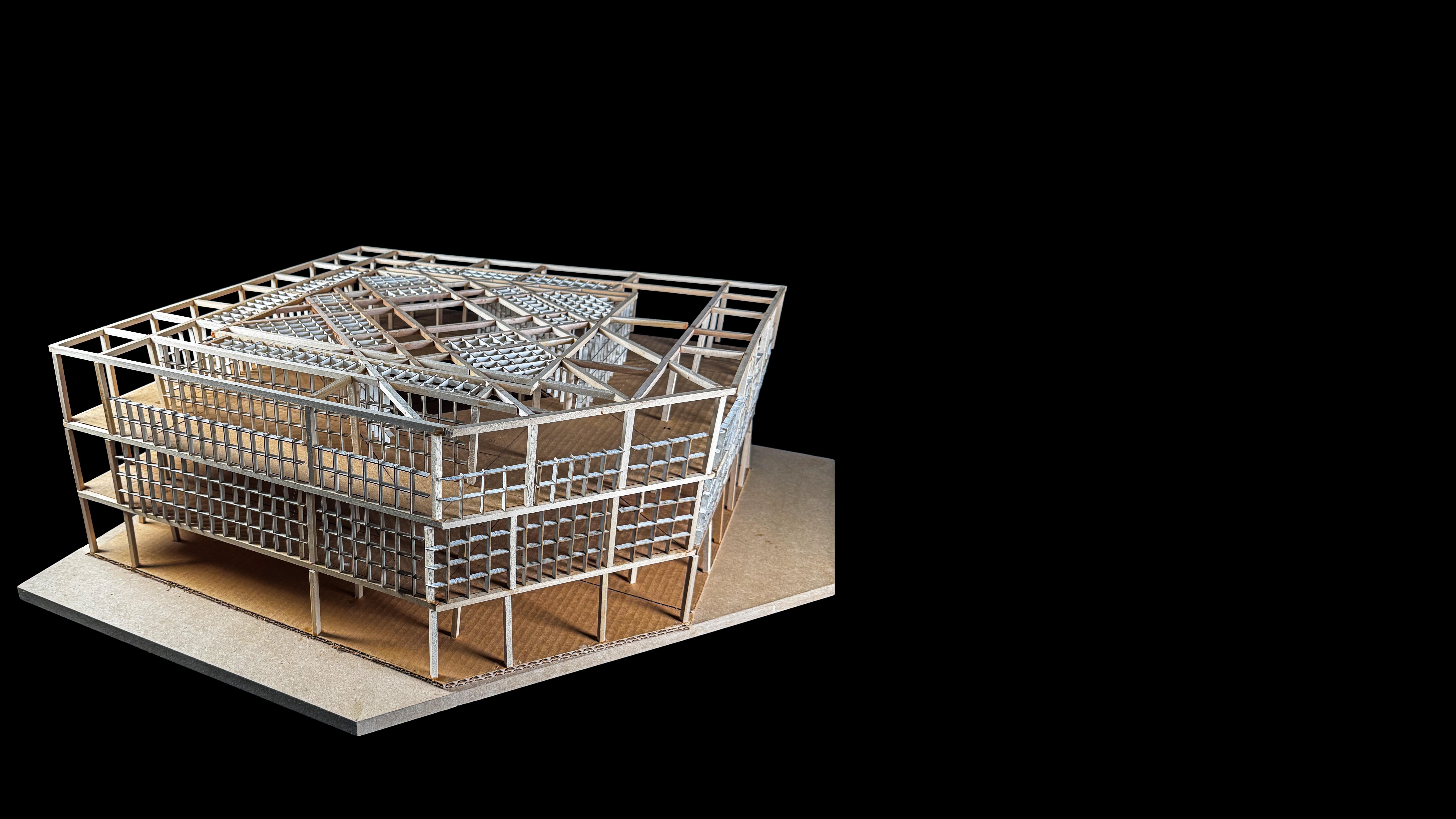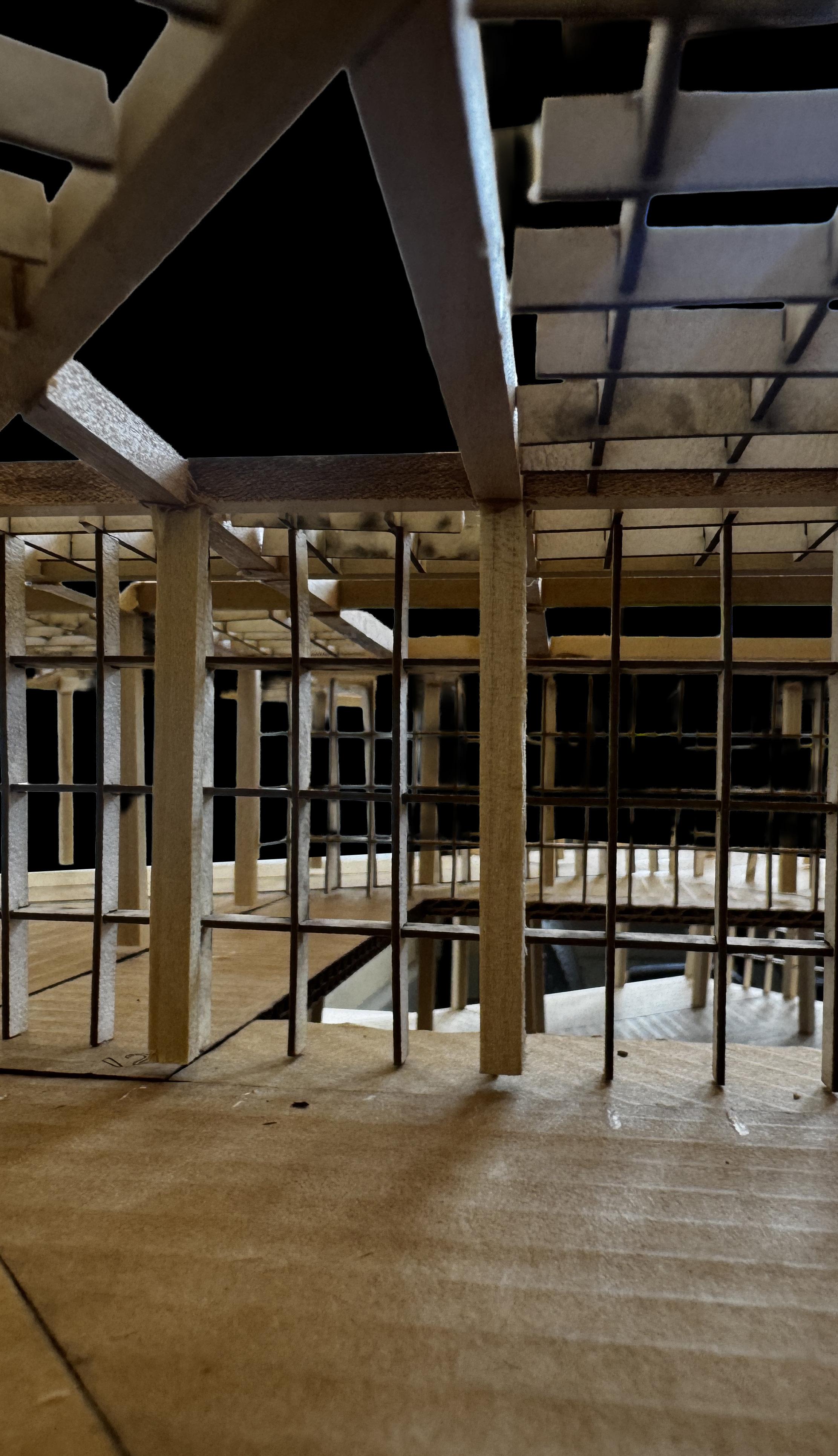 Inspired by Martin Rajniš’s use of repetition to generate complexity from timber structures, this project explores how formal richness can emerge from a simple system. Rather than following the modernist claim that clarity requires simplicity, the project investigates repetition as a generative method for spatial complexity. The physical models test how walls, floors, and circulation can participate in the prism, while the digital studies further develop structure, subdivision, and repetition into an architectural space capable of accommodating program and human interaction.