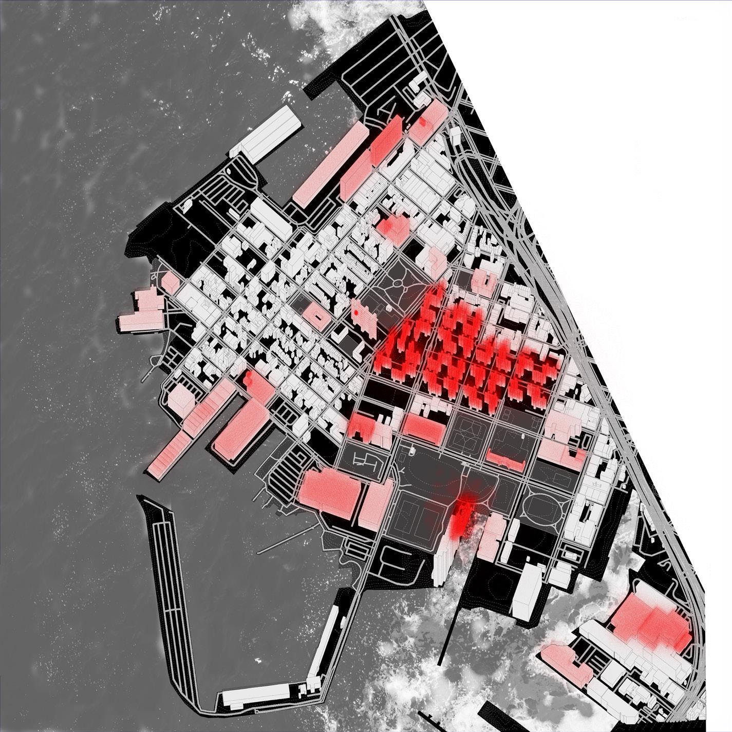 As temperatures rise, oceans warm, and extreme weather intensifies, the proposal explores how design can respond through adaptation rather than denial. The image on the left shows the projected infiltration of pollutants through water from 2030 to 2100, with green indicating earlier spread and red indicating future expansion.