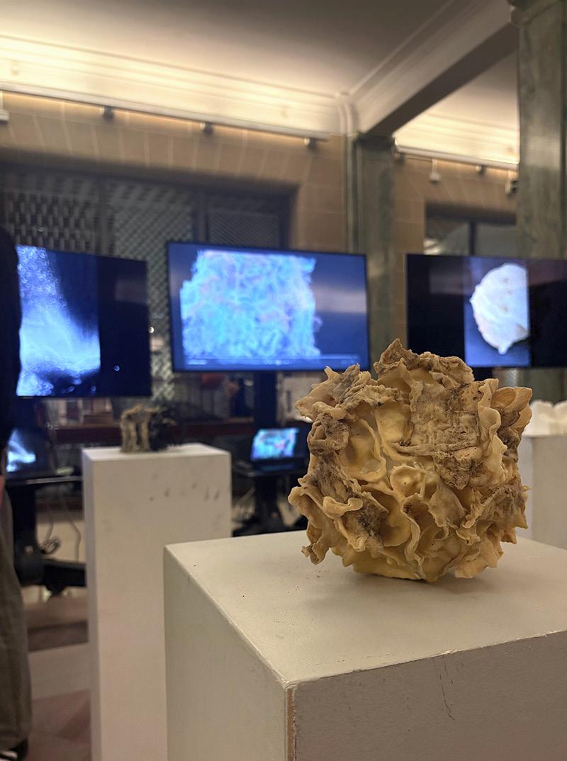 The physical model expresses anger, grief, and bodily damage through repeated ear forms and ruptured eardrum-like surfaces made with 3D-printed elements, latex, and tree bark. The accompanying digital video, produced with Grasshopper and After Effects, reflects the ambiguity of this condition: the injustice of an irreversible loss alongside a new and strange appreciation for hearing the world differently.