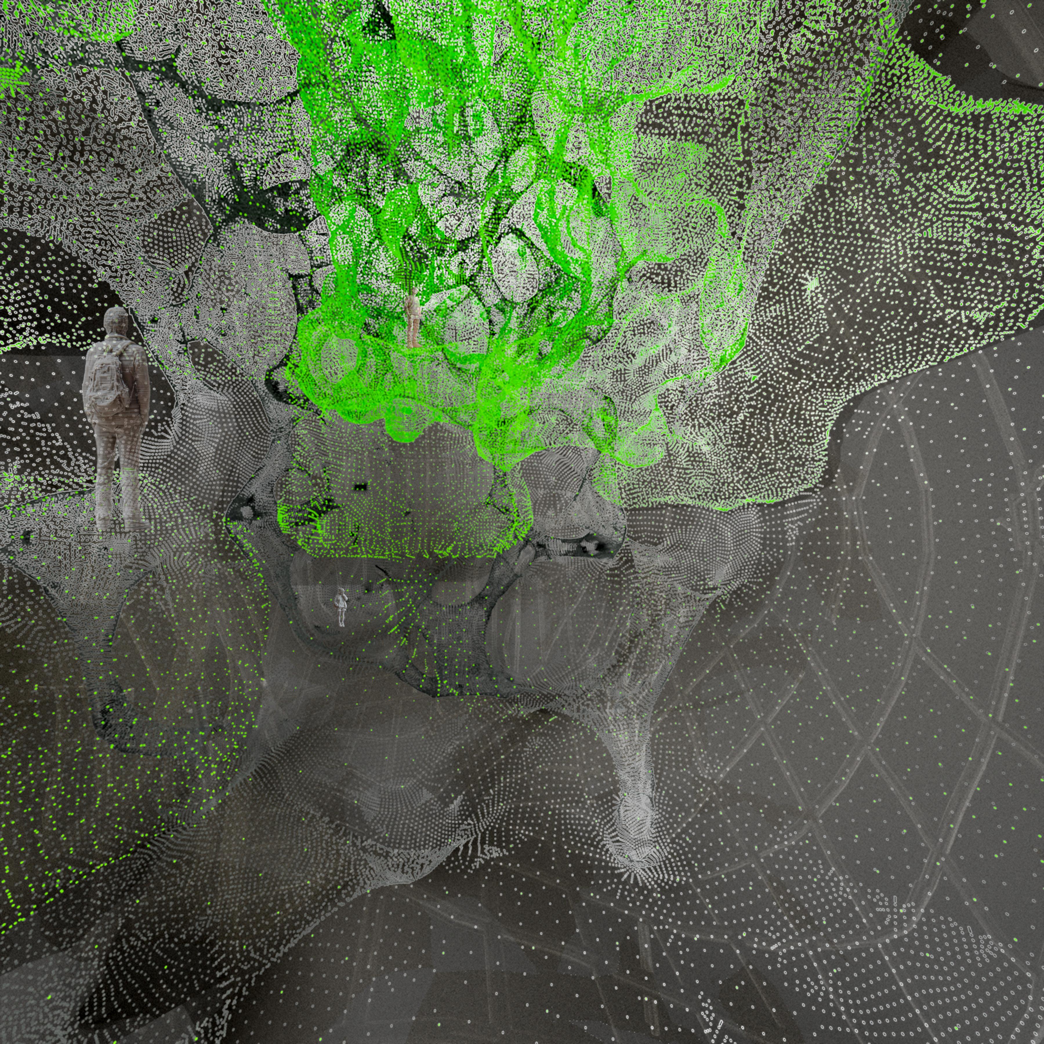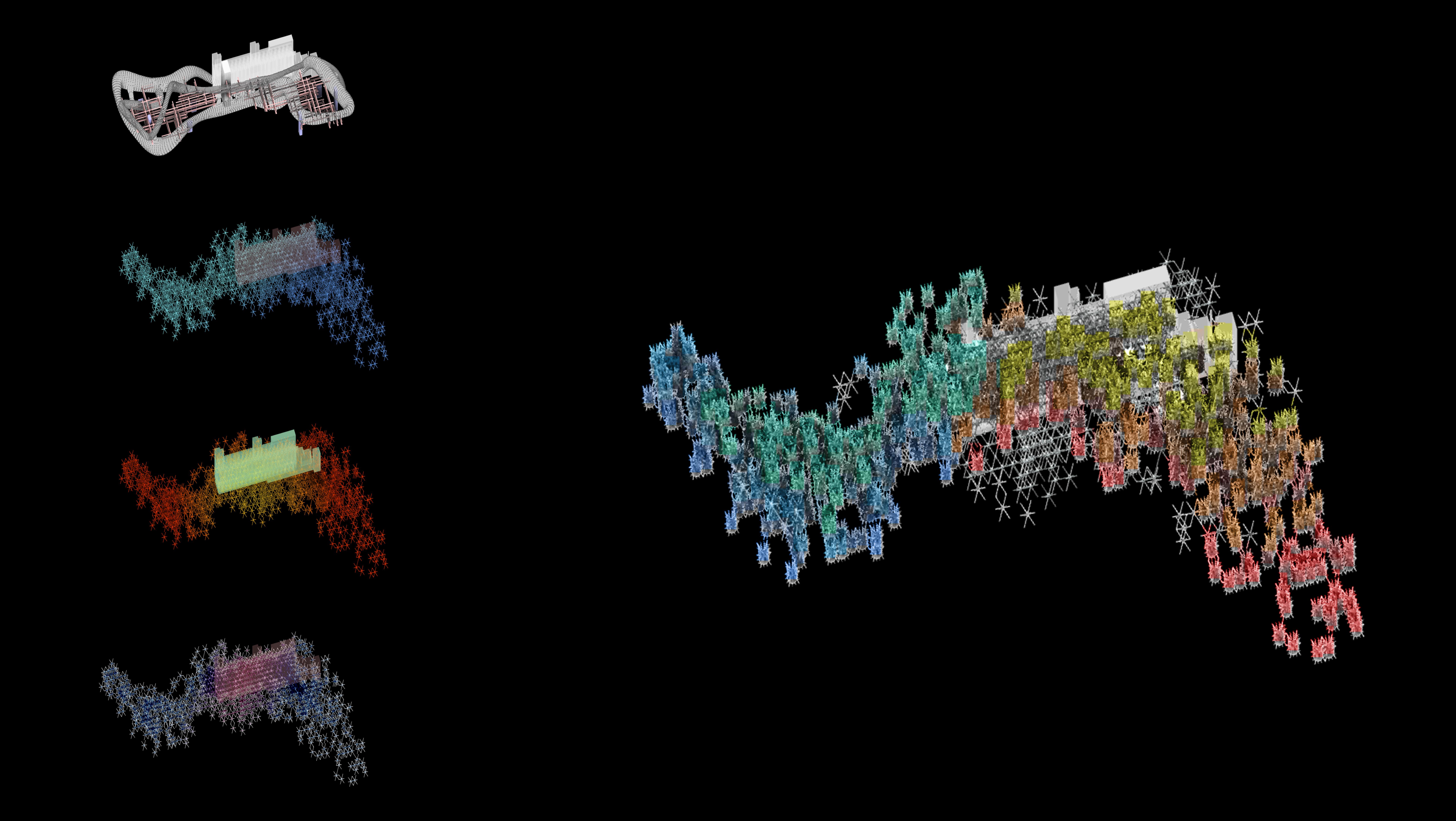 The project proposes using waste heat from a data center inserted into abandoned silos to support vertical farming. Early concepts were developed through 3D scans of physical models, shown on the left, which explored how heat pipes could run beneath layers of concrete skin and work with mechanical ventilation to produce multiple environmental zones. Subsequent studies in Rhino and Grasshopper tested formal and material possibilities, eventually developing into a vertical farming system based primarily on hydroponics and climate analysis.