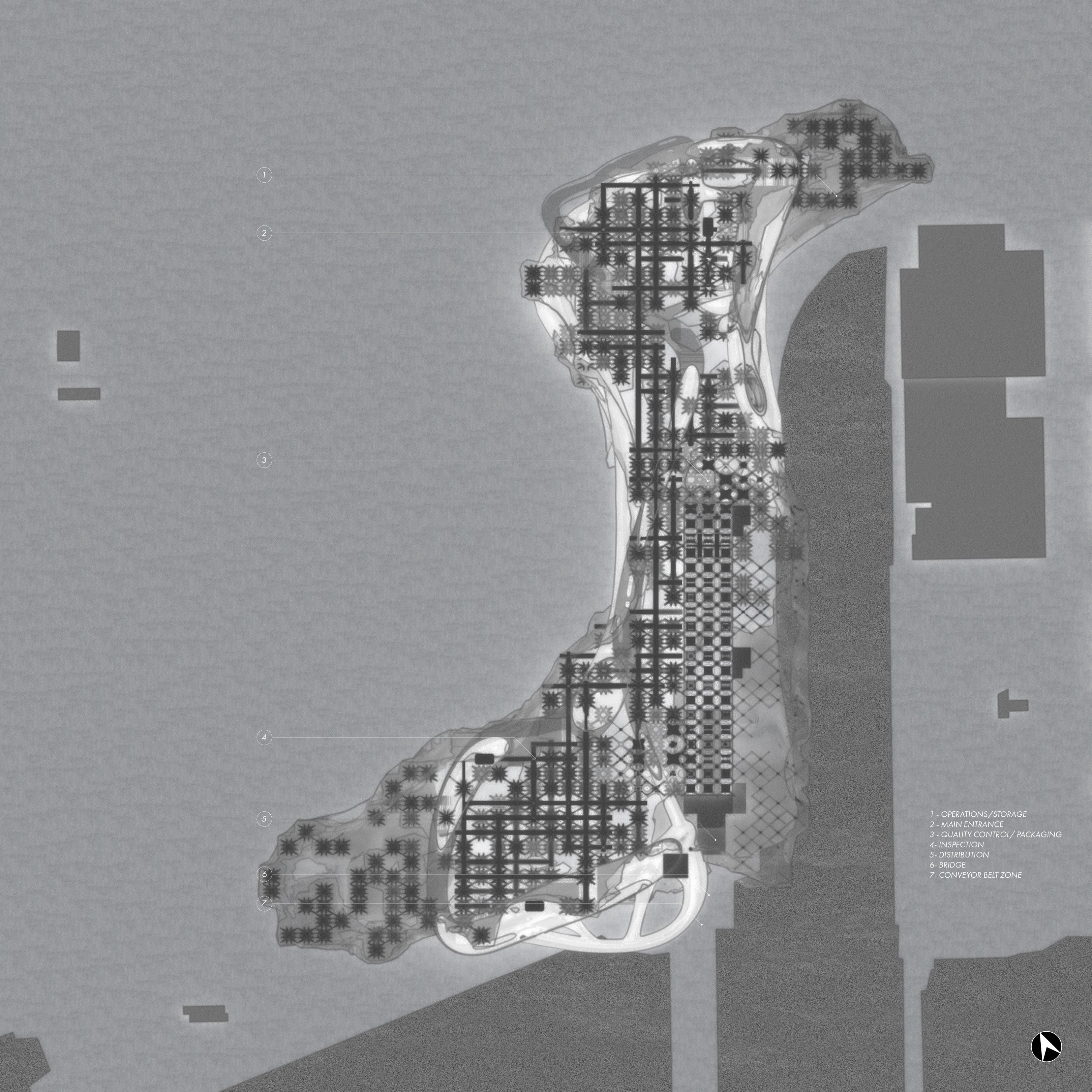 Dense clusters mark naturally more humid conditions for enclosed greenhouses; sparse areas remain drier and are reserved for support spaces, labs, and service
