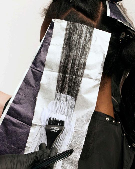 2. Take the hair left out between the foils and saturate the lightener on the ends blending upwards towards the root for a diffused result.