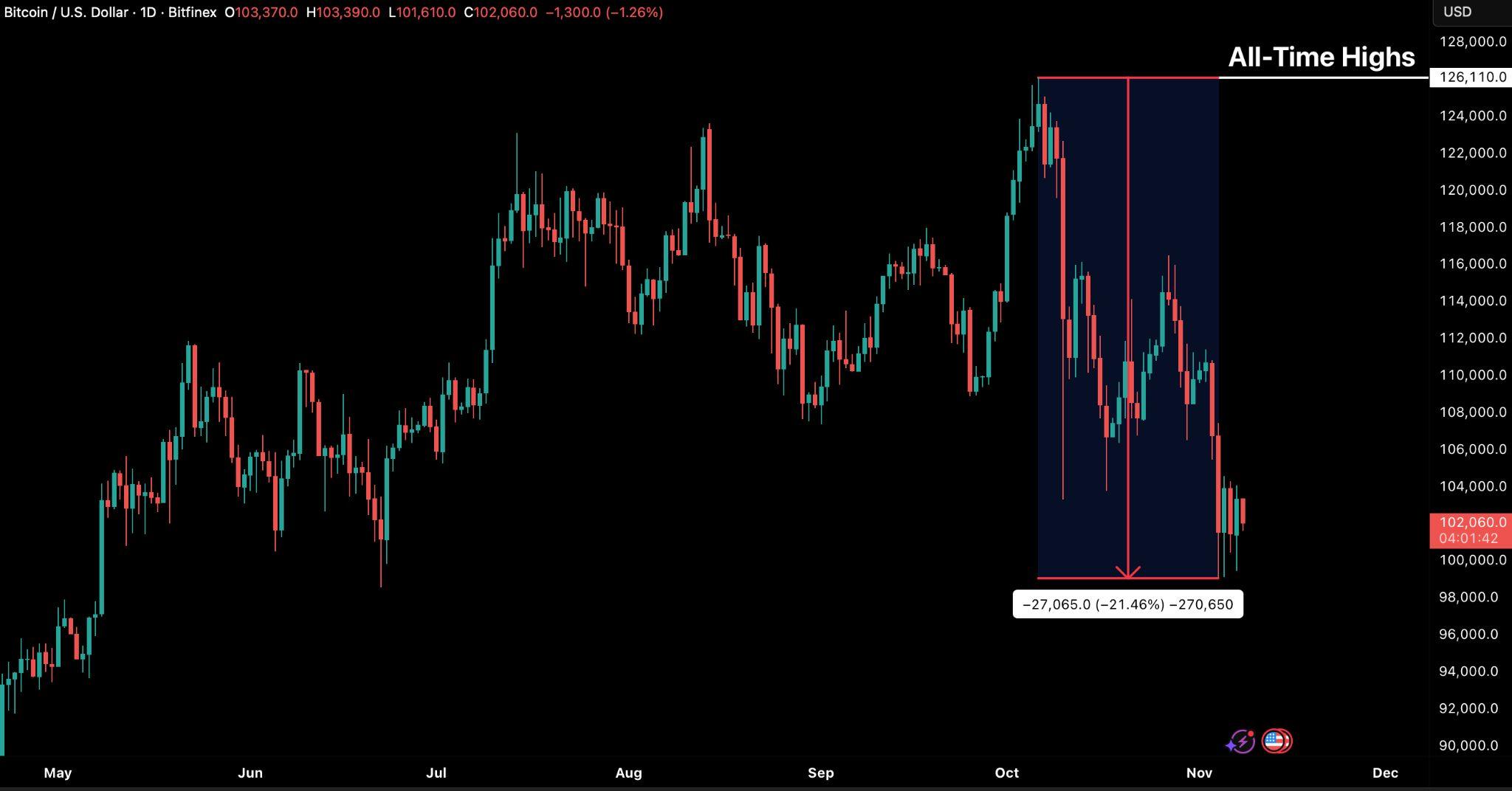 Như dự đoán trước đó, việc Bitcoin không thể trụ vững trên vùng 107.000108.000USD—điểmhợplưugiữatínhiệukỹthuậtvàdữliệuon-chain —đãmồichocúrơixuốngdướimốc100.000USD.