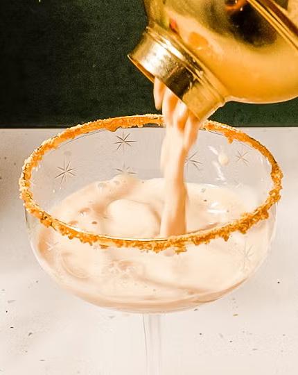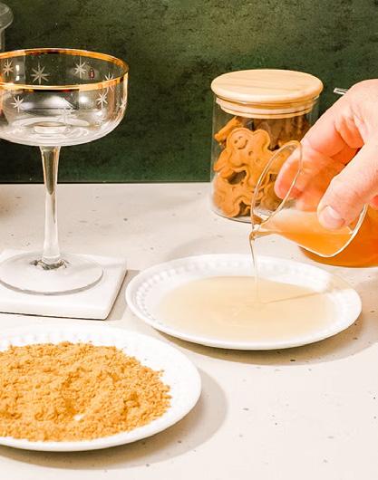 • Place crushed cookies on a small shallow plate. Pour some gingerbread syrup onto another shallow plate. Dip rim of a martini glass into gingerbread syrup, then dip into cookies to coat.