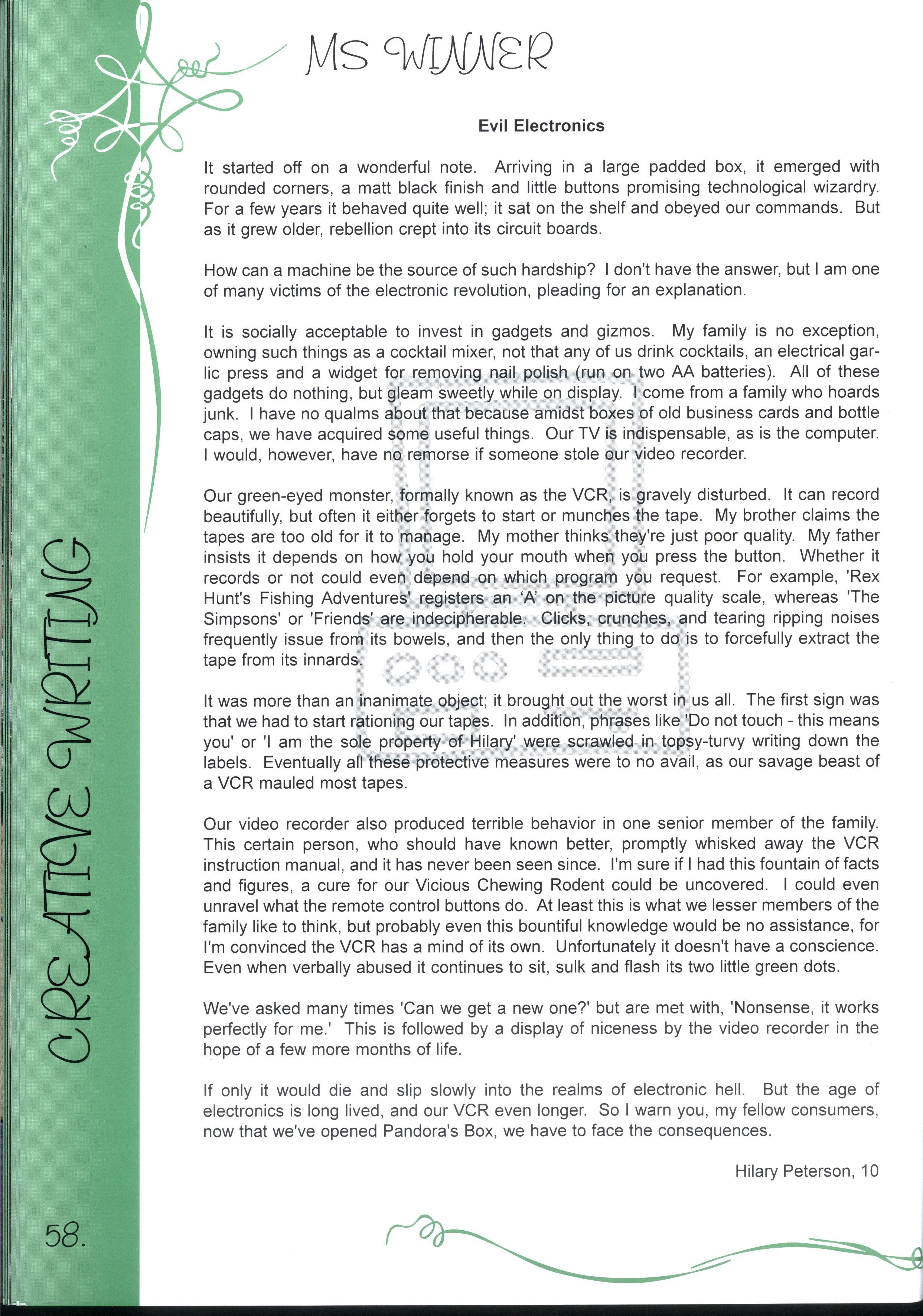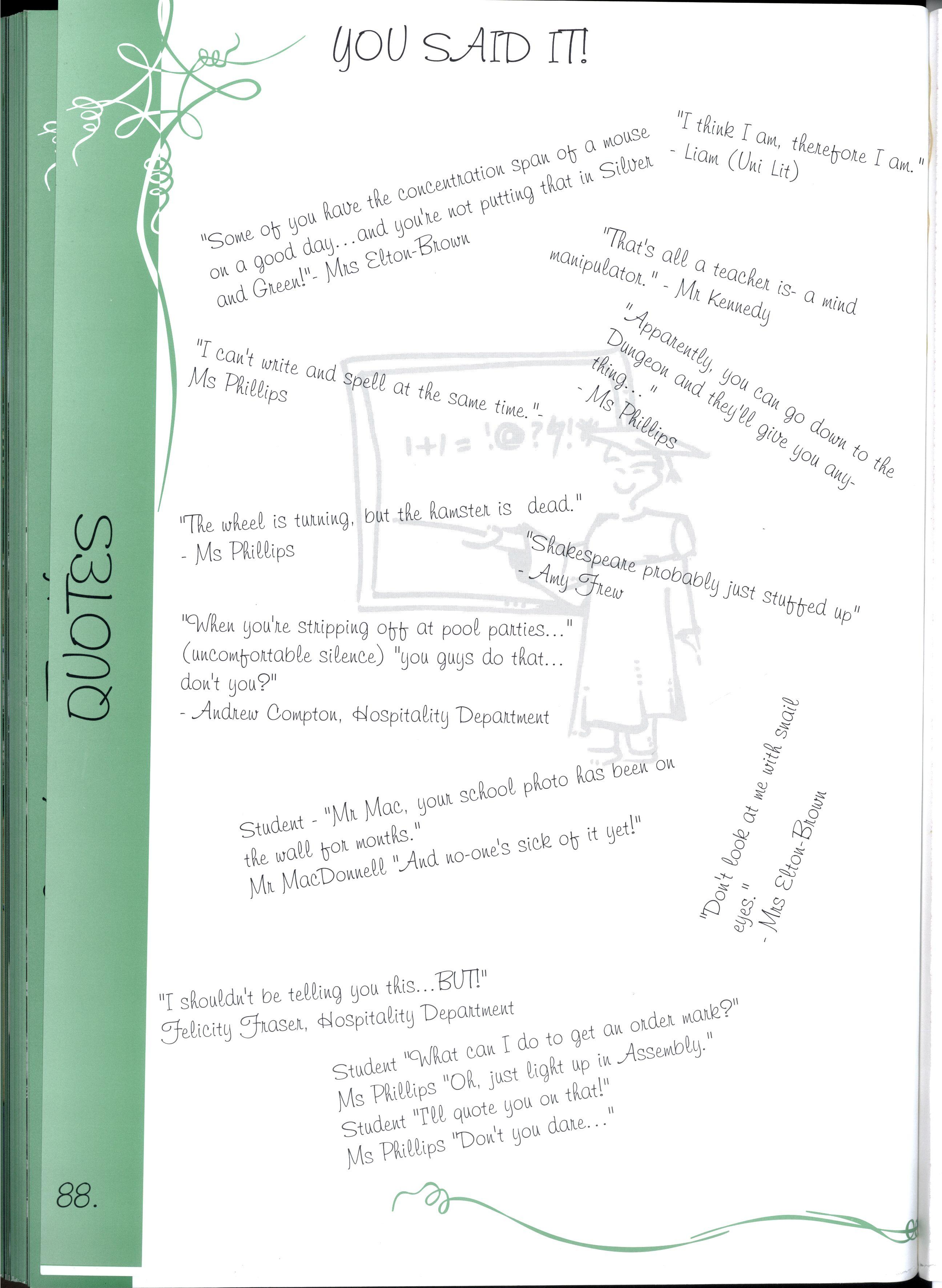 The major editing session of Silver and Green takes place at a very decisive time of year. In many ways, it really is the psychological end of Secondary Education for the Year 12s It's the time of year when you enter your University preferences, scholarship forms and brush up your folio So it's not surprising that Year 12s start to get nostalgic and reflect upon where we've come from and question where we are going