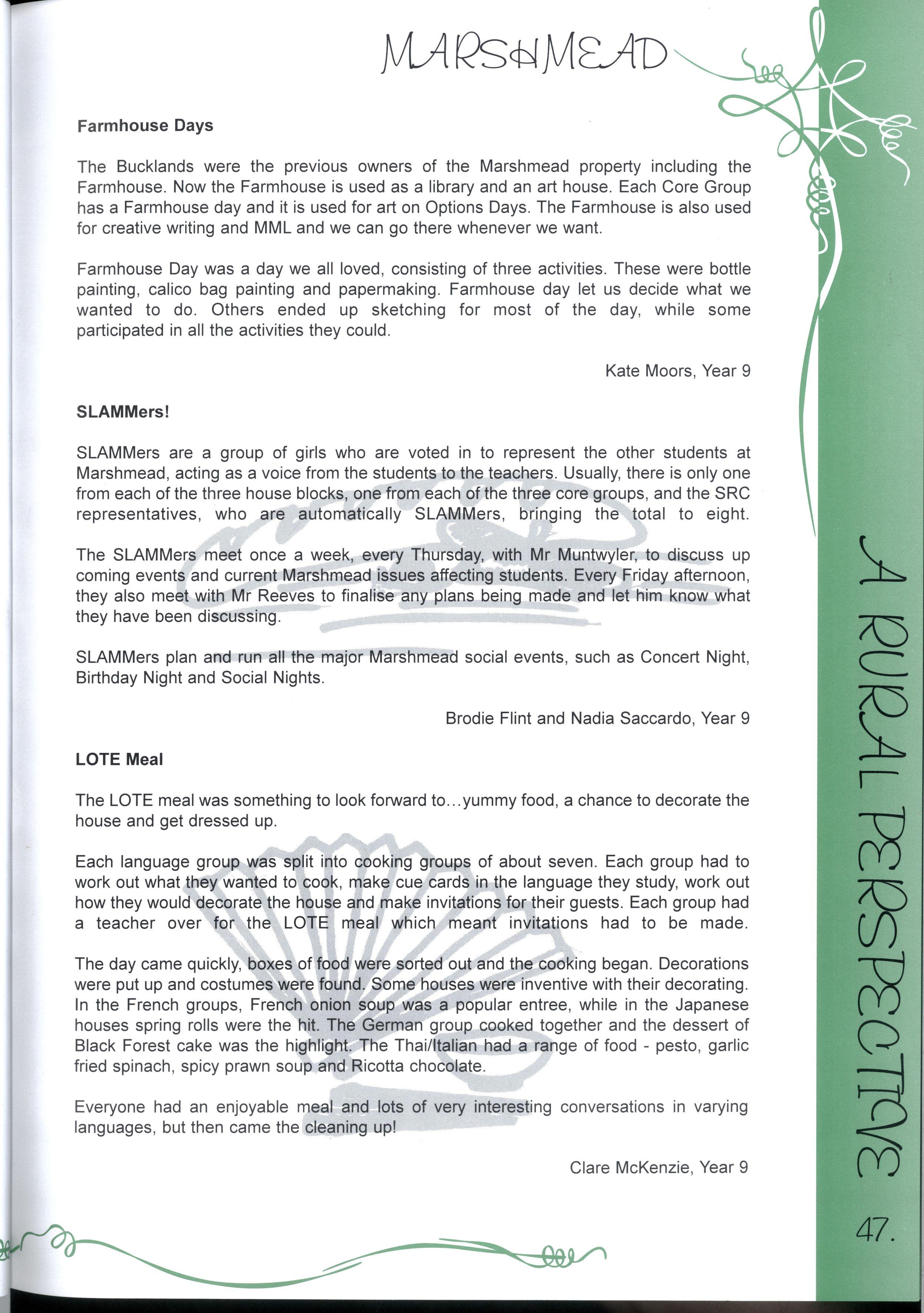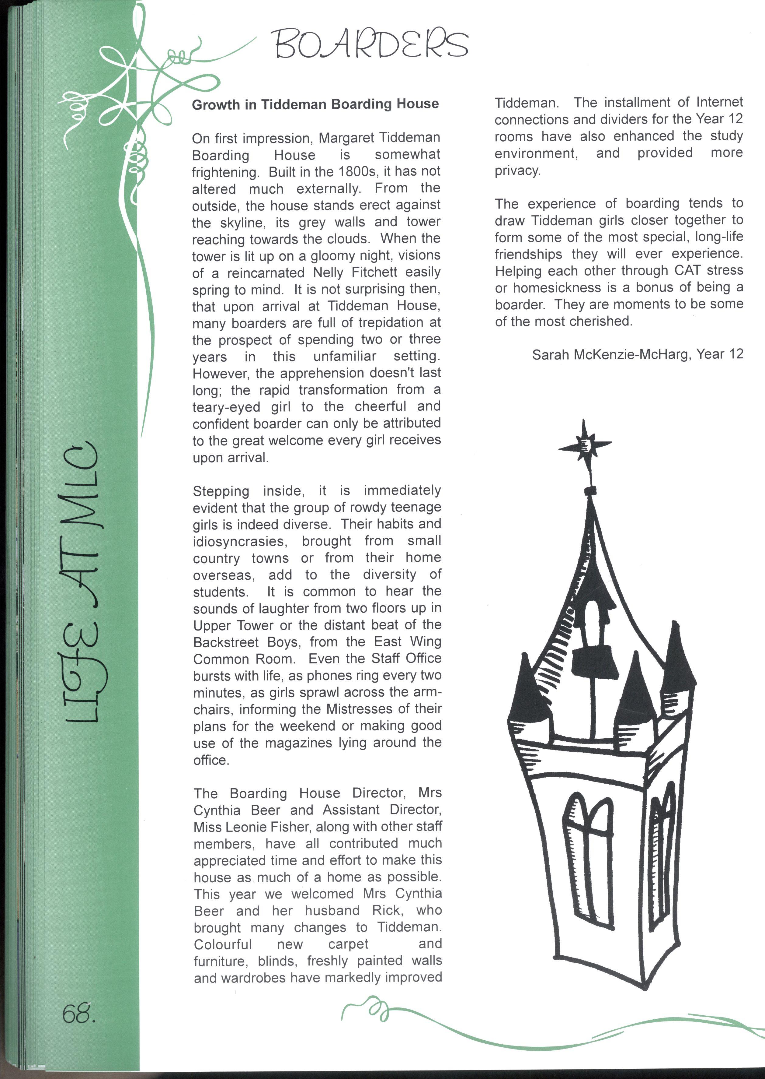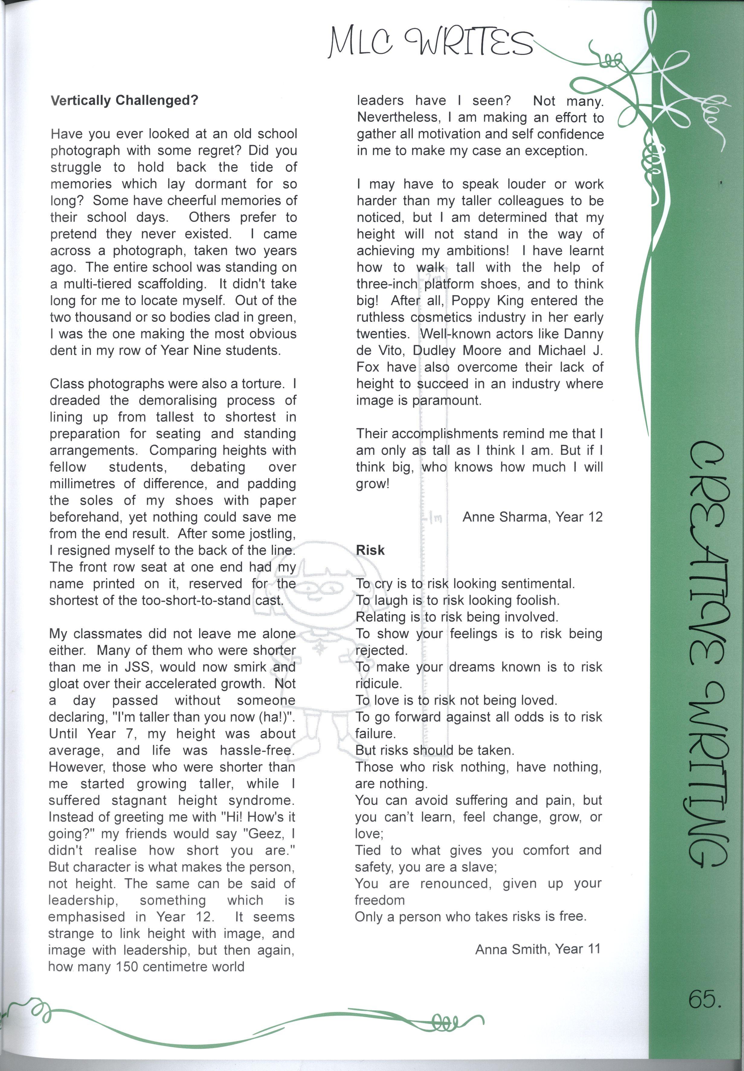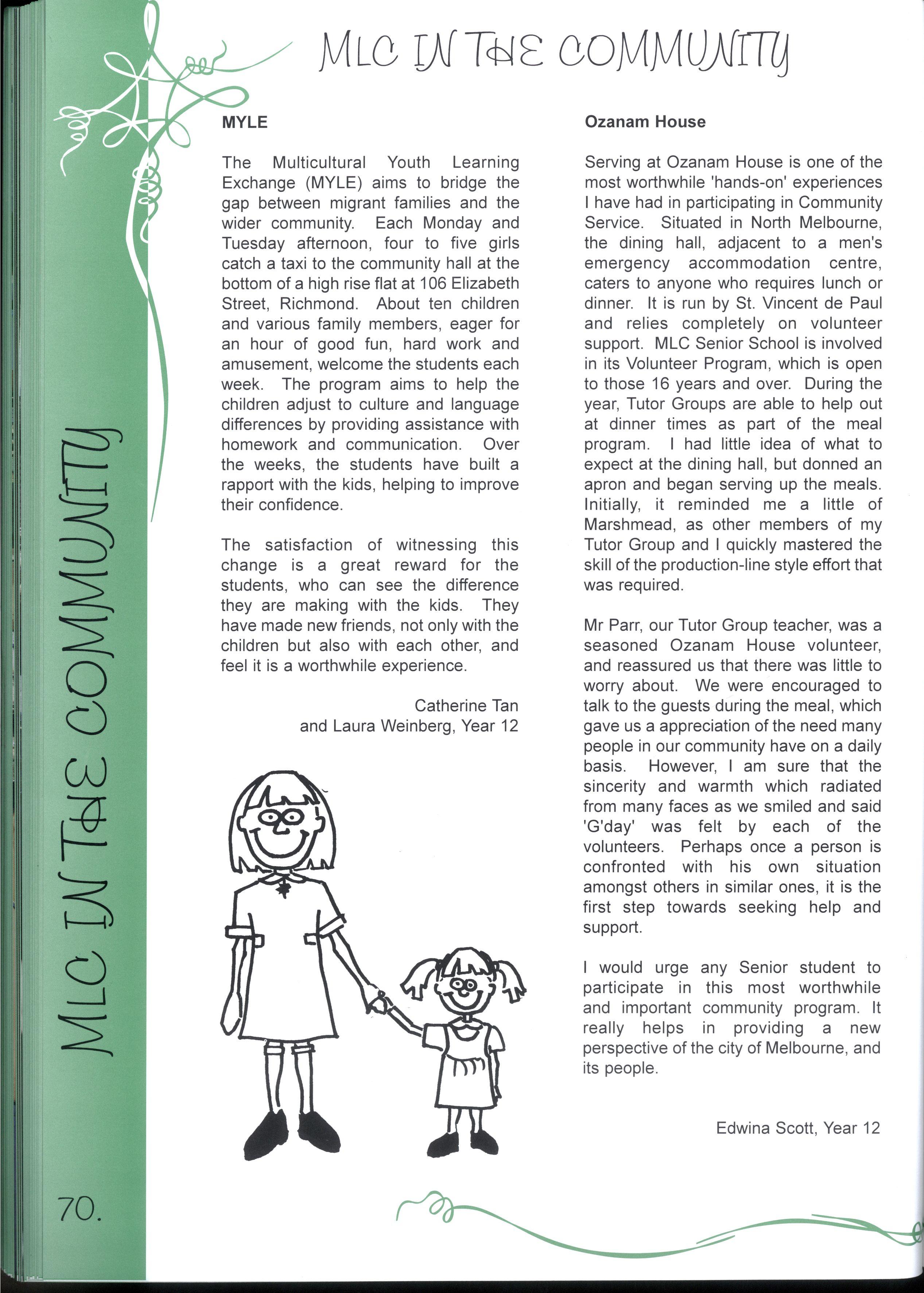 The chance to edit a magazine representing over two thousand students and more than three hundred teachers was just one of the many fantastic opportunities we have enjoyed as students at this college.Our years at MLC have been full of excitement, joy, learning and challenges making a rich and colourful experience It's not just the opportunities, the facilities and the range of choices, it's also the people who have made our education such a pleasure Teachers staying back after school and on weekends to help with CATs, participating in teacher/student sports matches despite sometimes being unable to run, swim, kick, jump or even just coordinate four limbs - these things symbolise the support we have received The friends, who have entertained us for years in various corridors, shared Marshmead with us and sat through endless explanations of Mendel's Second Law or the principle of conservation of mass, have completed the picture