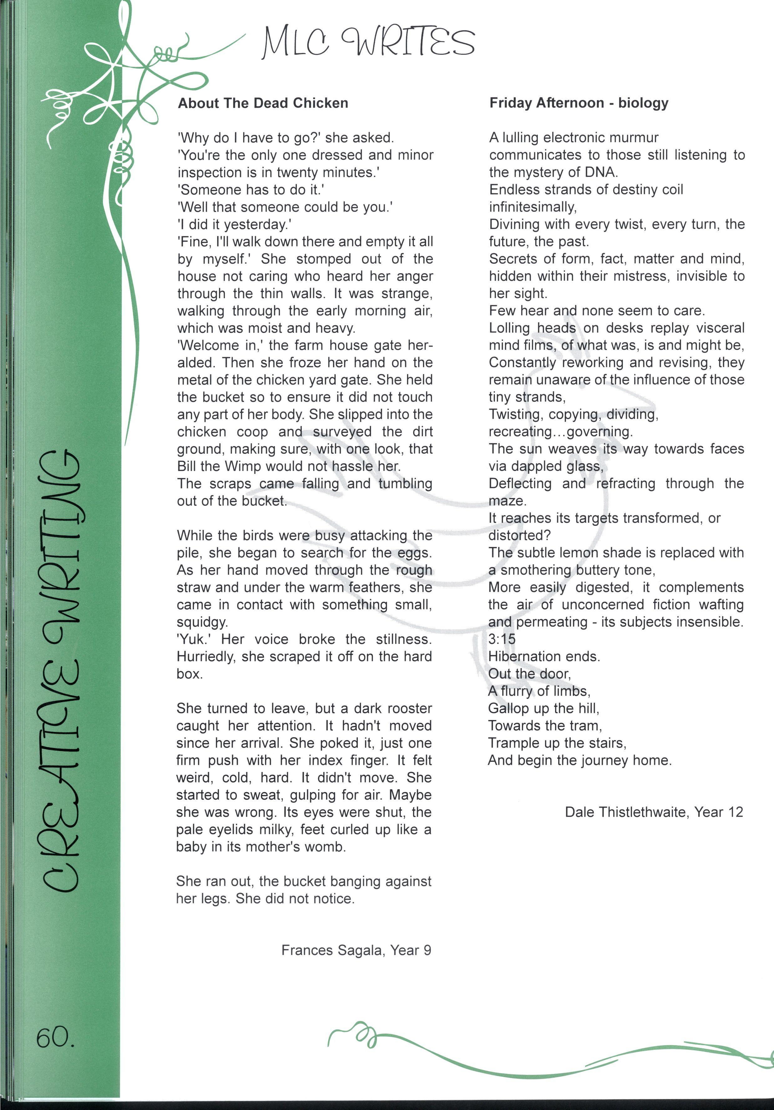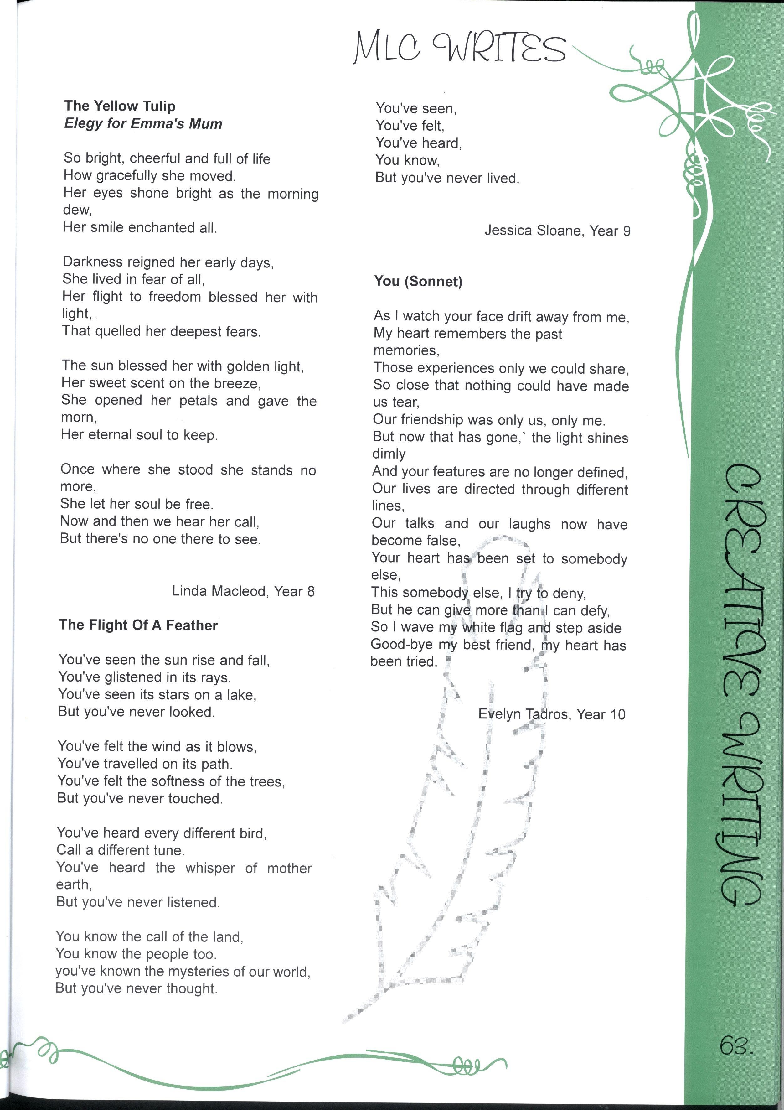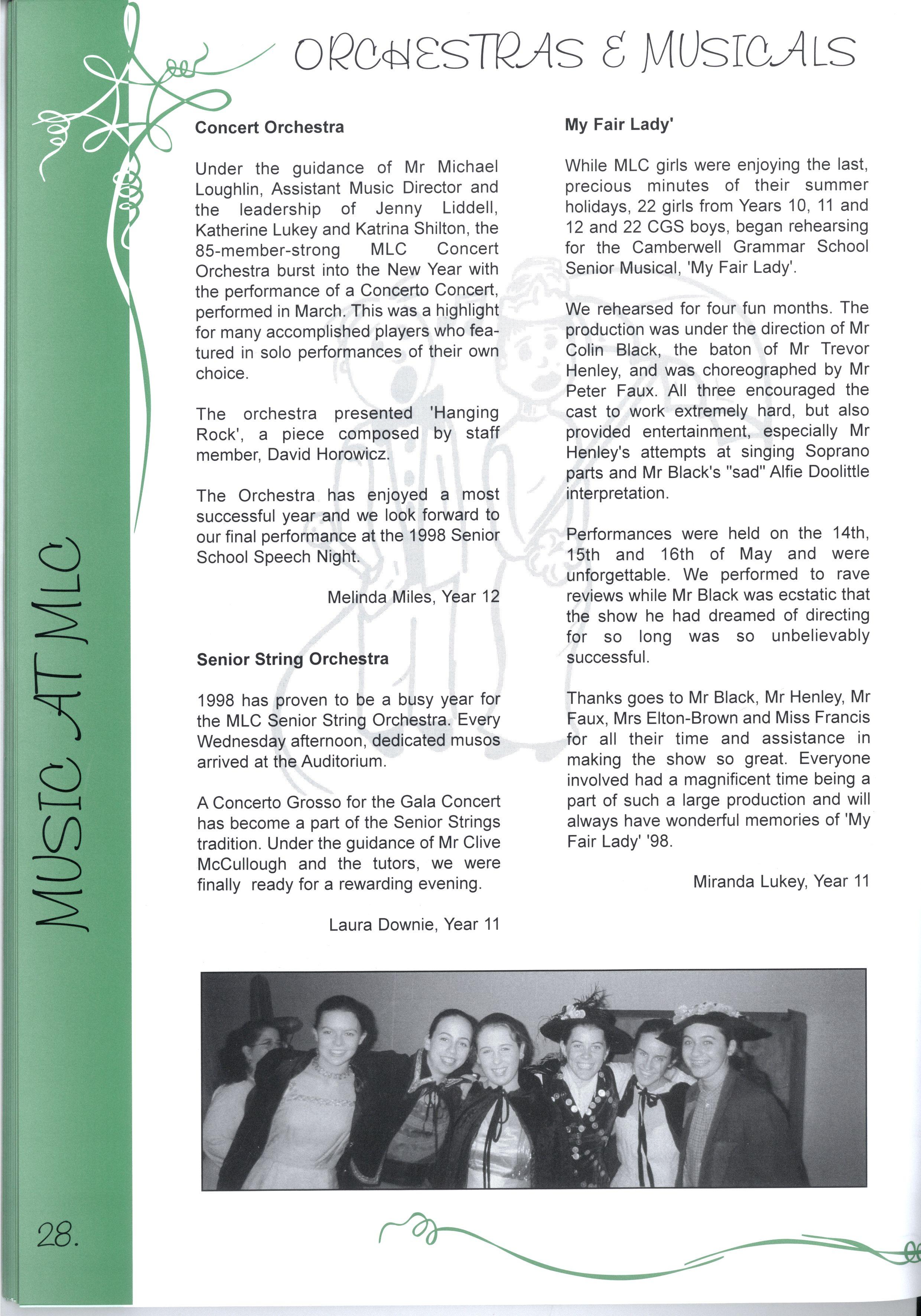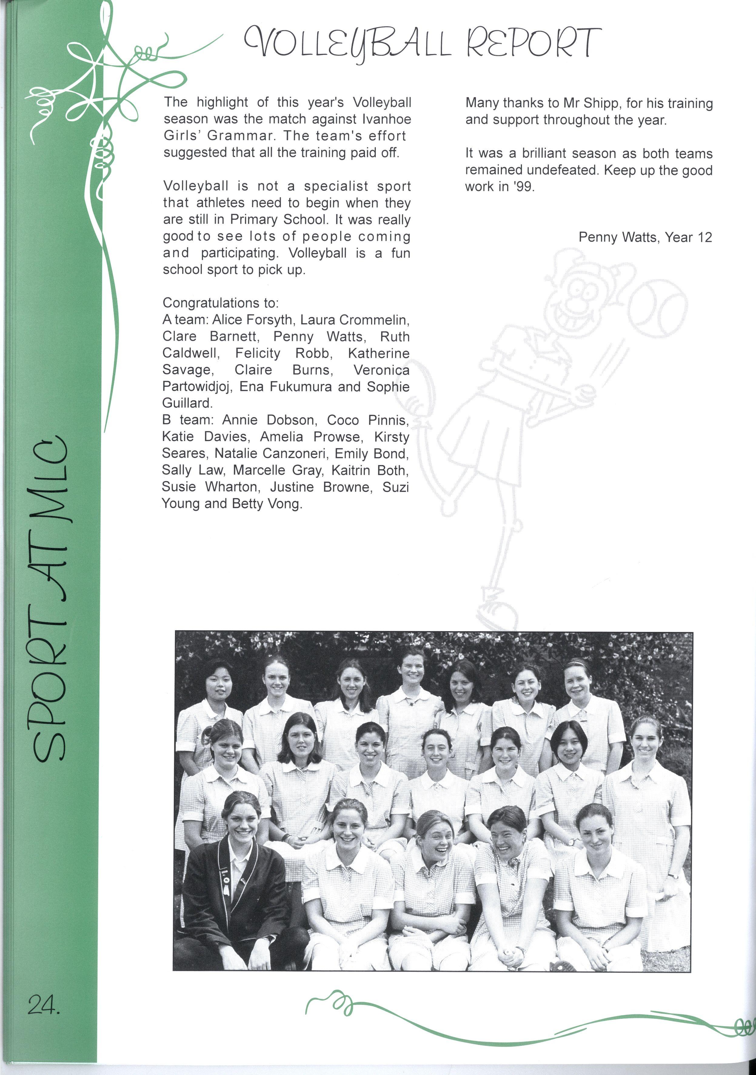 The chance to edit a magazine representing over two thousand students and more than three hundred teachers was just one of the many fantastic opportunities we have enjoyed as students at this college.Our years at MLC have been full of excitement, joy, learning and challenges making a rich and colourful experience It's not just the opportunities, the facilities and the range of choices, it's also the people who have made our education such a pleasure Teachers staying back after school and on weekends to help with CATs, participating in teacher/student sports matches despite sometimes being unable to run, swim, kick, jump or even just coordinate four limbs - these things symbolise the support we have received The friends, who have entertained us for years in various corridors, shared Marshmead with us and sat through endless explanations of Mendel's Second Law or the principle of conservation of mass, have completed the picture