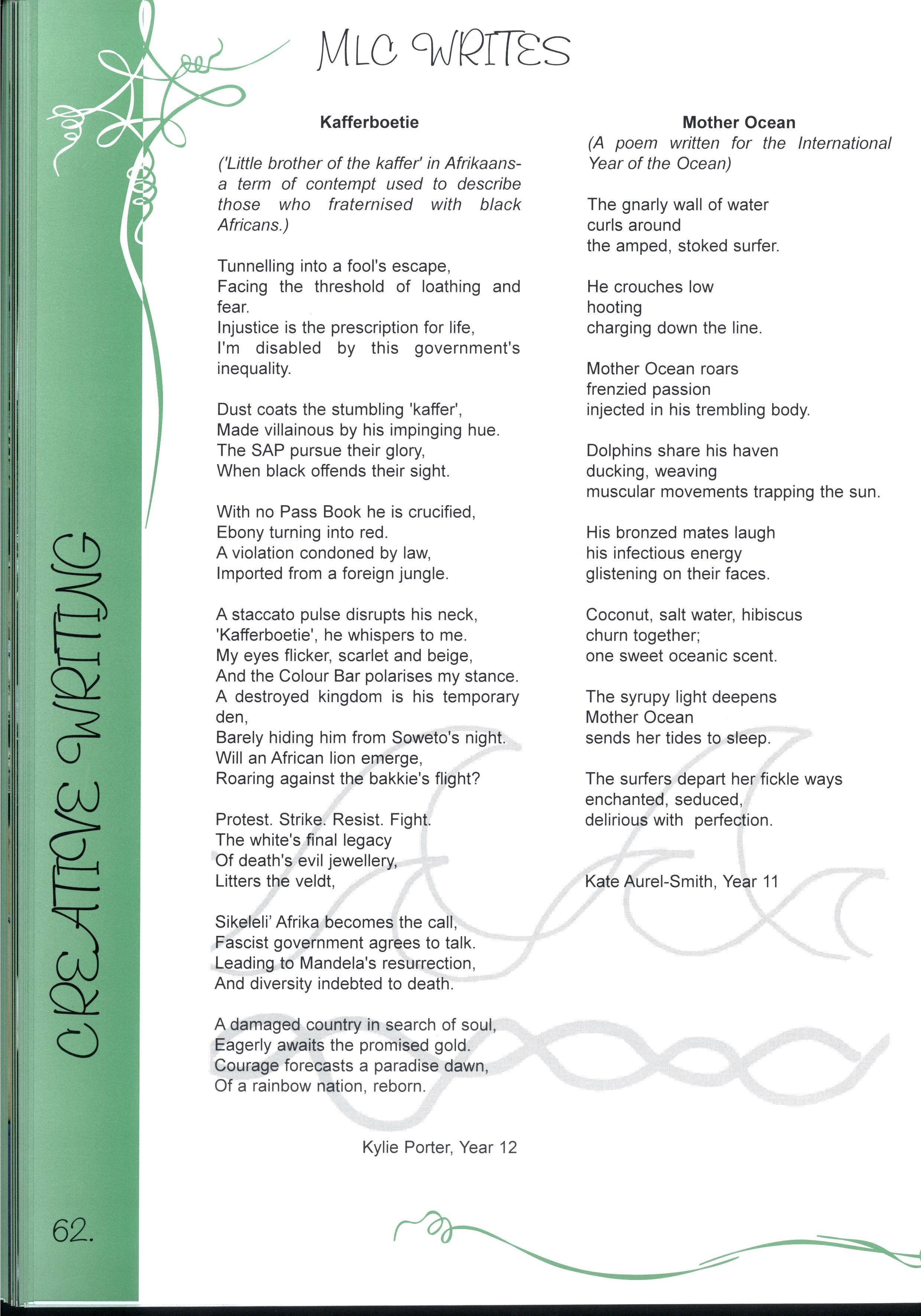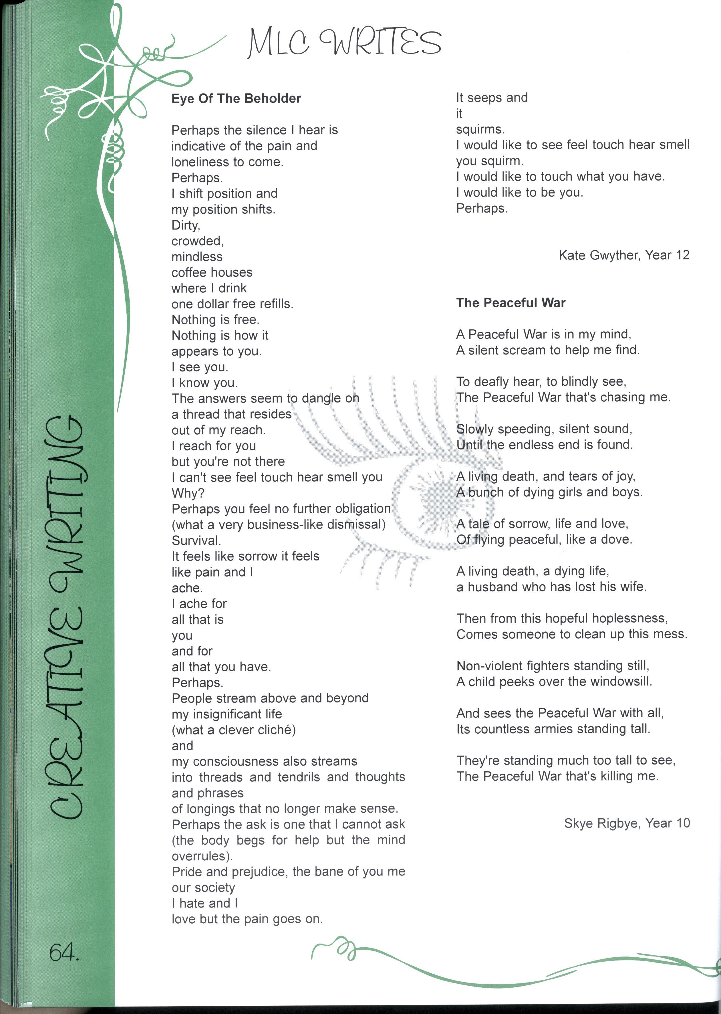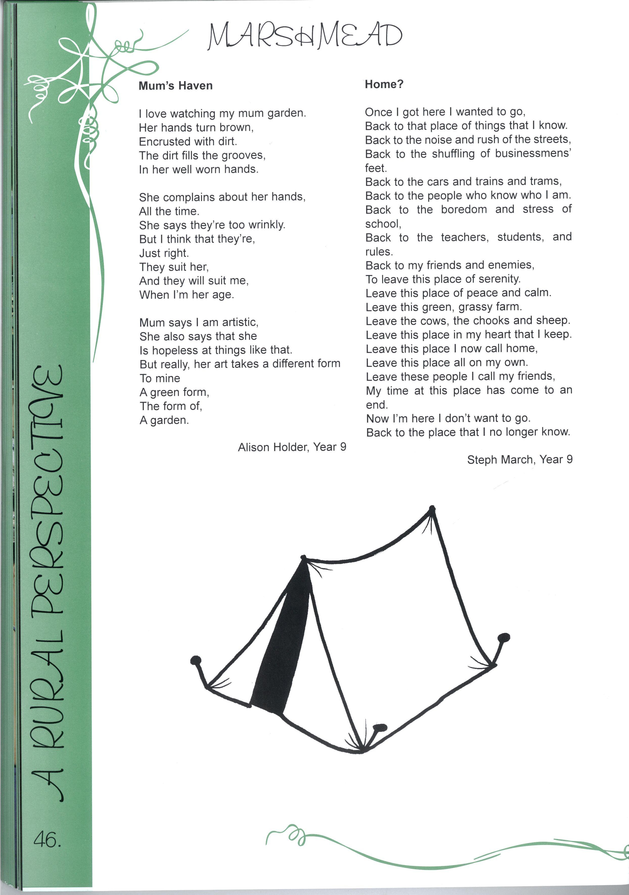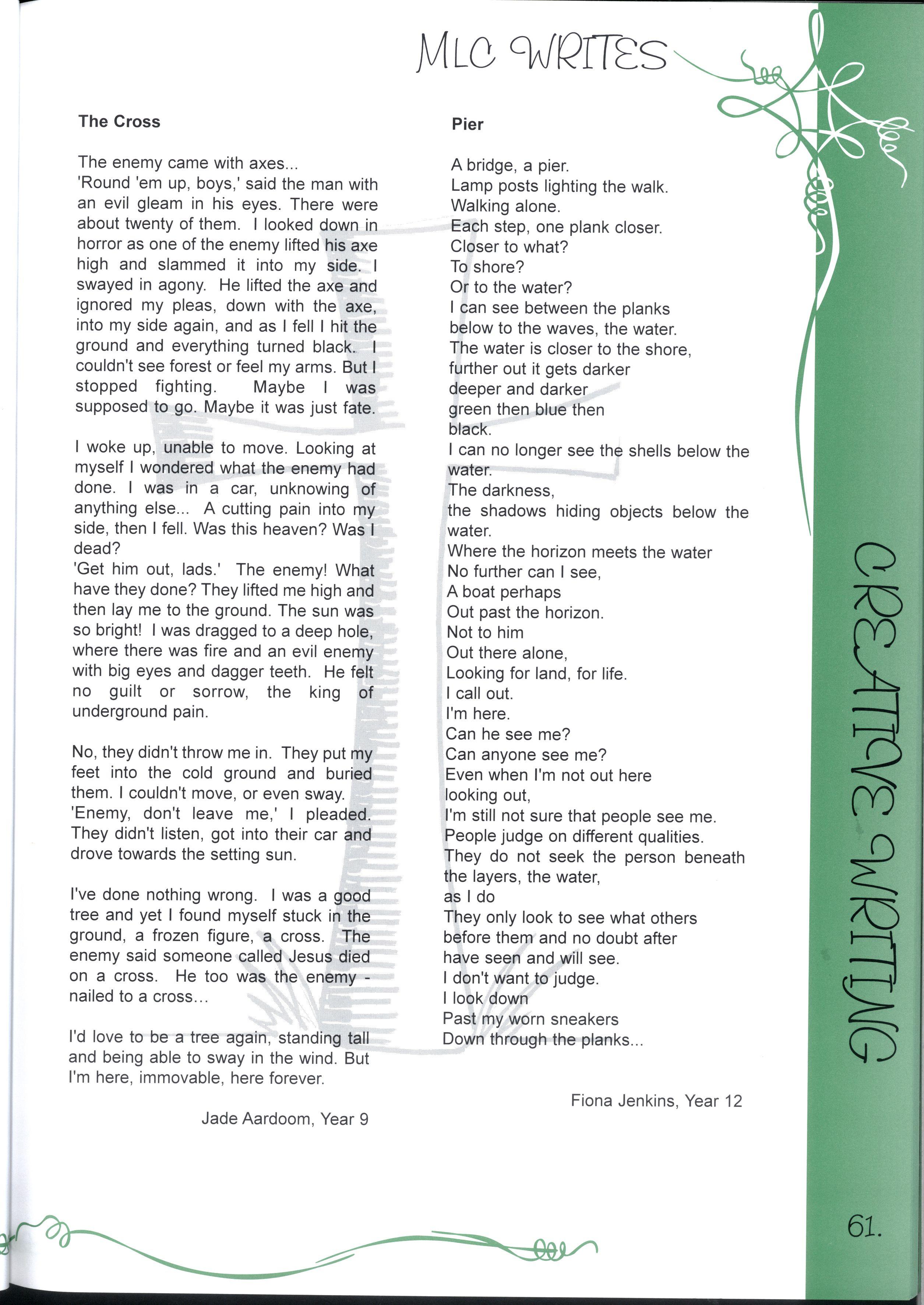 The chance to edit a magazine representing over two thousand students and more than three hundred teachers was just one of the many fantastic opportunities we have enjoyed as students at this college.Our years at MLC have been full of excitement, joy, learning and challenges making a rich and colourful experience It's not just the opportunities, the facilities and the range of choices, it's also the people who have made our education such a pleasure Teachers staying back after school and on weekends to help with CATs, participating in teacher/student sports matches despite sometimes being unable to run, swim, kick, jump or even just coordinate four limbs - these things symbolise the support we have received The friends, who have entertained us for years in various corridors, shared Marshmead with us and sat through endless explanations of Mendel's Second Law or the principle of conservation of mass, have completed the picture