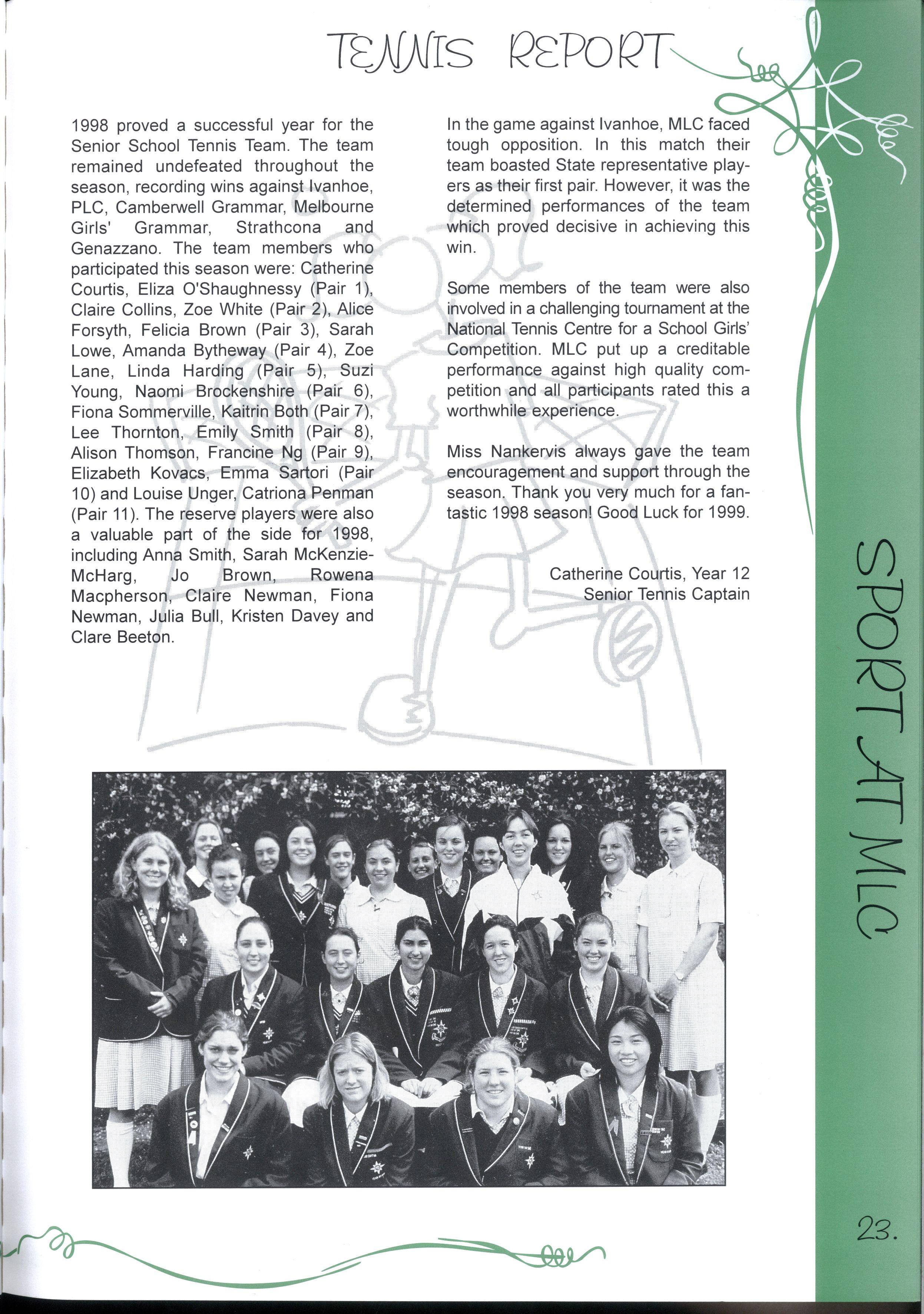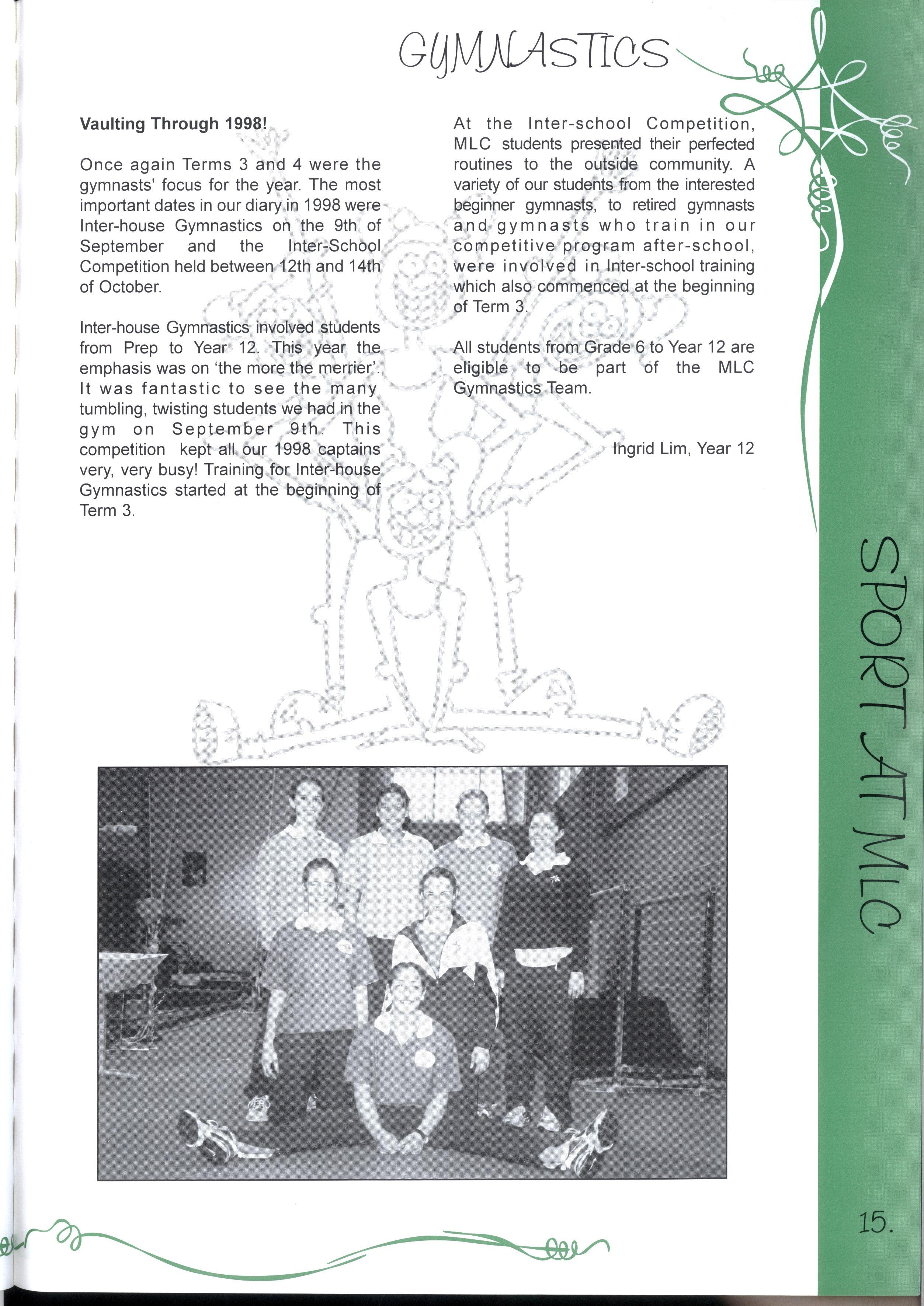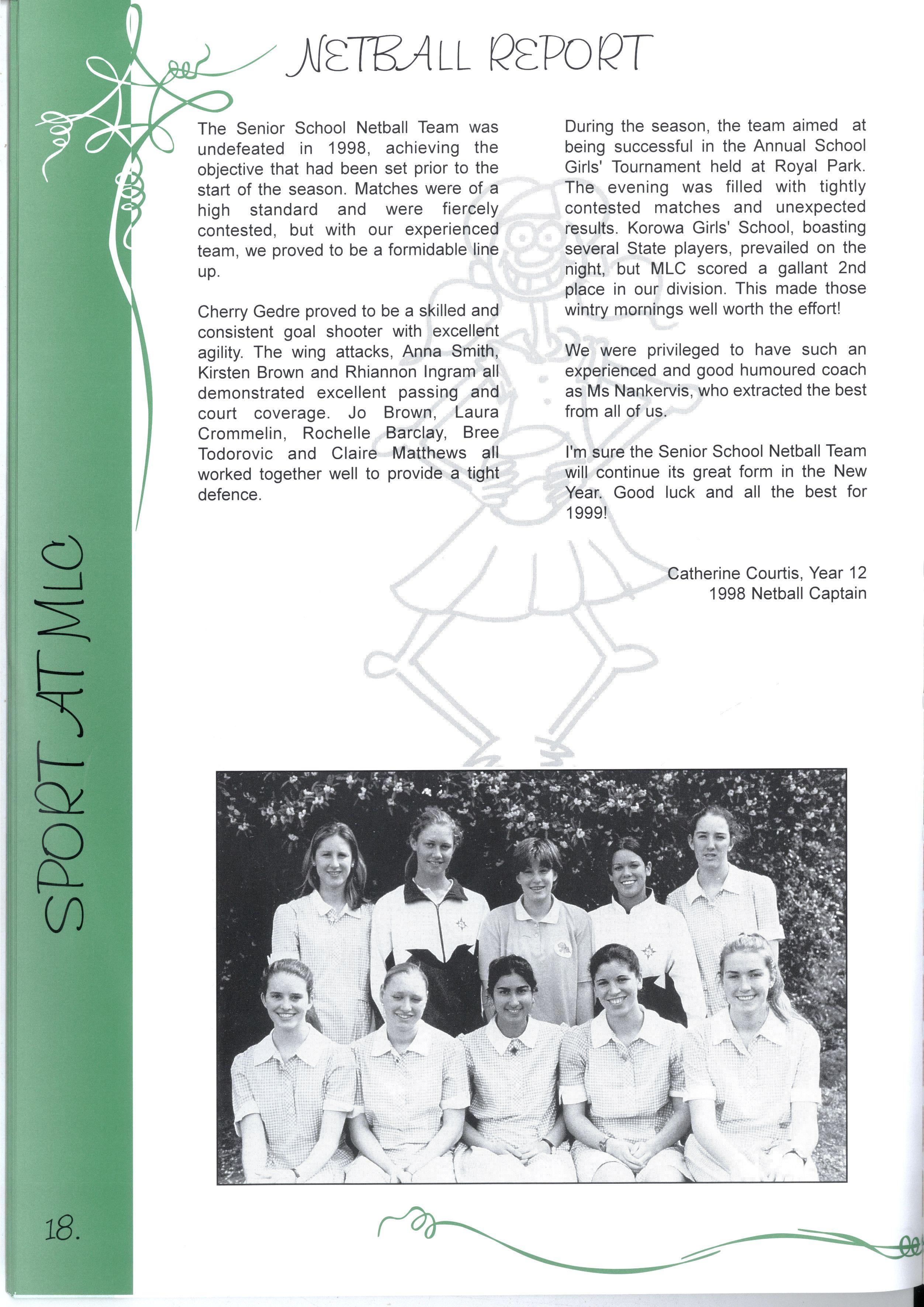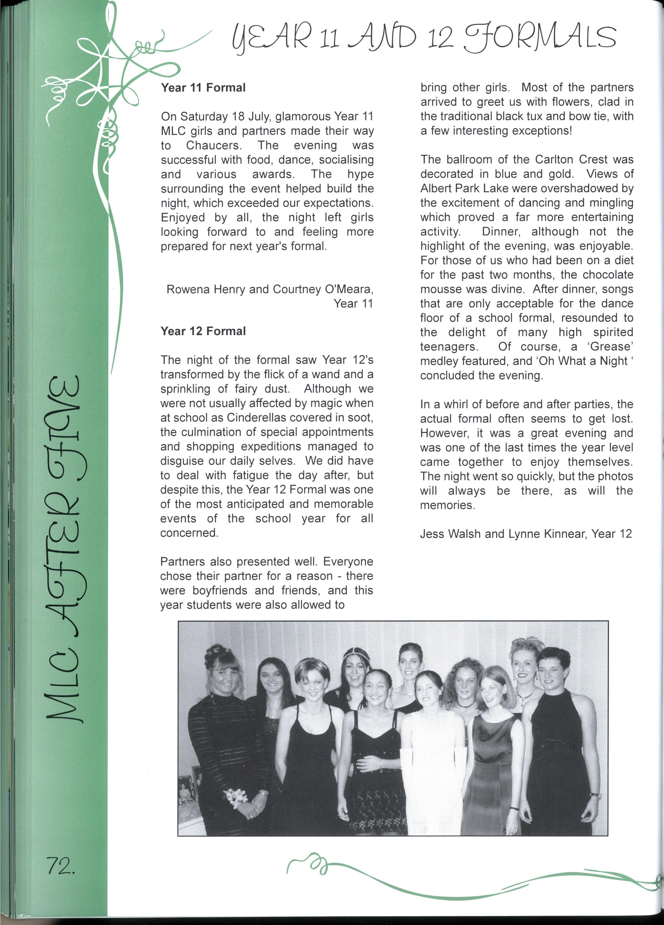 The Year 12's of 1998 are now the 'senior citizens' of the MLC community For many years, MLC has been their home and has provided support and friendship Whilst it is challenging to move to new and unfamiliar places, we know that we have been equipped with the skills to do our best, and face any challenges that we encounter in life Thank you to our year level and MLC for the opportunities we have had to discover ourselves, and all our best wishes for the future
