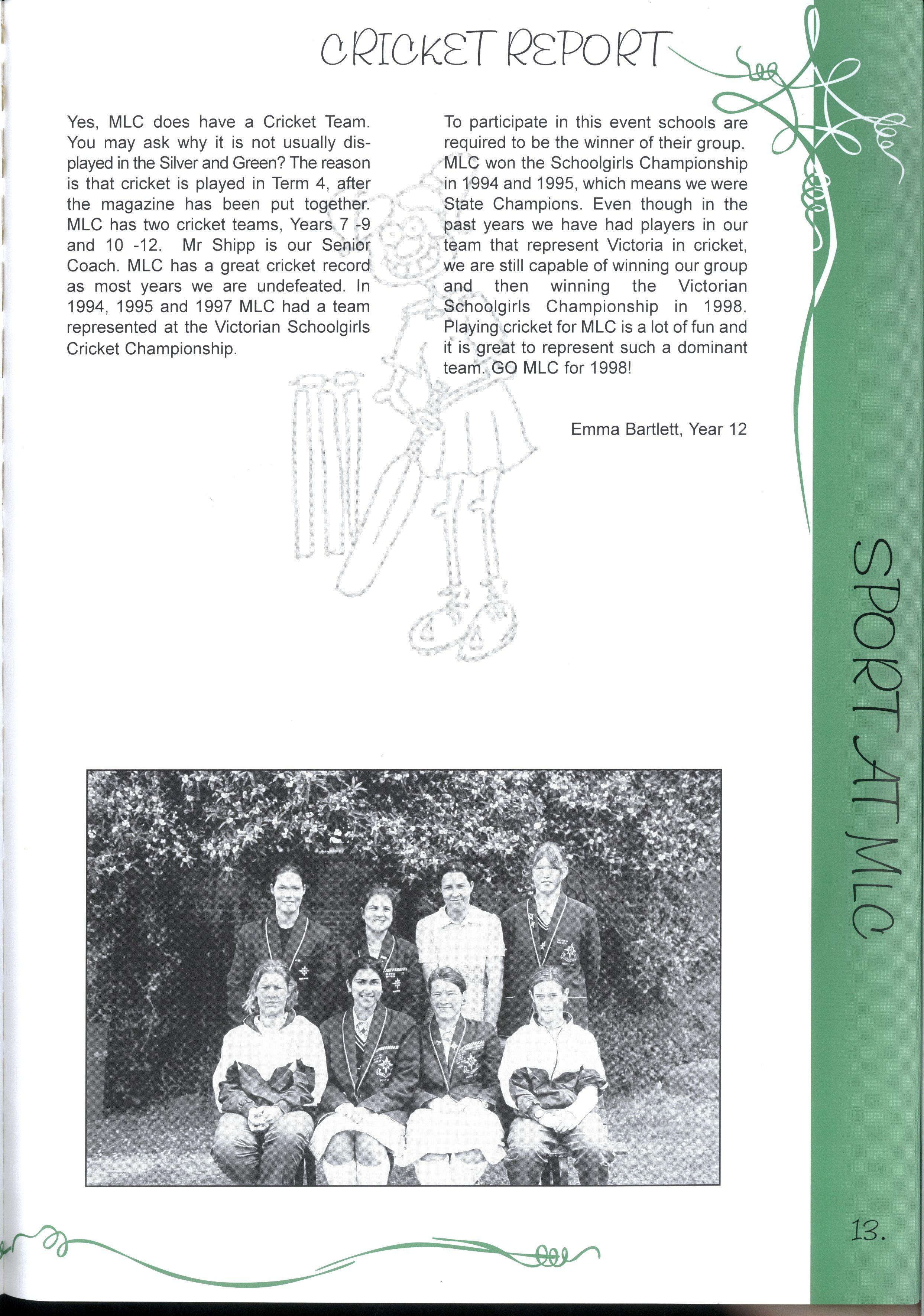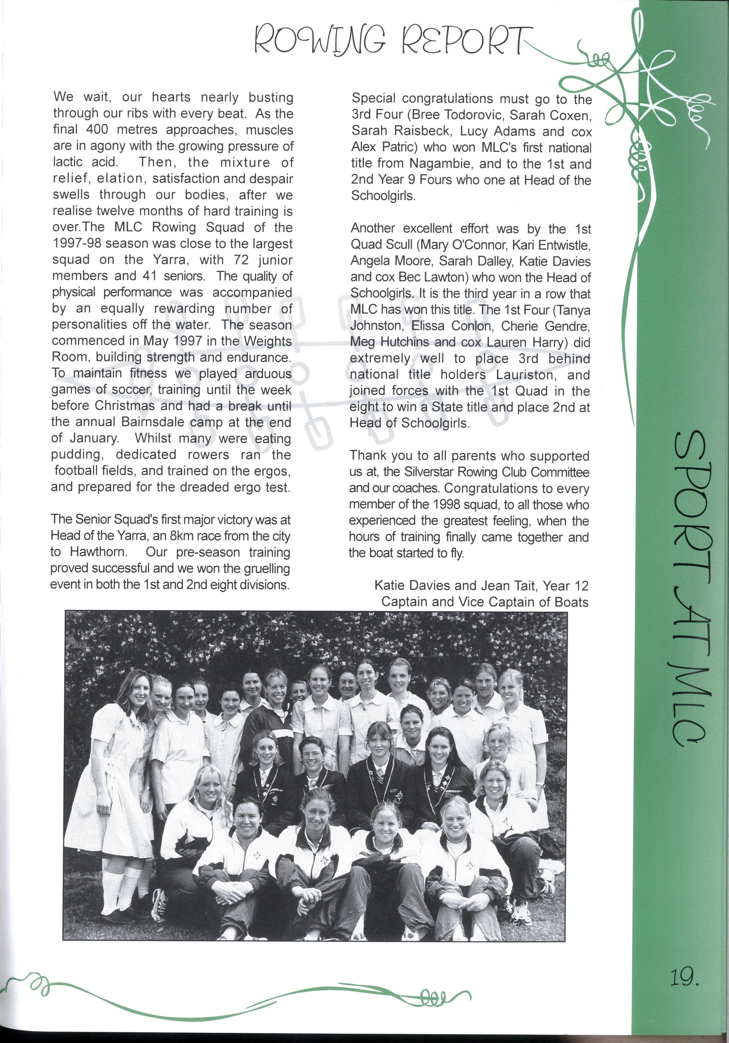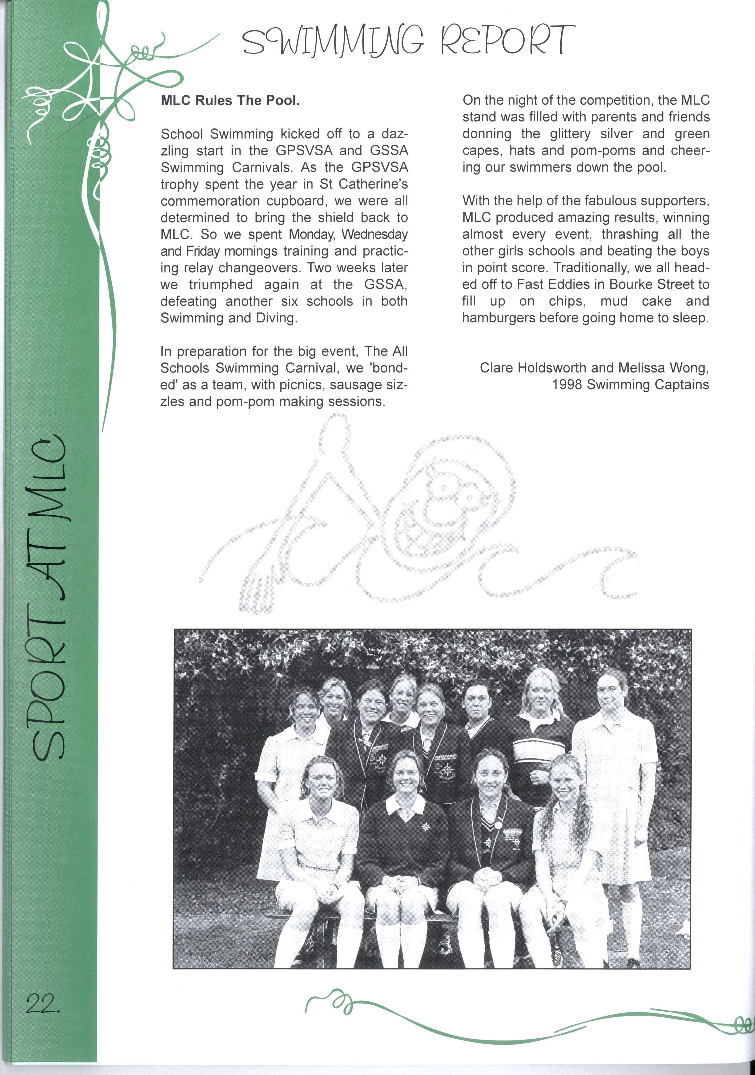 The Year 12's of 1998 are now the 'senior citizens' of the MLC community For many years, MLC has been their home and has provided support and friendship Whilst it is challenging to move to new and unfamiliar places, we know that we have been equipped with the skills to do our best, and face any challenges that we encounter in life Thank you to our year level and MLC for the opportunities we have had to discover ourselves, and all our best wishes for the future