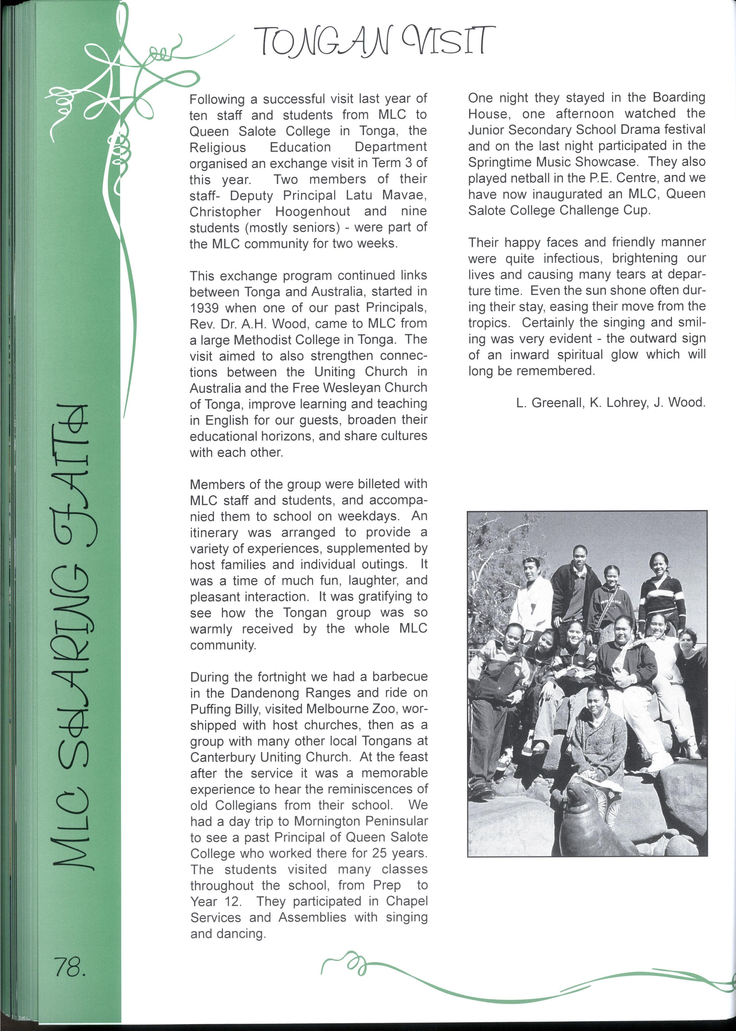 Members of the group were billeted with MLC staff and students, and accompanied them to school on weekdays An itinerary was arranged to provide a variety of experiences, supplemented by host families and individual outings It was a time of much fun, laughter, and pleasant interaction It was gratifying to see how the Tongan group was so warmly received by the whole MLC community