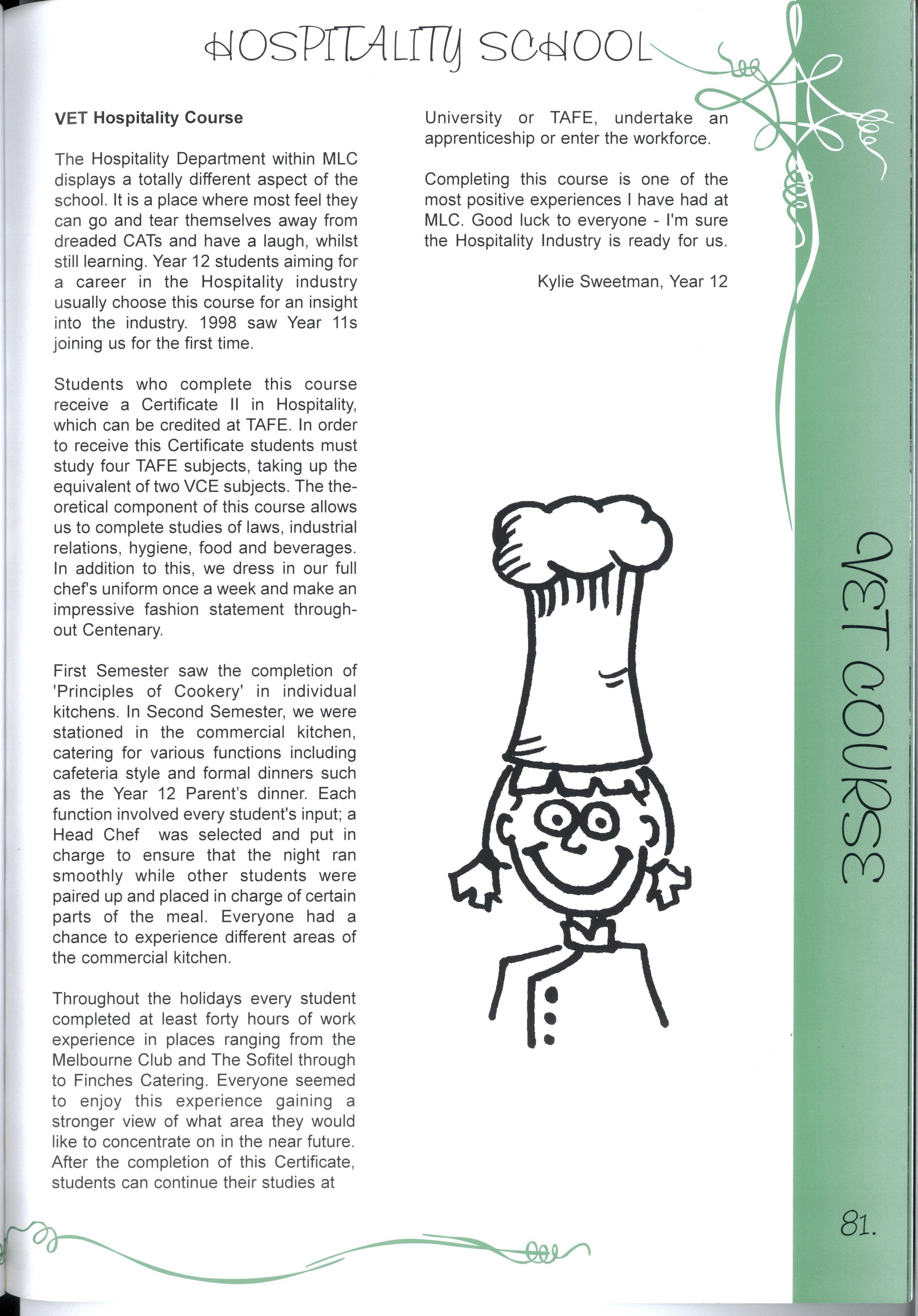 Students who complete this course receive a Certificate II in Hospitality, which can be credited at TAFE In order to receive this Certificate students must study four TAFE subjects, taking up the equivalent of two VCE subjects The theoretical component of this course allows us to complete studies of laws, industrial relations, hygiene, food and beverages In addition to this, we dress in our full chefs uniform once a week and make an impressive fashion statement throughout Centenary