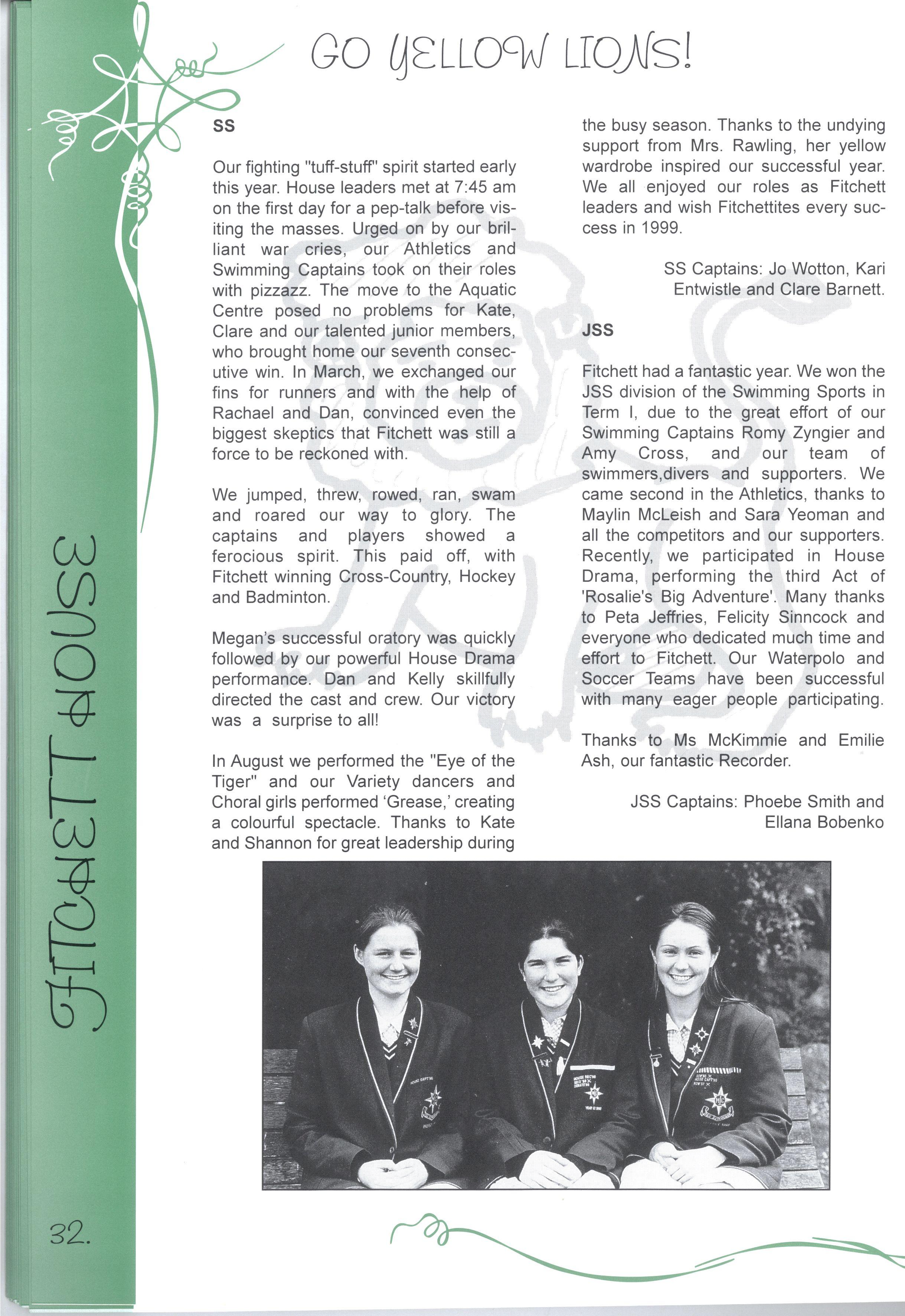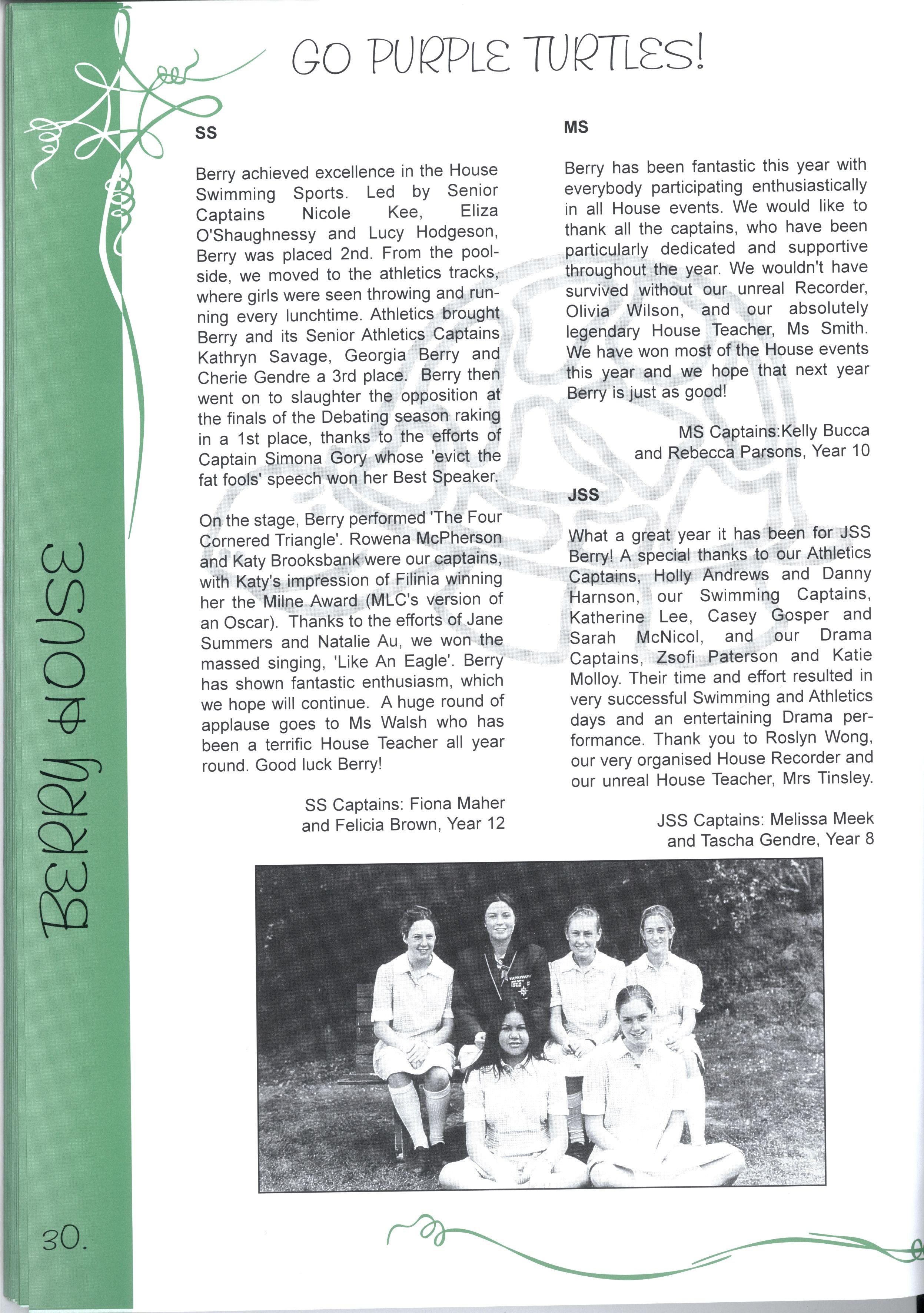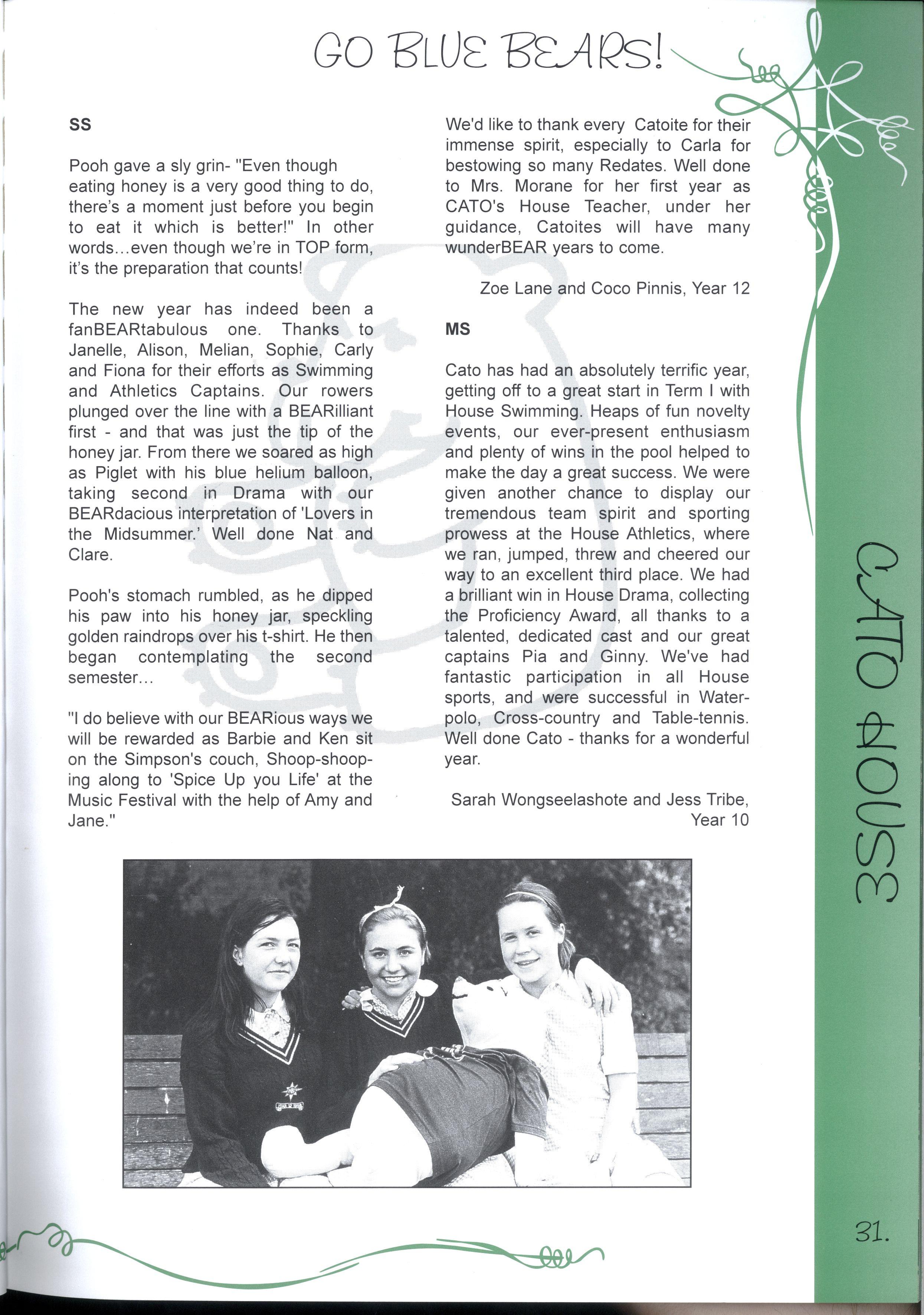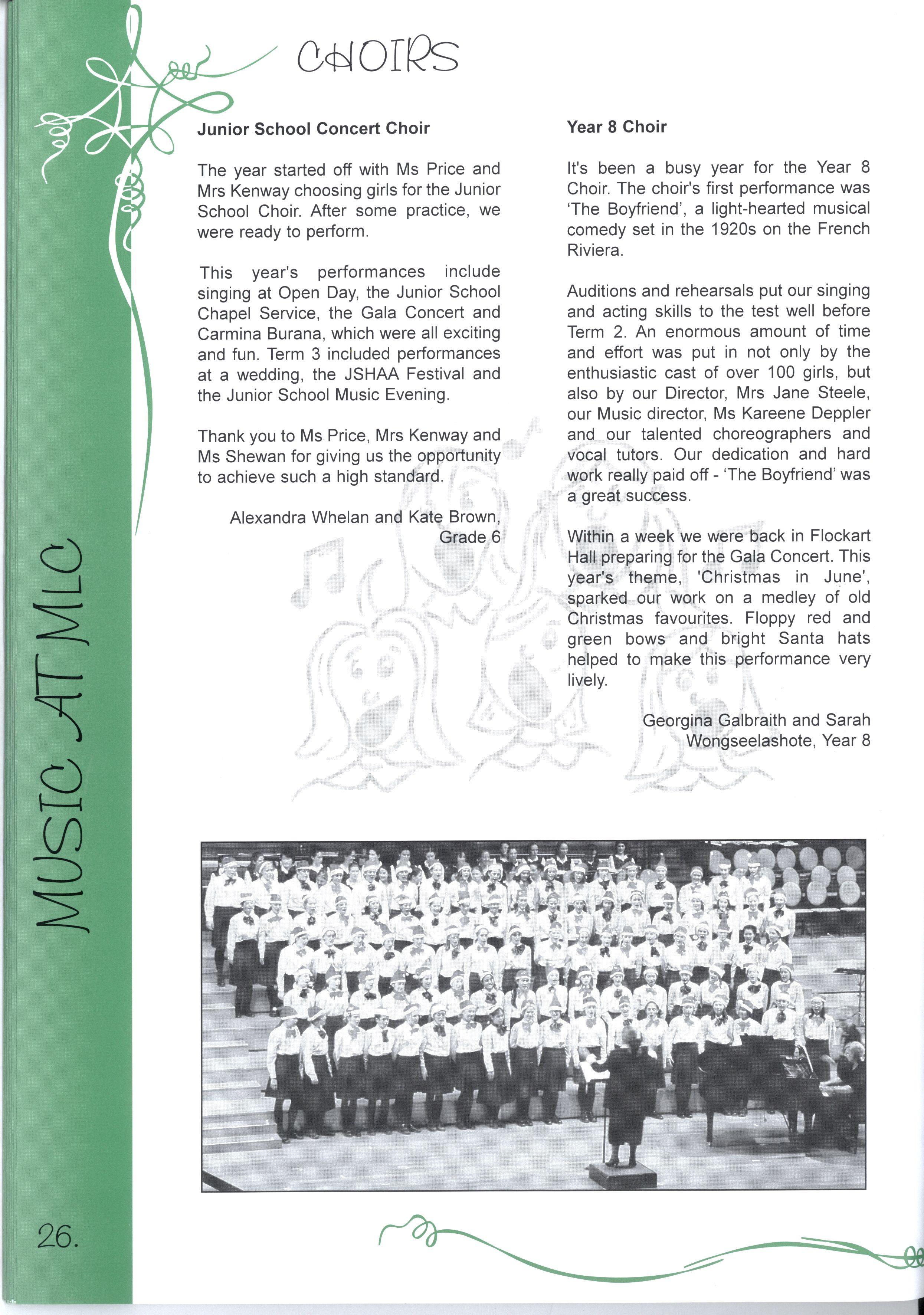 The Editorial Team has worked extremely hard to successfully complete this project We are particularly grateful to the Layout Team who gave up the first week of their September holidays, while Jenny and Nadia did a wonderful job with all the photography The Maintenance Team was, as usual, a great help in organising important things like ladders! Our committee of Olivia Heaton, Eliza Lockhart, Thaya Kotoridis, Sally Stead, Sophie Breheny (Grade 3), Gillian Phillips, Lauren Donozzan (Grade 4), Fiona Doig, Michell Li, Alex Murphy (Grade 5), Sophia Tsiligiannis, Whitney Campbell and Sarah Robson (Grade 6), supported by Mrs Harrison and Miss Robinson were invaluable representatives from Junior School Thank you to our JSS reporters, Yvonne Chow, Laura DAIessandri and Sarah Wongaleeshote, and our MS reporters, Hilary Peterson and Henrietta Jones, who did a brilliant job on their 'assignments.'
